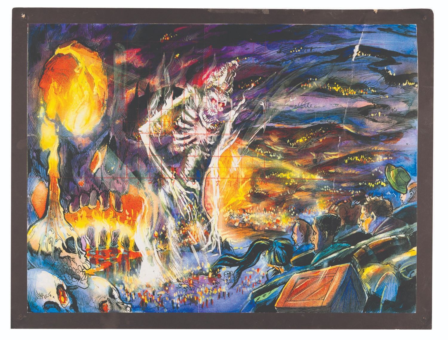 (Disneyland, 1995) A production-used print of concept art of the spirit of Mara confronting a ride vehicle in the Indiana Jones Adventure. Mounted to art board, this print was most likely used for internal presentations. Measuring 12" x 17" on 14" x 18.5" art board, the print displays in good condition with edge wear and creases, pinholes, a 0.5" area of paper loss, and a numbered grid in the top half hand-drawn in red grease pencil.