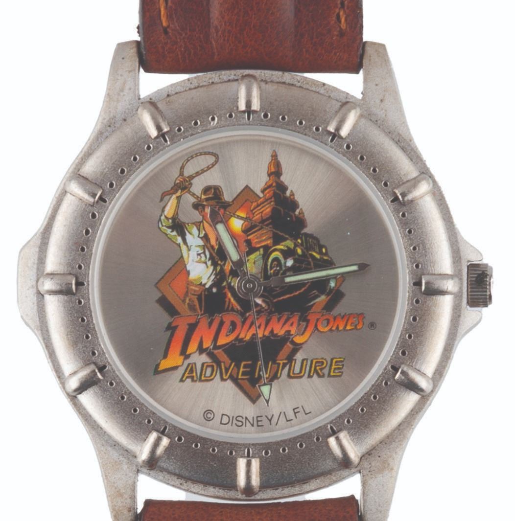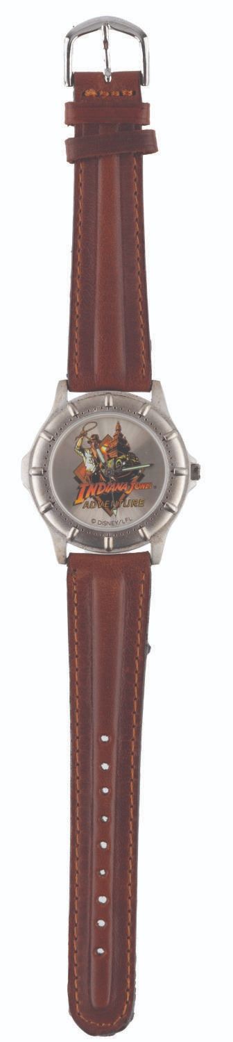 (Valdwin, 1995) An original Indiana Jones Adventure wristwatch with a face featuring artwork inspired by the attraction poster. Measuring 9” in length, the watch is in fine, untested condition, likely requiring a new battery or service for function. The watch comes with the original felt sleeve.