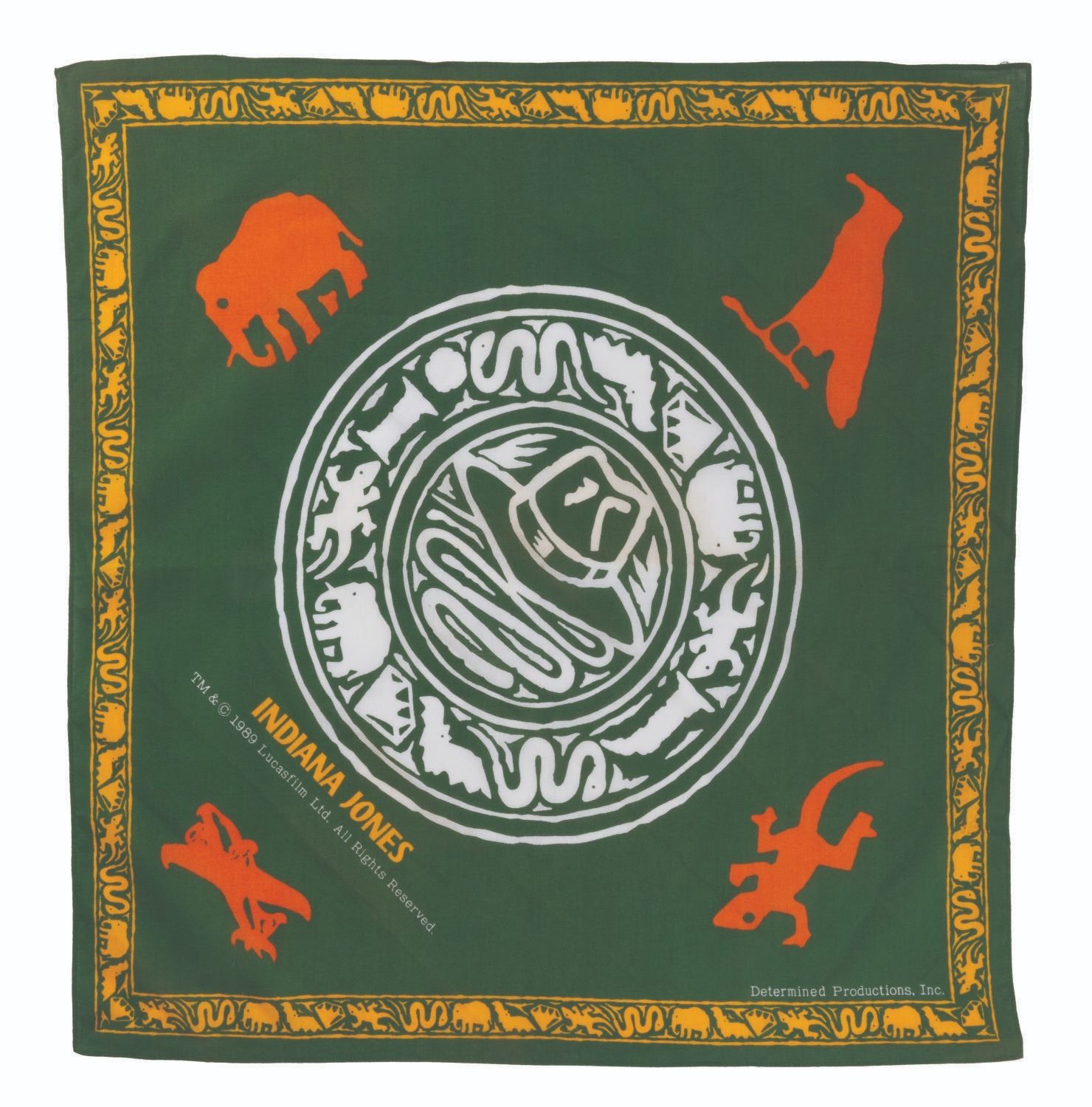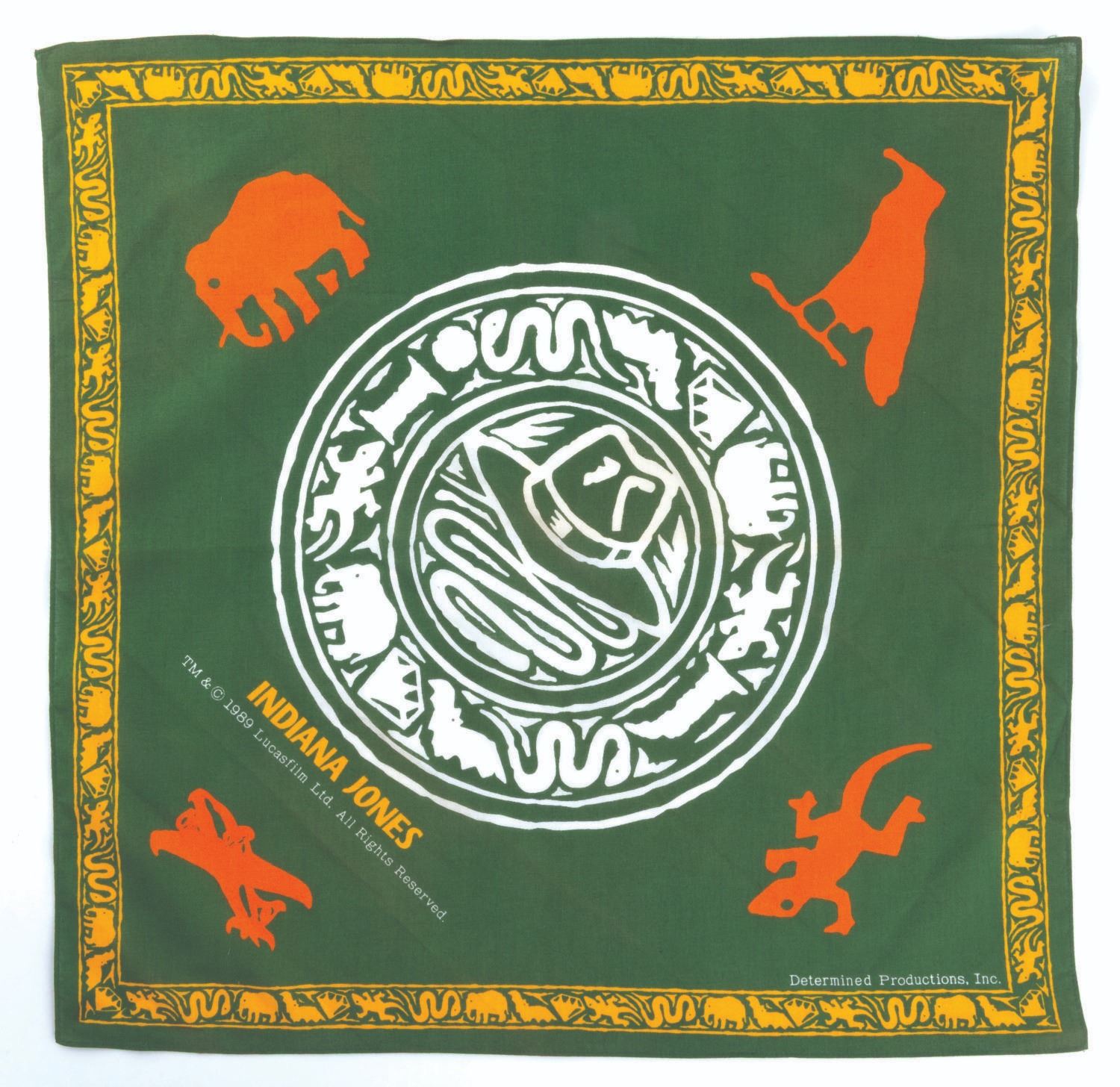 (Determined Productions, 1989) An exotic animal-themed Indiana Jones bandana manufacted by Determined Productions Inc. Measuring 20” x 20”, the bandana is in fine condition.