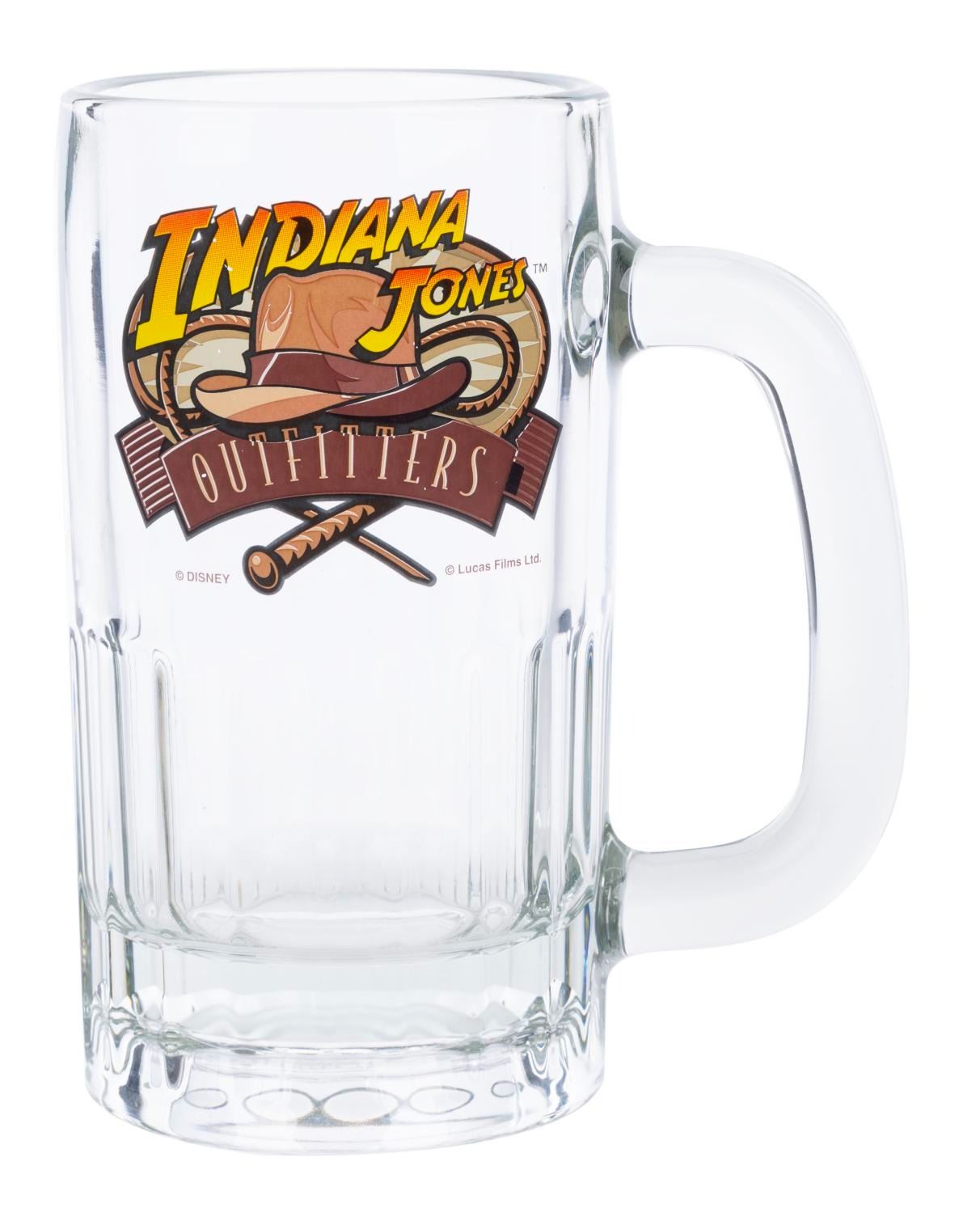 (Disneyland, 1990s) A souvenir mug from the Indiana Jones Outfitters shop near Indiana Jones Adventure at Disneyland. Measuring 5.75" tall and 4.75" in diameter, this glass mug is in fine condition.