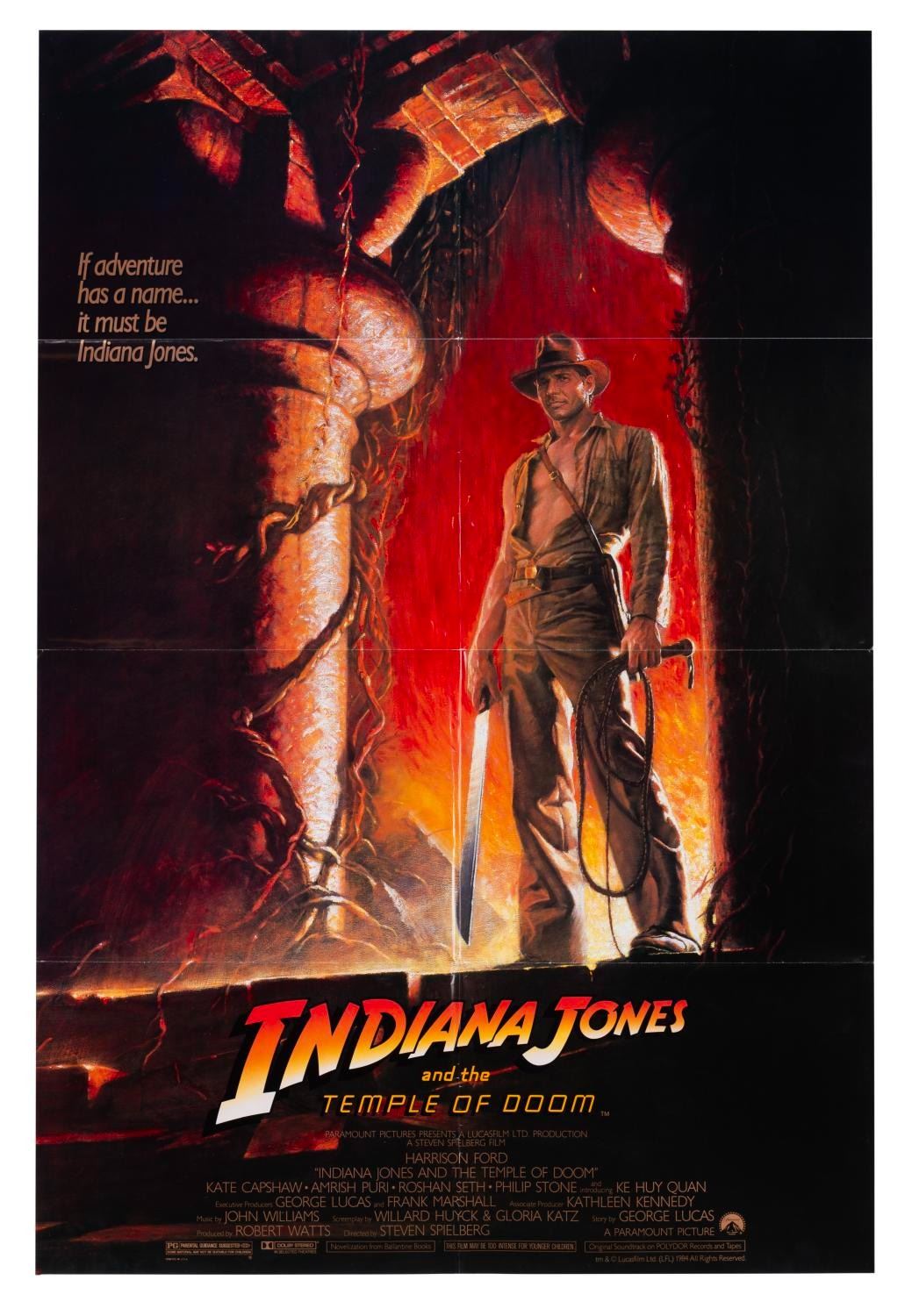 (Paramount, 1984) A one-sheet poster for "Indiana Jones and the Temple of Doom" with artwork by Bruce Wolfe. Measuring 27" x 40", the poster displays in very good condition, with light wear along the original folds, including very slight separation at the center points.