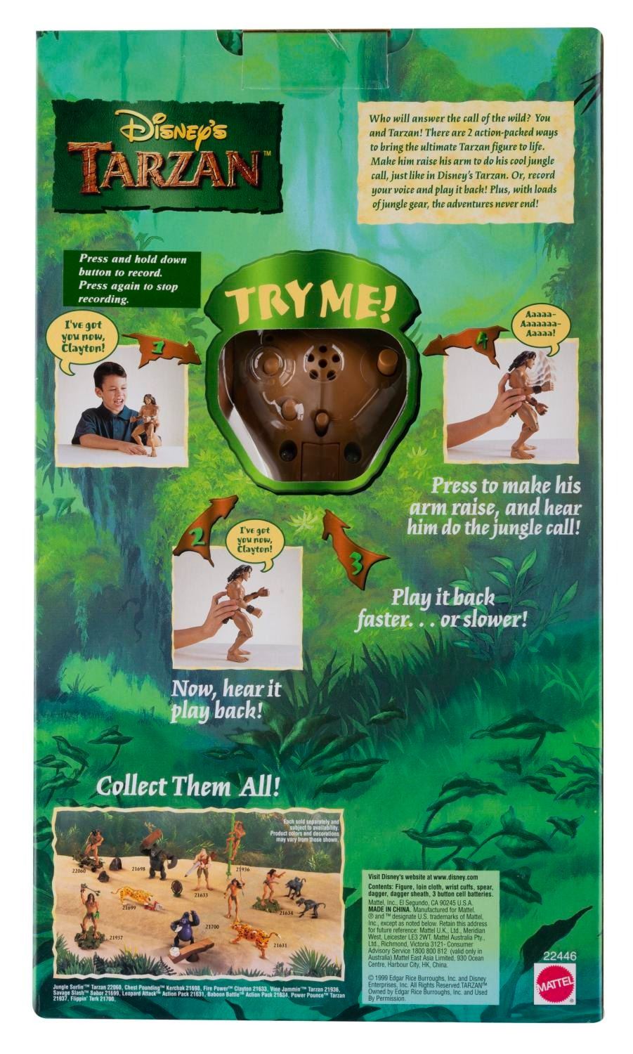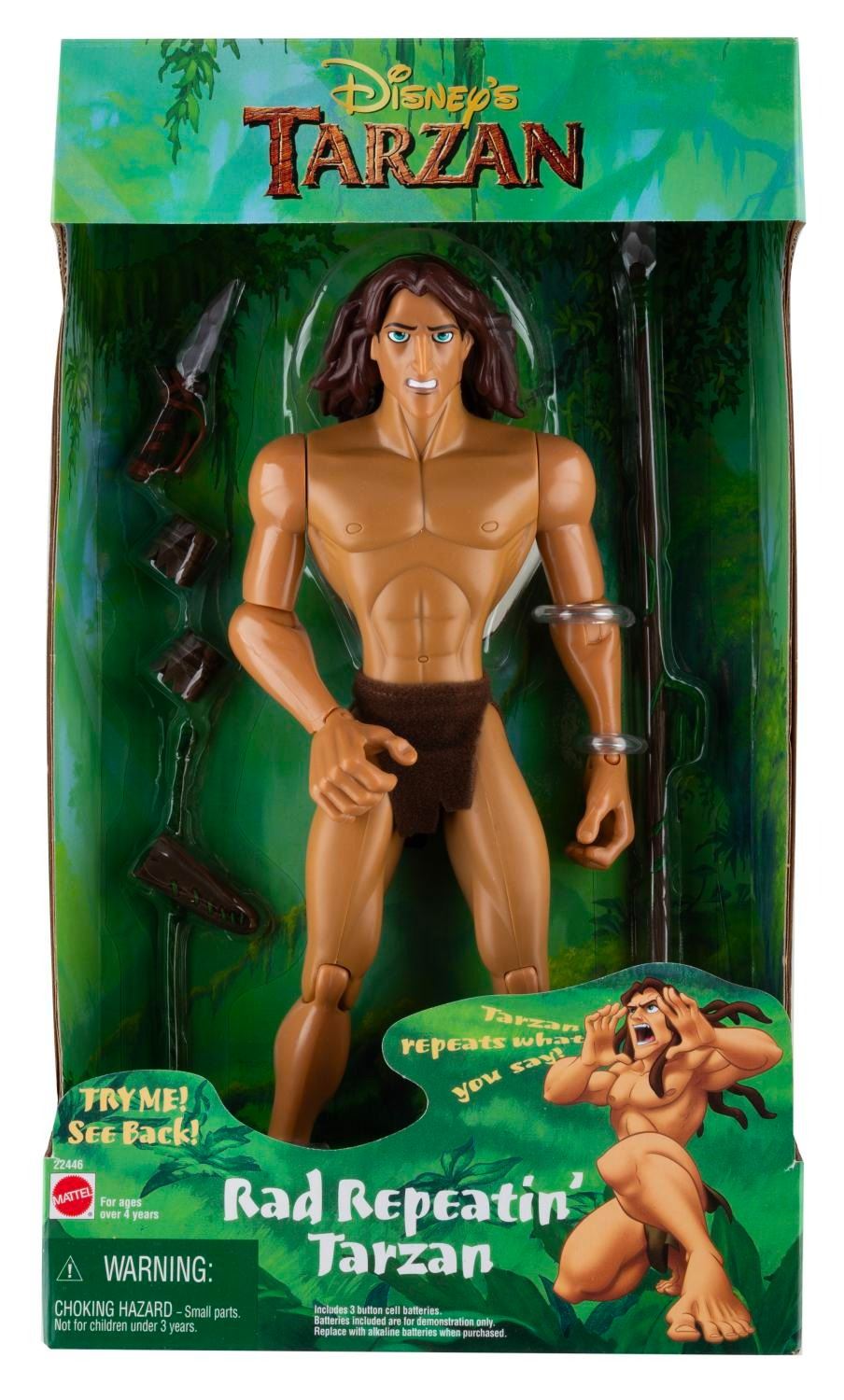(Mattel, 1999) A "Tarzan" Rad Repeatin' Tarzan action figure in its original packaging. The figure can record your voice and play it back, but the original demo batteries no longer work, so the function can’t be tested. Standing 11.5" tall, the figure is in fine condition.