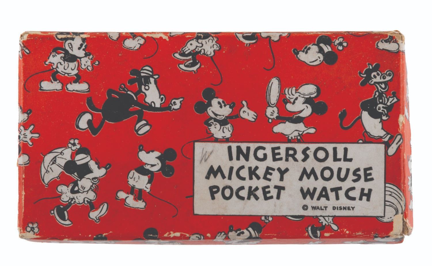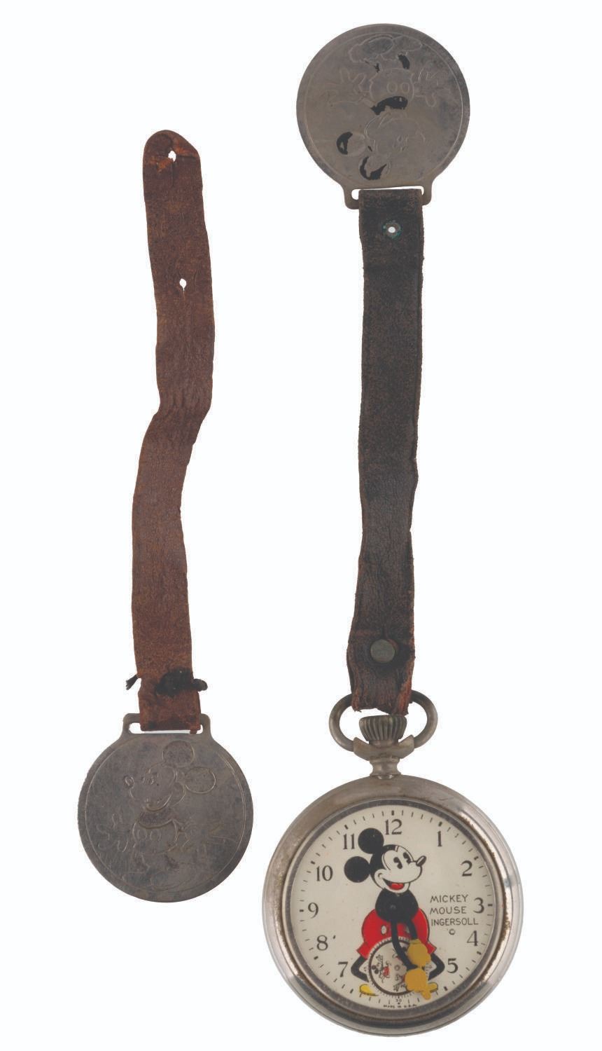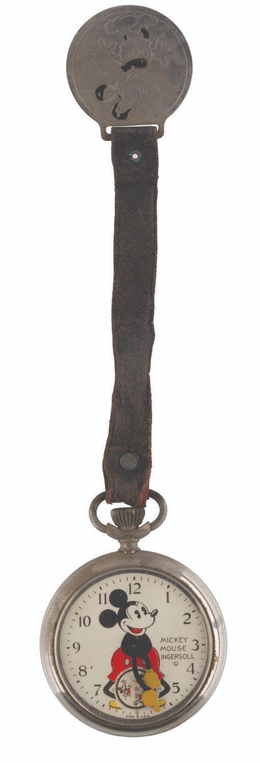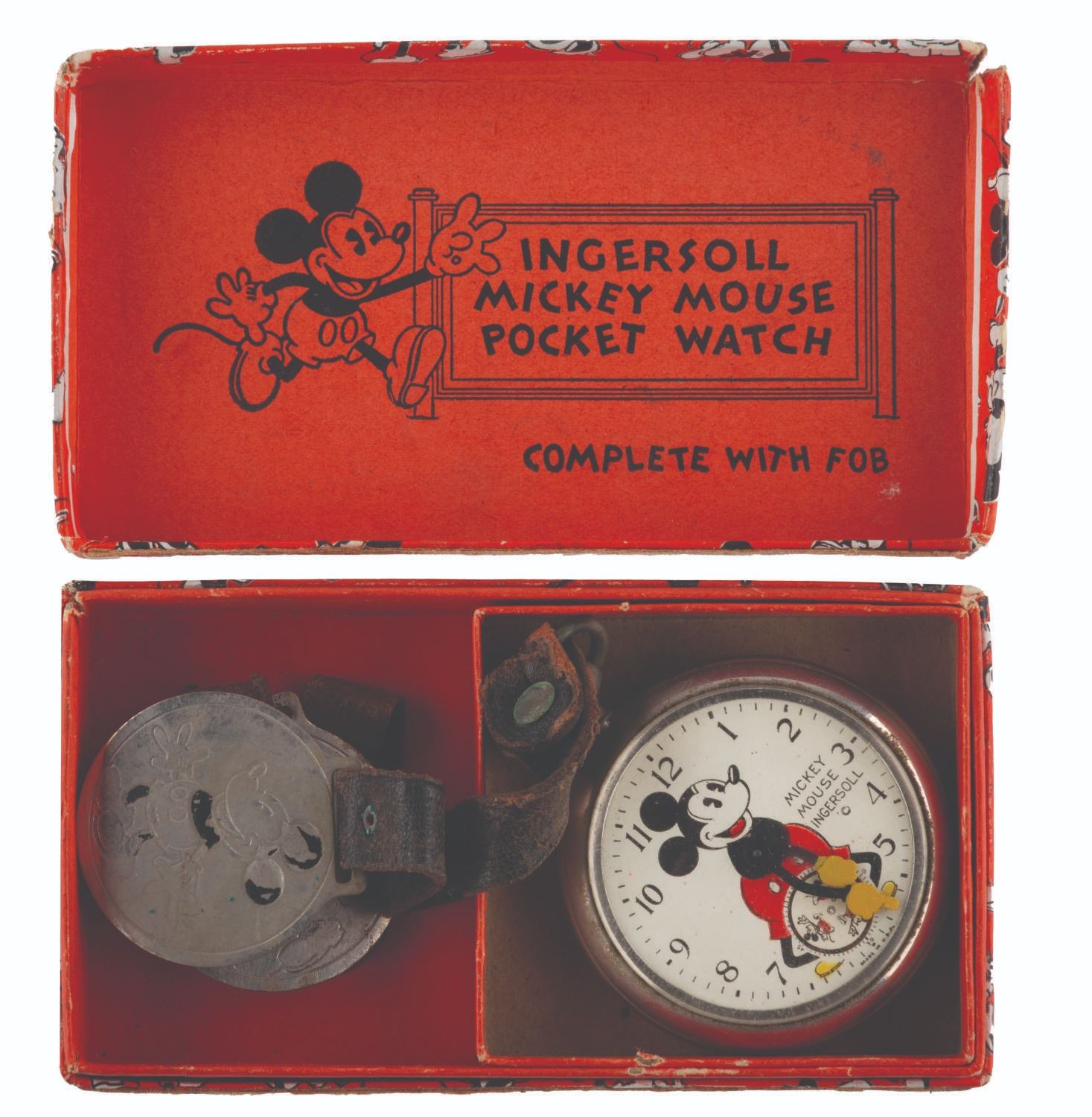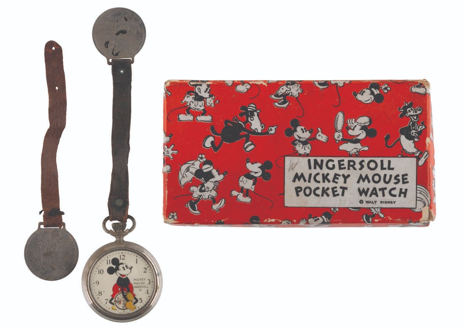 121. An Ingersoll Mickey Mouse Pocket Watch with Fobs. (Ingersoll, 1934) A rare early Ingersoll Mickey Mouse pocket watch with the original box, strap, and fob featuring a Mickey engraving, as well as an additional fob with strap. The watch did not work when tested, likely requiring repair to function properly. Measuring 2" in diameter and 7" long, including the fob, the watch is in fair condition with oxidation from age, discoloration, scratches, wear, paint loss, and large cracks in the crystal, not visible in the catalog photo. The 2.5" x 4.75" x 1" tall box displays in good condition with scrapes, a pencil inscription, creases, and wear.