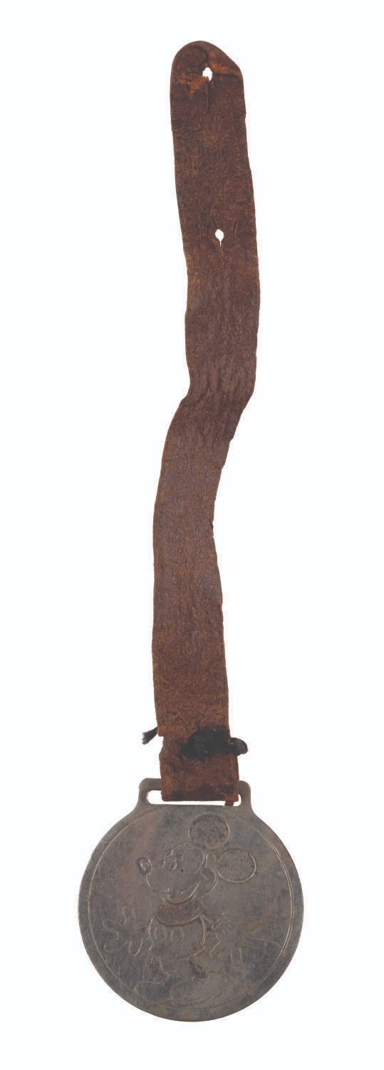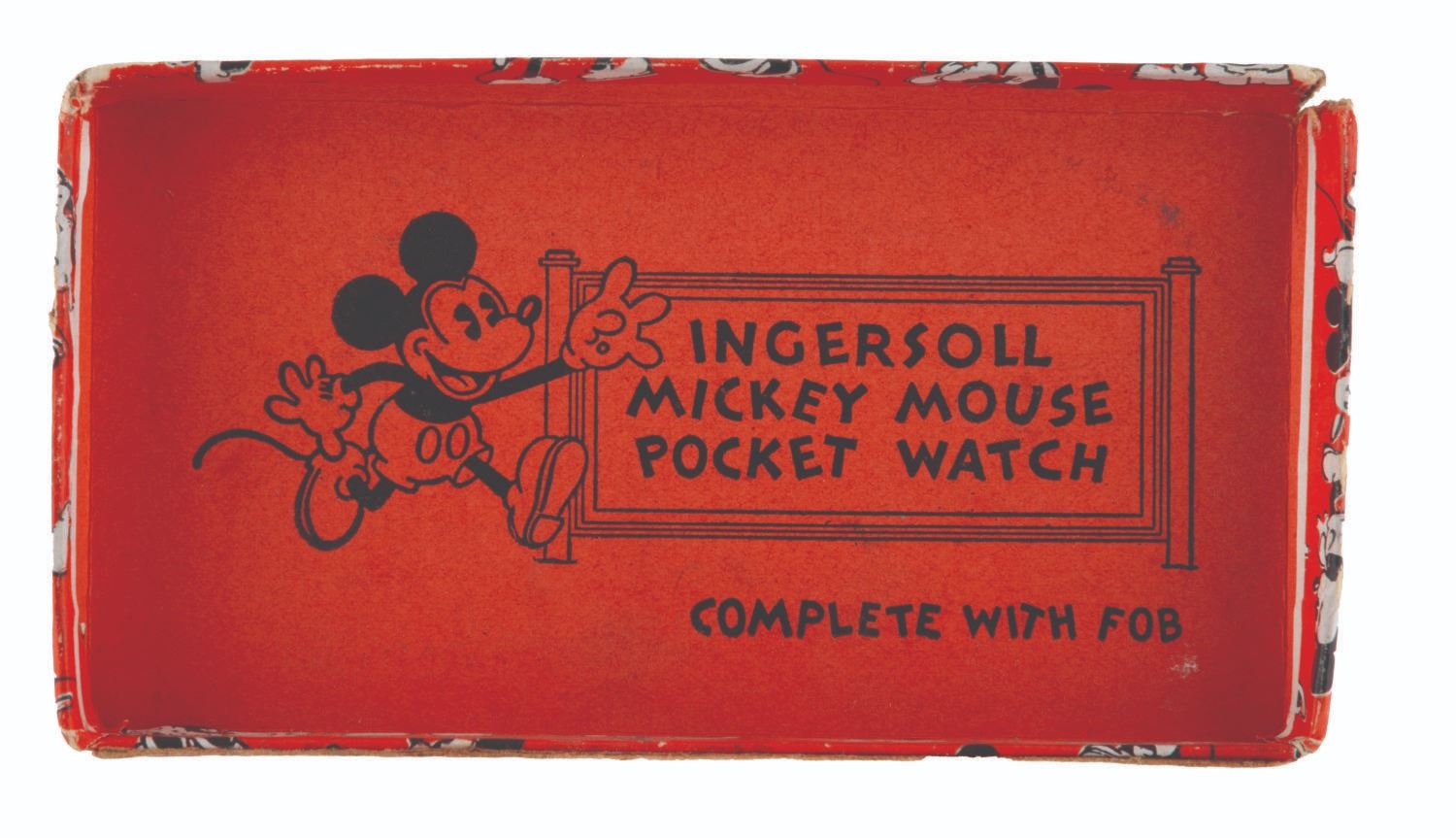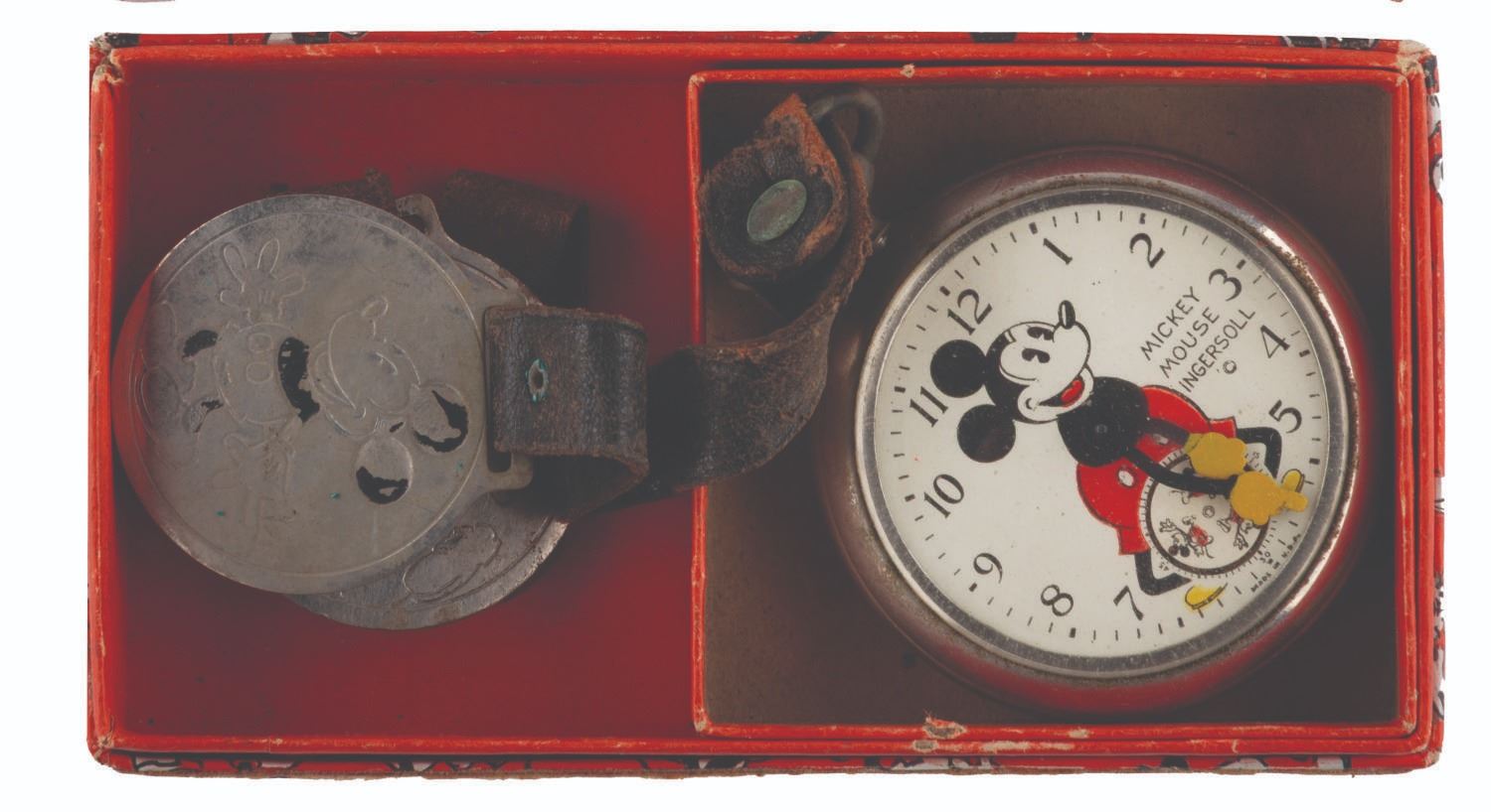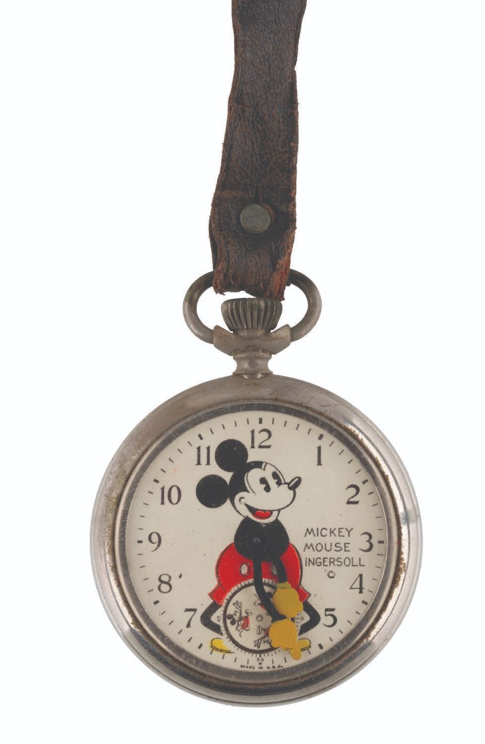 121. An Ingersoll Mickey Mouse Pocket Watch with Fobs. (Ingersoll, 1934) A rare early Ingersoll Mickey Mouse pocket watch with the original box, strap, and fob featuring a Mickey engraving, as well as an additional fob with strap. The watch did not work when tested, likely requiring repair to function properly. Measuring 2" in diameter and 7" long, including the fob, the watch is in fair condition with oxidation from age, discoloration, scratches, wear, paint loss, and large cracks in the crystal, not visible in the catalog photo. The 2.5" x 4.75" x 1" tall box displays in good condition with scrapes, a pencil inscription, creases, and wear.