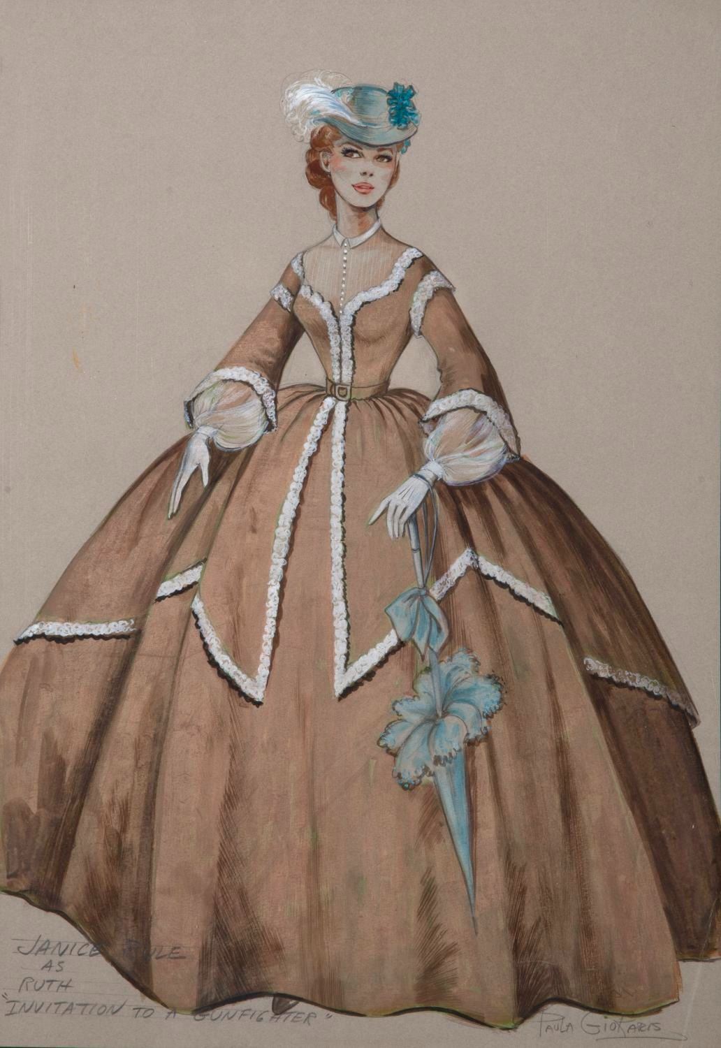(United Artists, 1964) A costume concept for Janice Rule as Ruth in"Invitation to a Gunfighter." The design was executed in gouache and pencil by Costume Designer Paula Giokaris, who signed the concept in the lower right corner. Executed in gouache and pencil, the concept art measures 13"x19" and is in very good production-used condition.