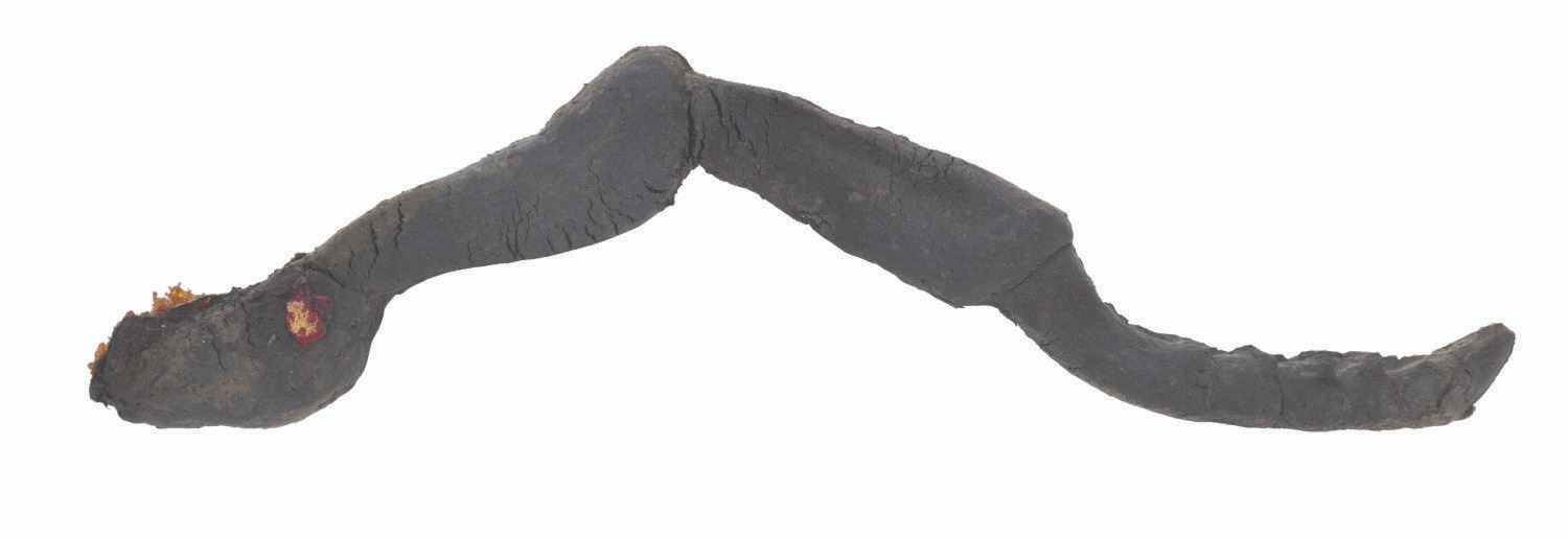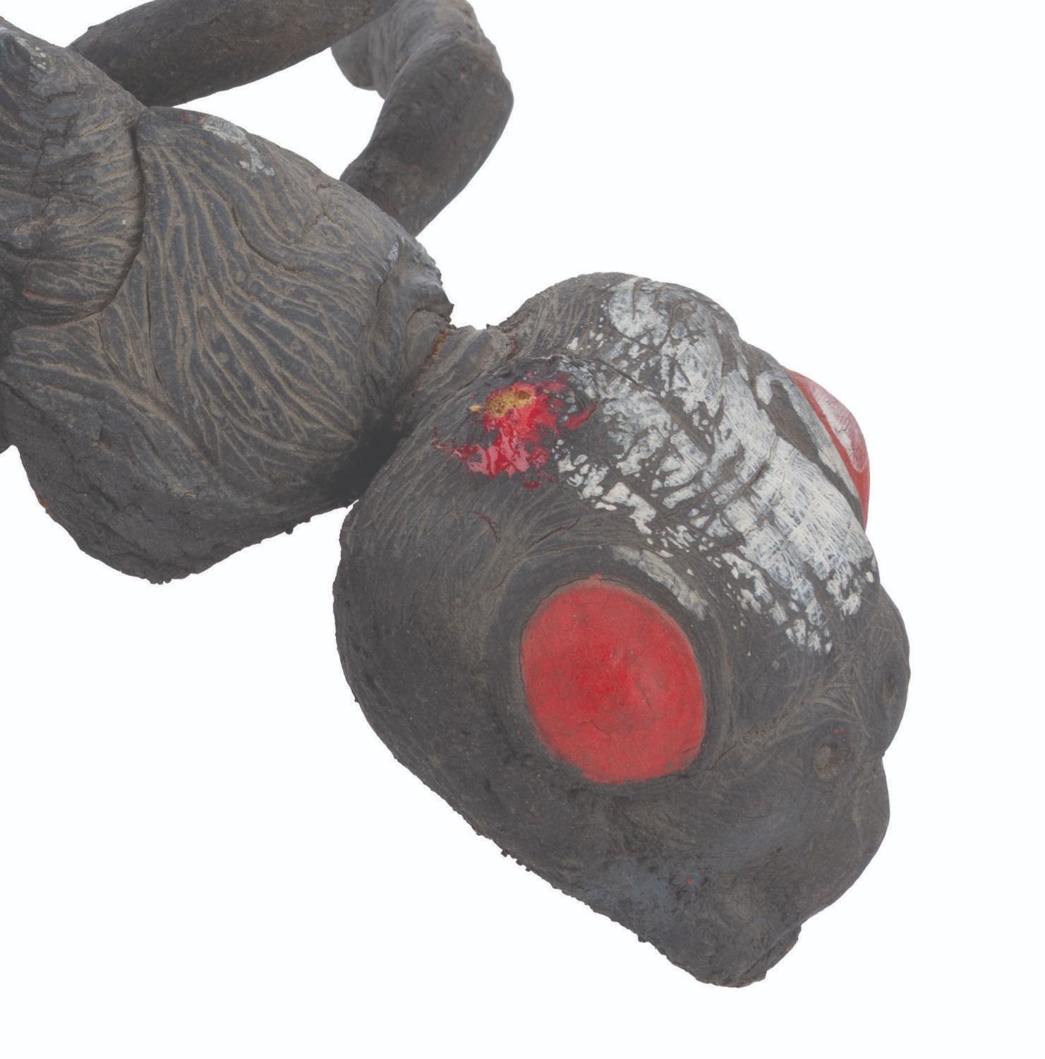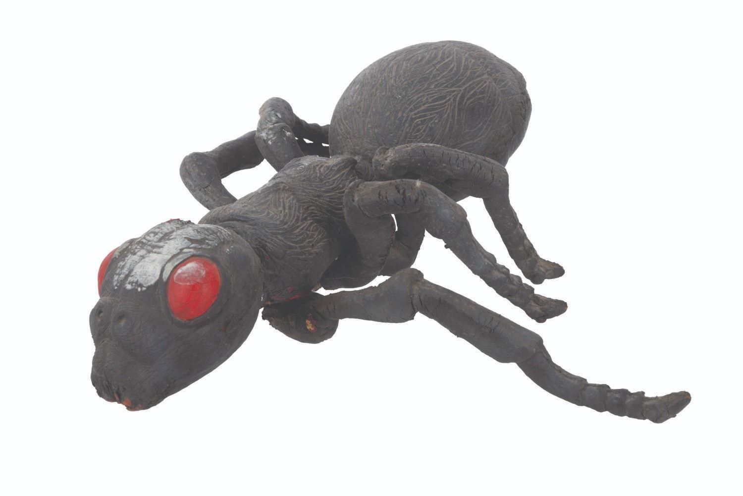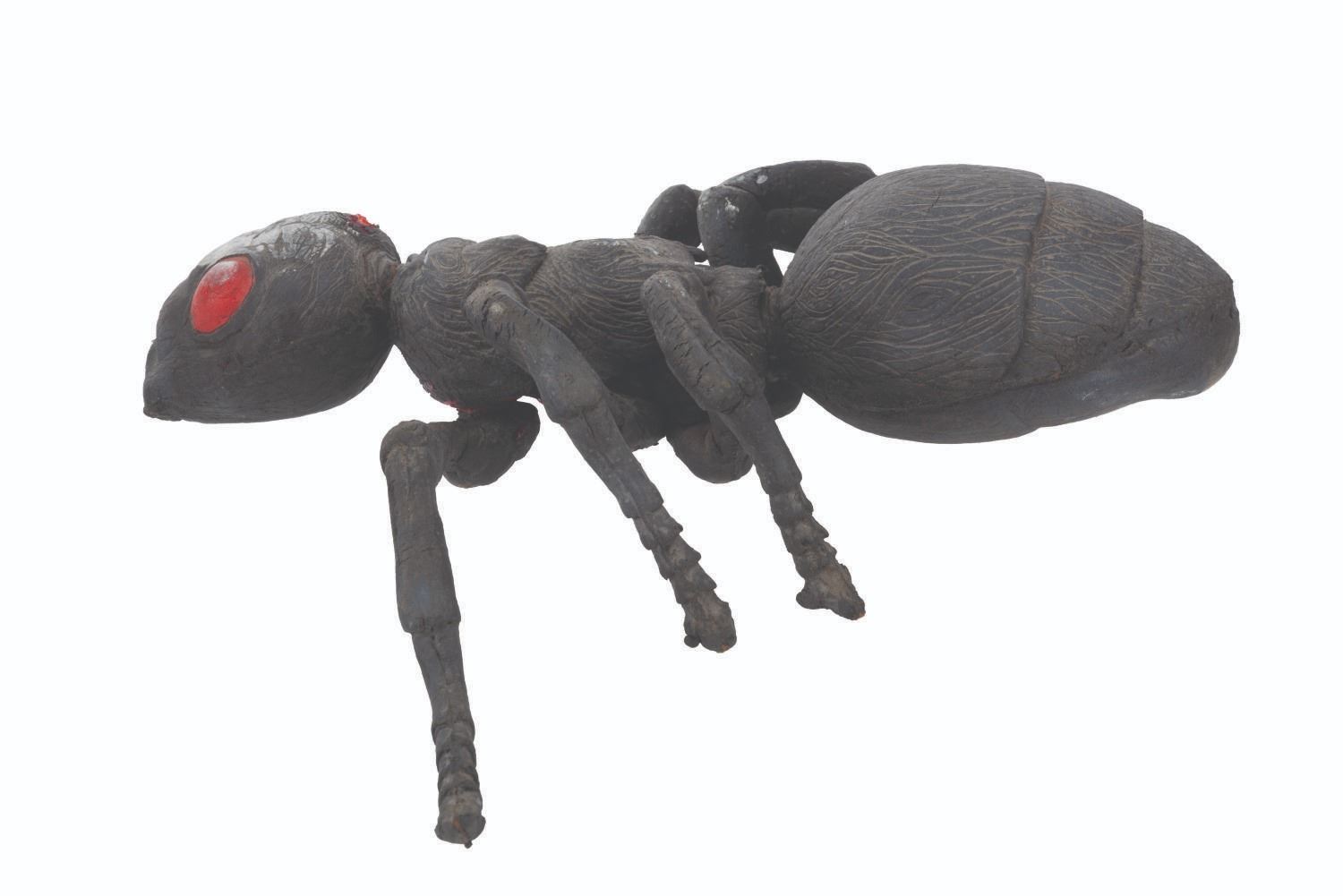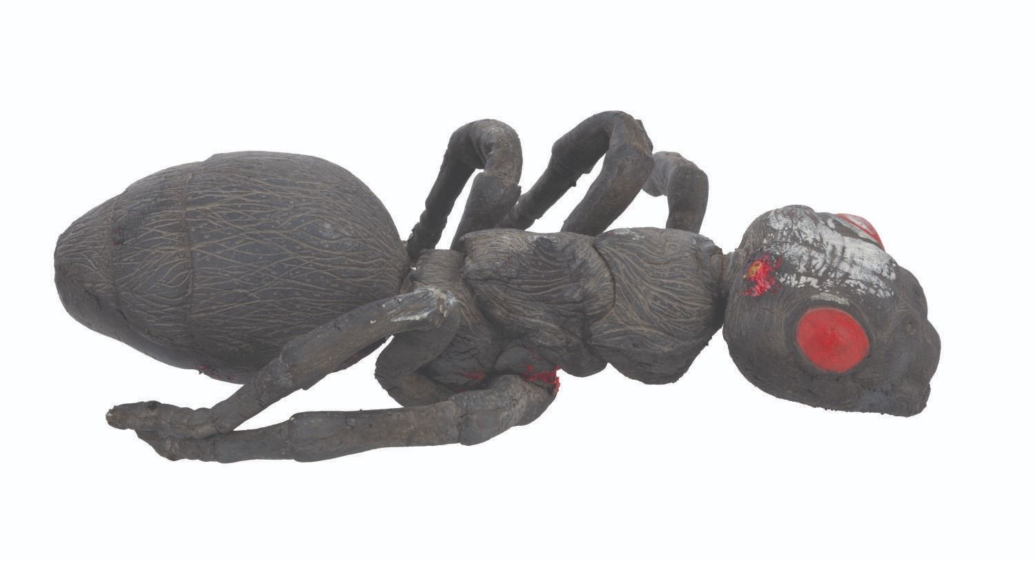 (Cinemaware, 1991) An original ant puppet from the TurboGrafx-CD release of the video game It Came From the Desert. The game featured live-action cut scenes with actors and creature effects by the Chiodo Brothers. Measuring 11.5" 7.5" x 3.5" tall, the foam ant puppet is in fair condition with scratches, cracks, stains, paint loss, discoloration from age, one leg detached, and missing a leg, mandibles, and antennae.