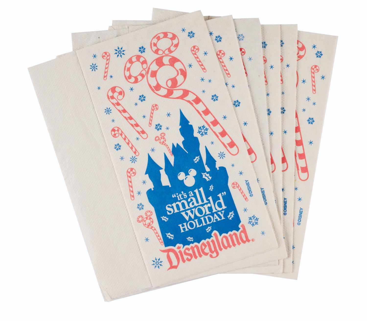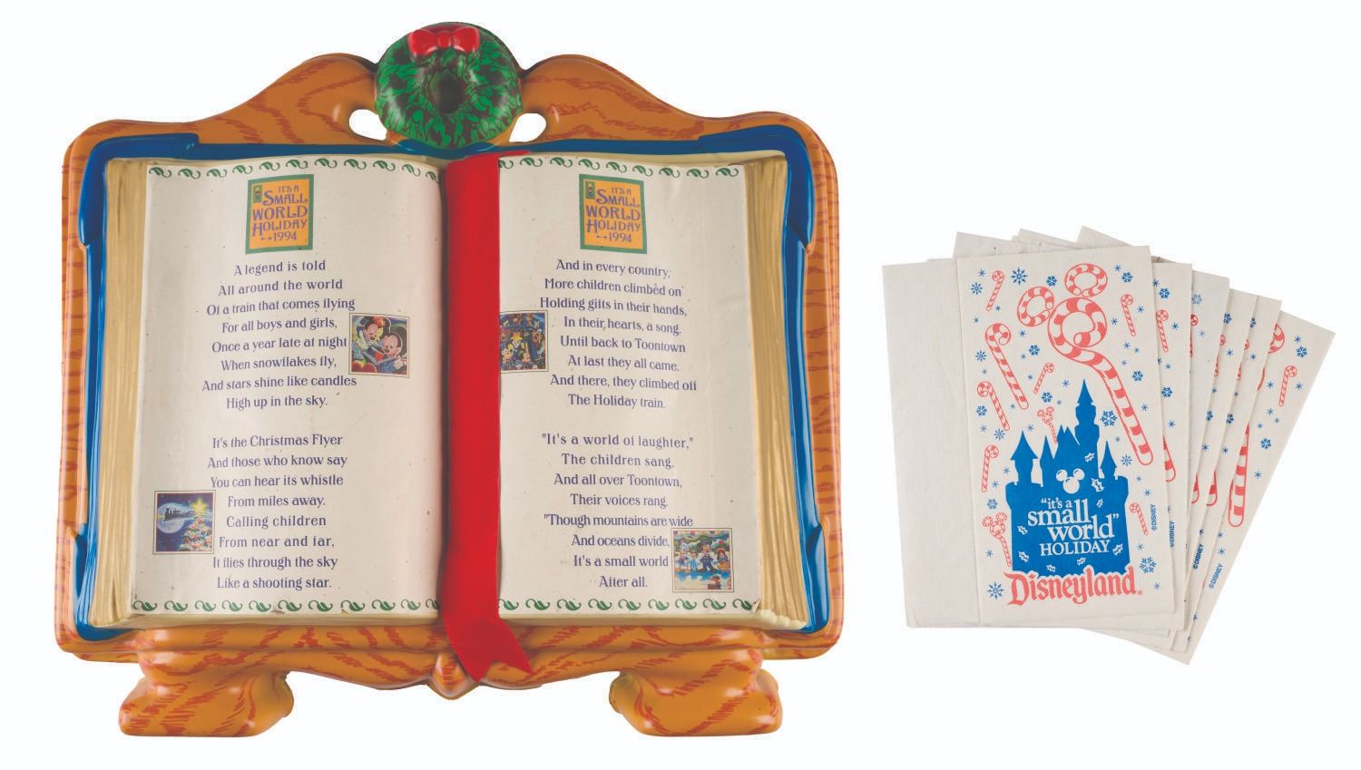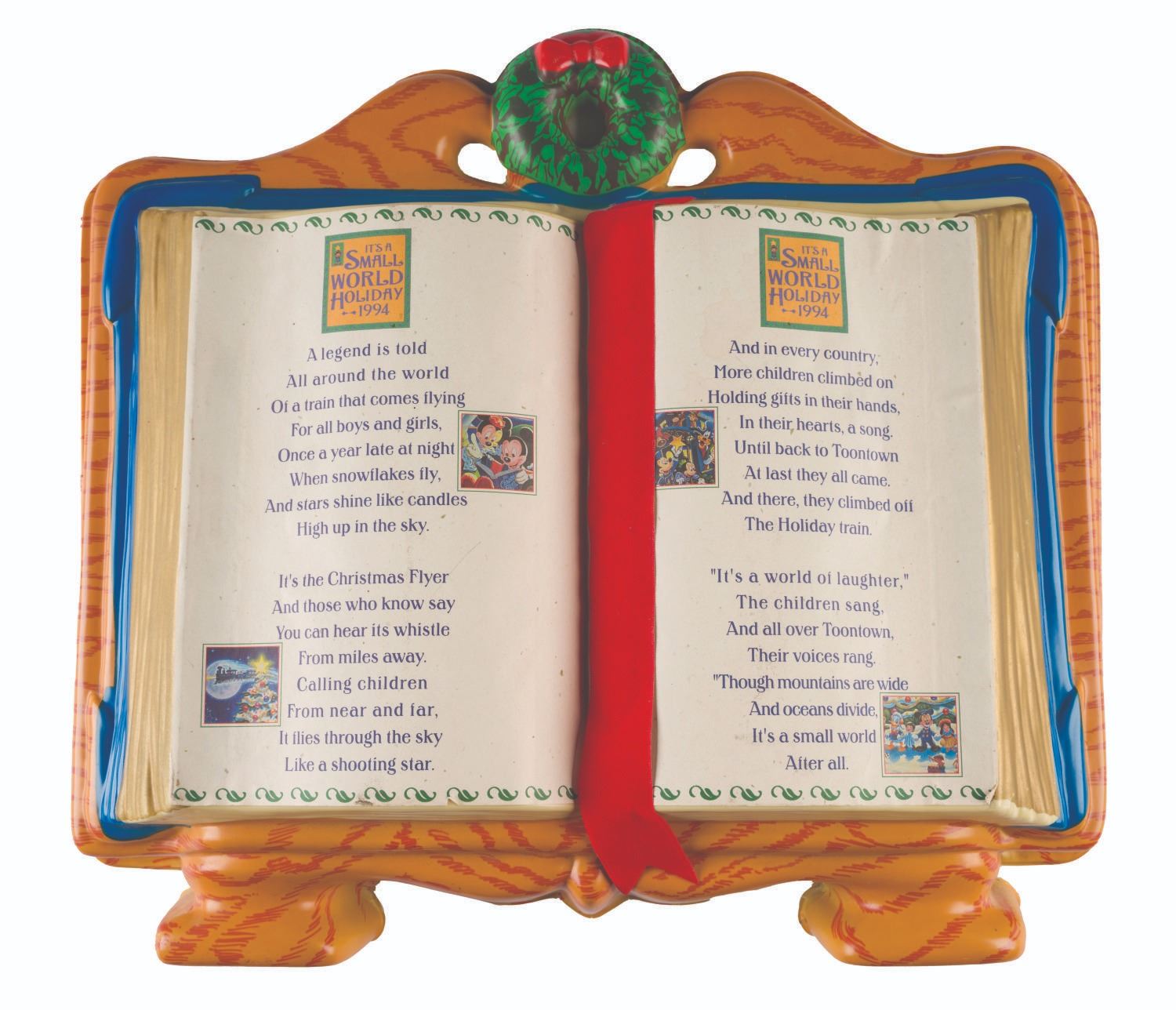 (Disneyland, 1994) A Disneyland It's A Small World Holiday Window Display. This vacuum-formed plastic display is in the style of a wreath-accented, winter season storybook and features a holiday-inspired story on paper faux-leaves related to It's A Small World and Mickey's Toontown. As a bonus, this lot is accompanied by several napkins with the festive Disneyland "It's A Small World Holiday" logo graphic on them. Measuring 18.5"x16" and 4.5" deep, this mixed-media display piece is in very good condition with minor scuffs, wear from handling.