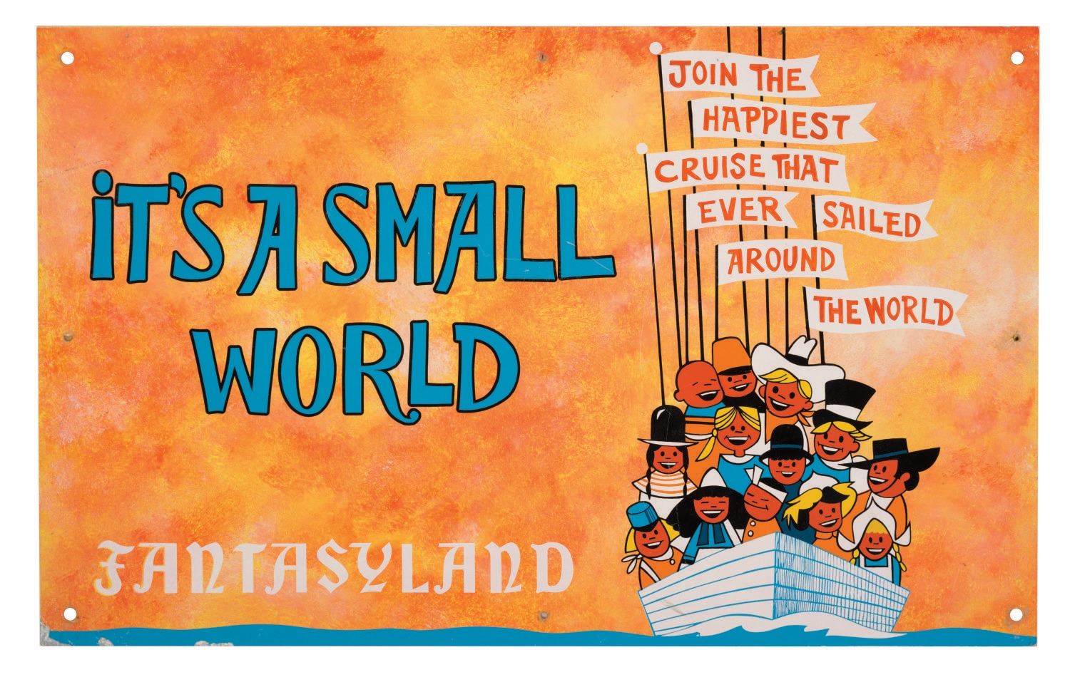(Disneyland/Walt Disney World, 1980s) An It's A Small World Omnibus Sign for the Omnibus at Disneyland and Walt Disney World. The sign was crafted by the Disneyland Staff Shop for mounting on the vehicles and features imagery depicting the Children of the World embarking on "the Happiest Cruise that ever sailed around the world." The rear of the sign retains hand-annotated production notes related to sizes and colors. Measuring 25.25"x15.5", the metallic sign is in good condition with mild fading, scuffs, scratches, oxidation, and wear to painted areas from Park use and age. This is the only It's A Small World Omnibus Sign we have seen.