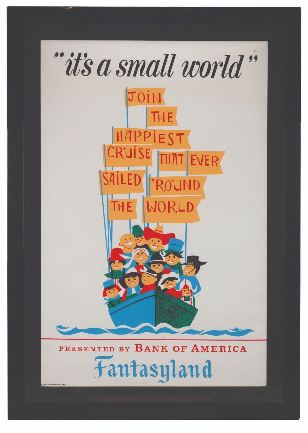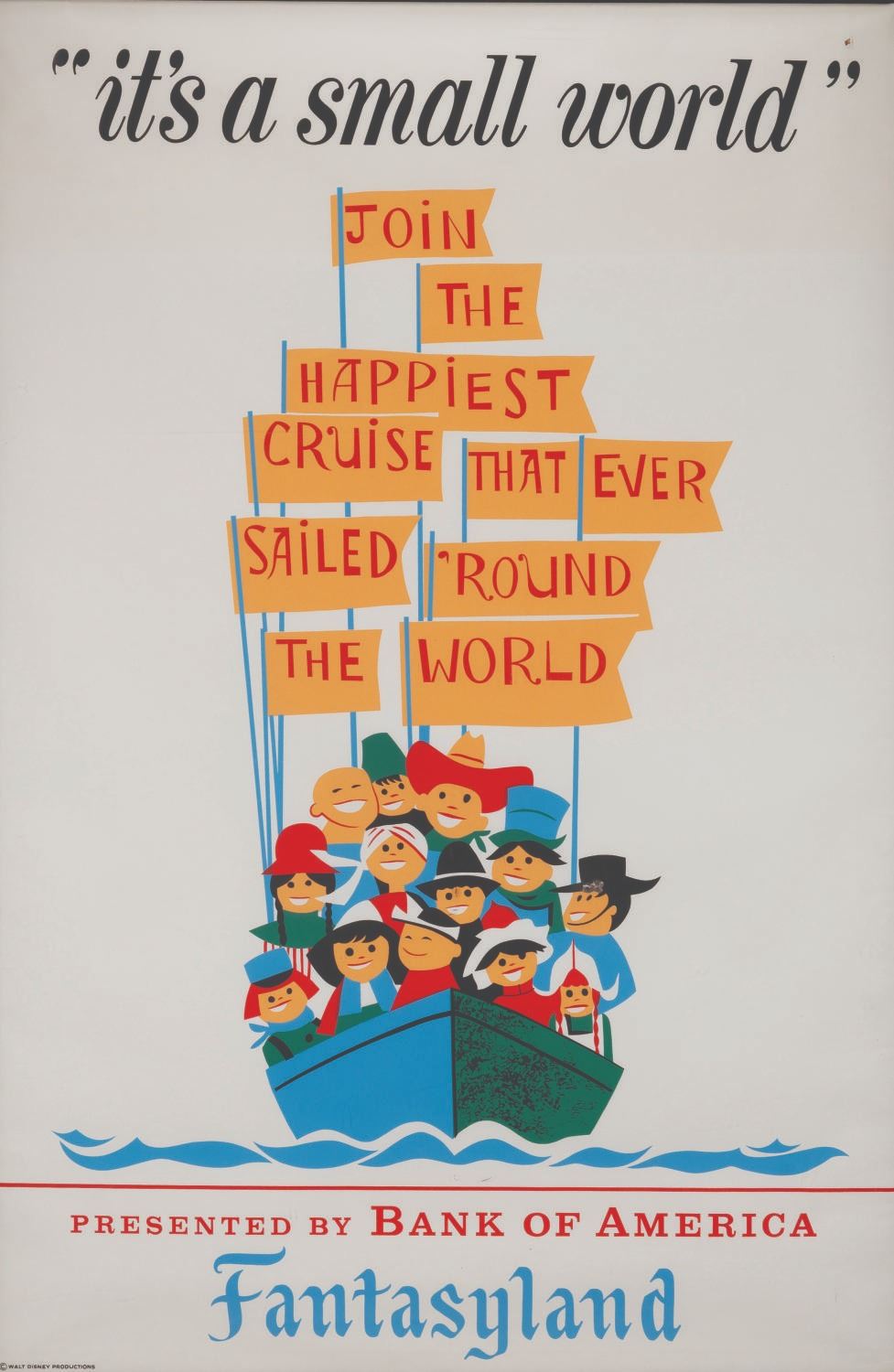 (Disneyland, 1966) An original attraction poster for It's a Small World in Fantasyland. Designed by Paul Hartley, this poster features the name of the sponsor, Bank of America, and features the Children of the World preparing to embark on "the happiest cruise that ever sailed ’round the world." Measuring 36" x 54", the poster displays in good condition with light wear, including small creases mainly along the right edge, and a 0.25" hole in the upper right corner.