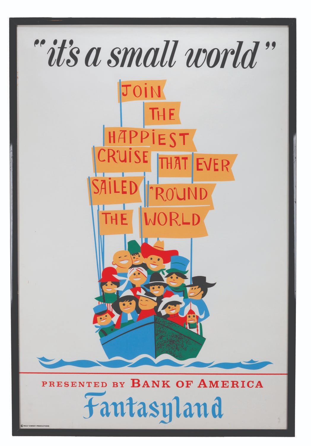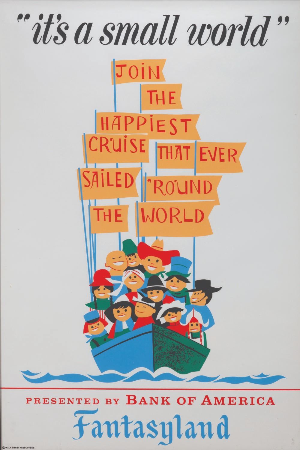 (Disneyland, 1966) An original attraction poster for It's a Small World in Fantasyland. Designed by Paul Hartley, this poster features the name of Participant Sponsor, Bank of America, and features the Children of the World preparing to embark on"the happiest cruise that ever sailed ’round the world." Measuring 36" x 54", the poster displays in fine condition with very minor creases and light discoloration at the top corner edges.