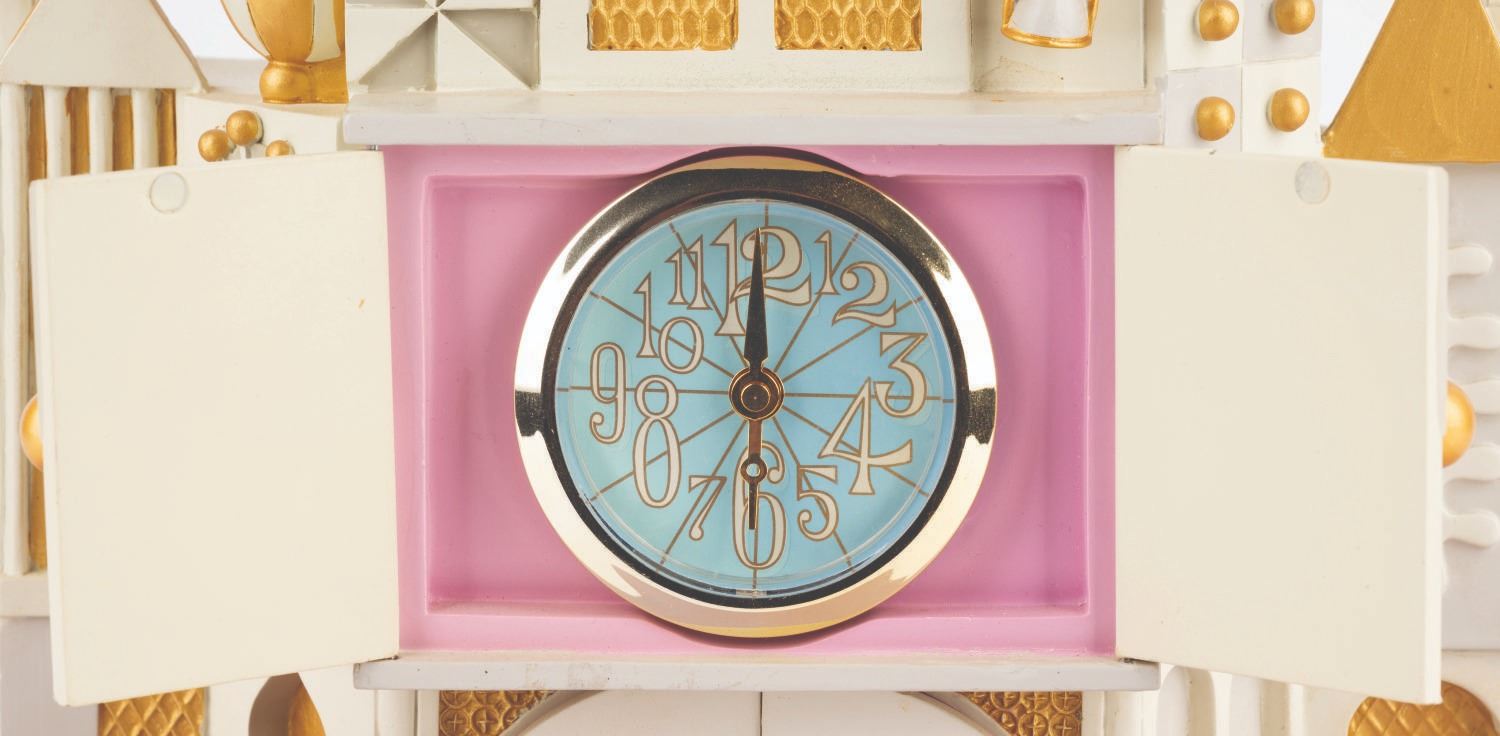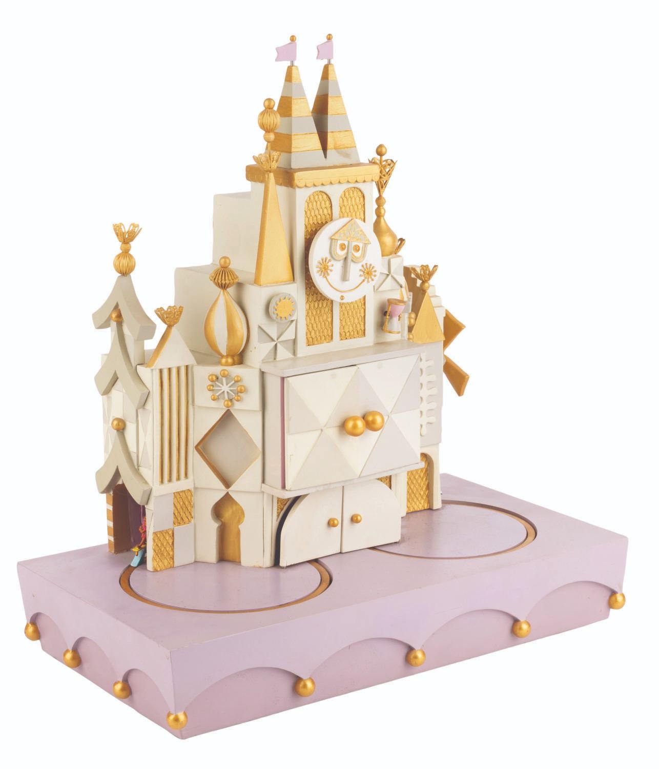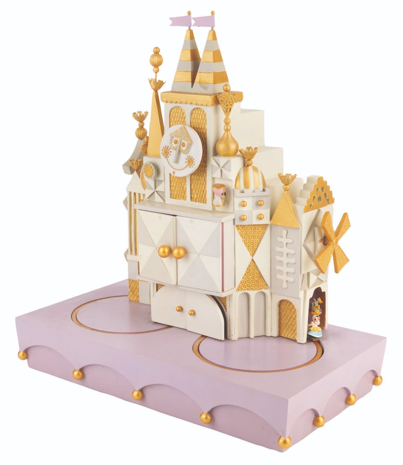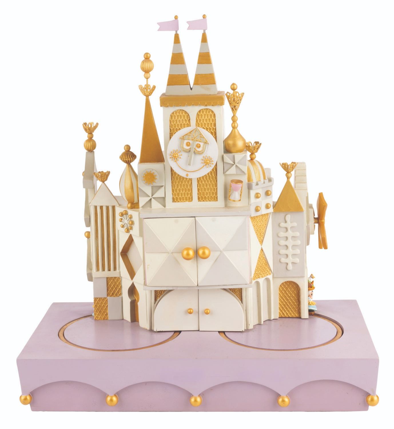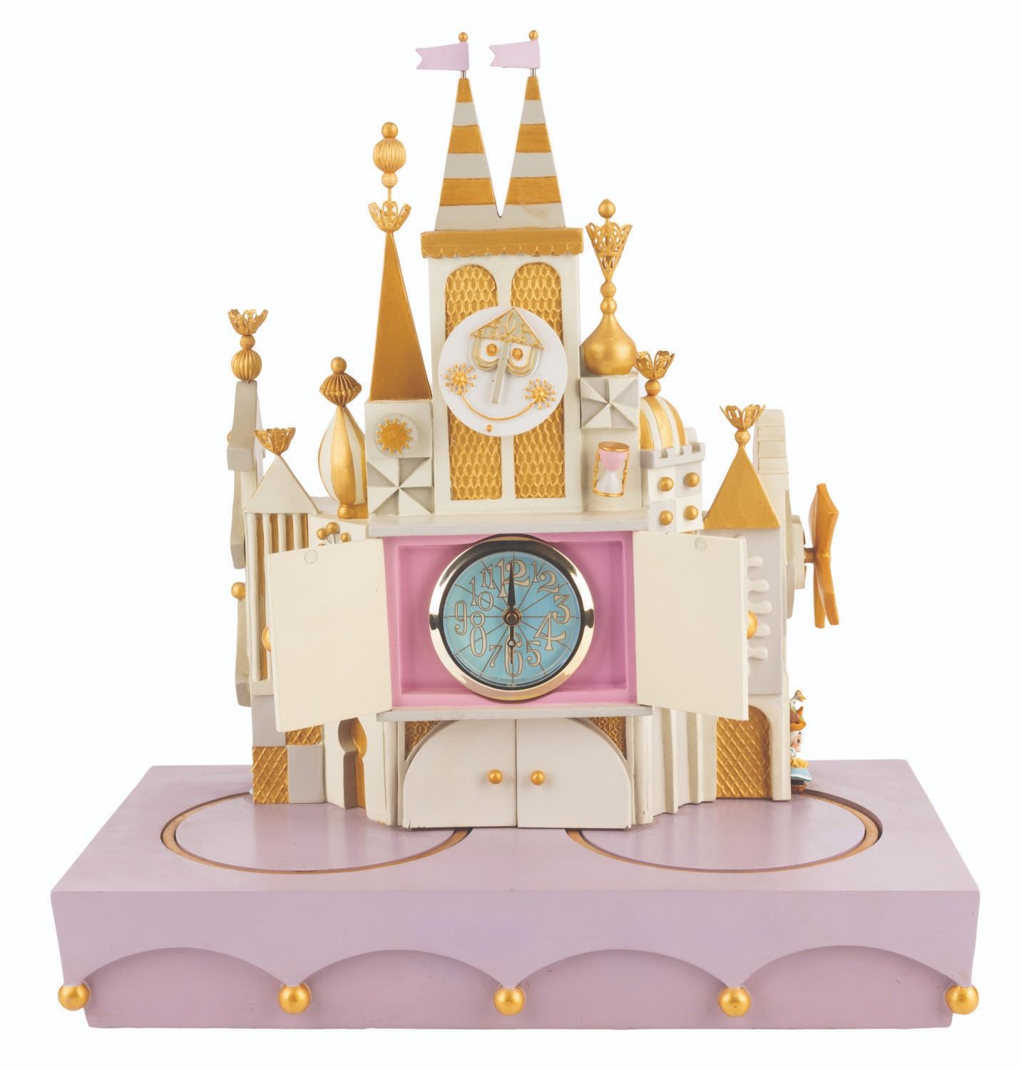 (Disneyland, 2005) An animated clock inspired by It’s a Small World featuring a propeller, face, hourglass, and children of the world. It was released as a limited edition of 1,500 for the 50th anniversary of Disneyland. This piece has been tested for function and is non-operational. Measuring 13.75"x12.5"x 6.5", the clock displays in good condition with scuffs and wear throughout.