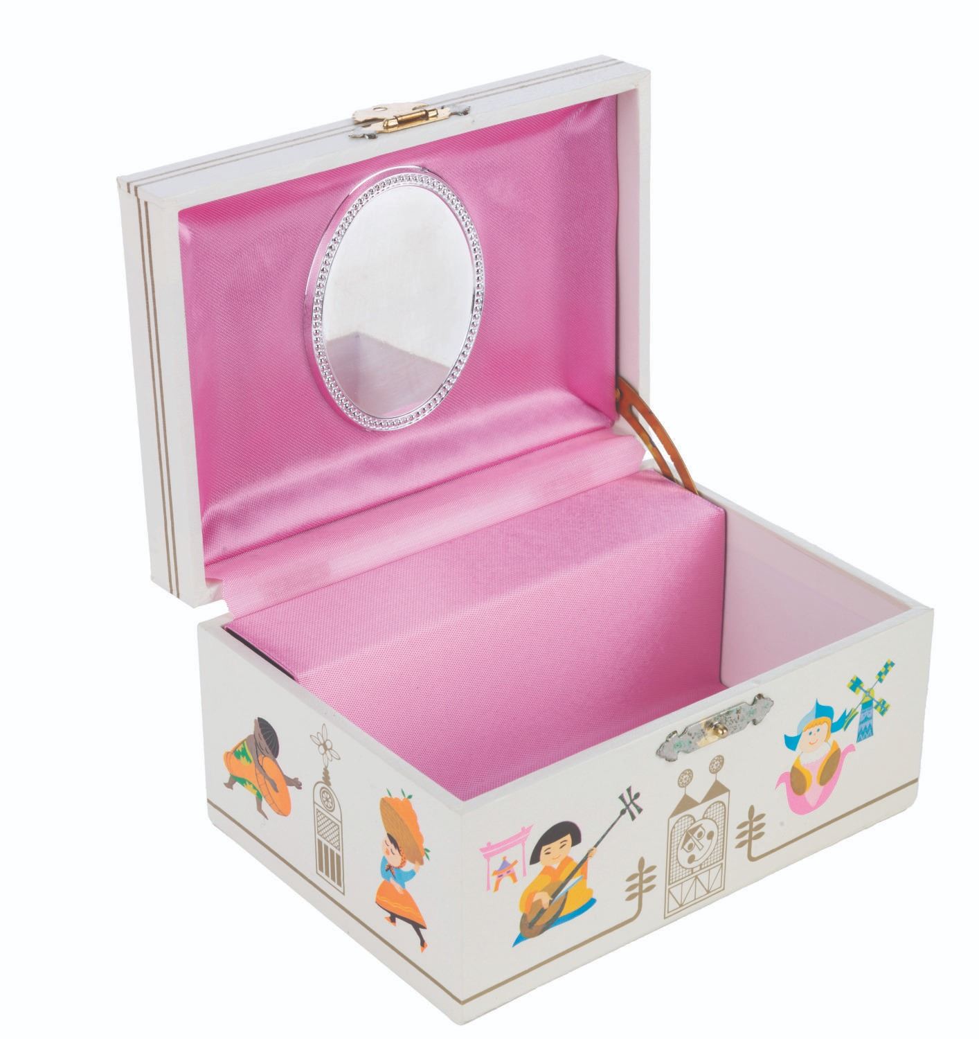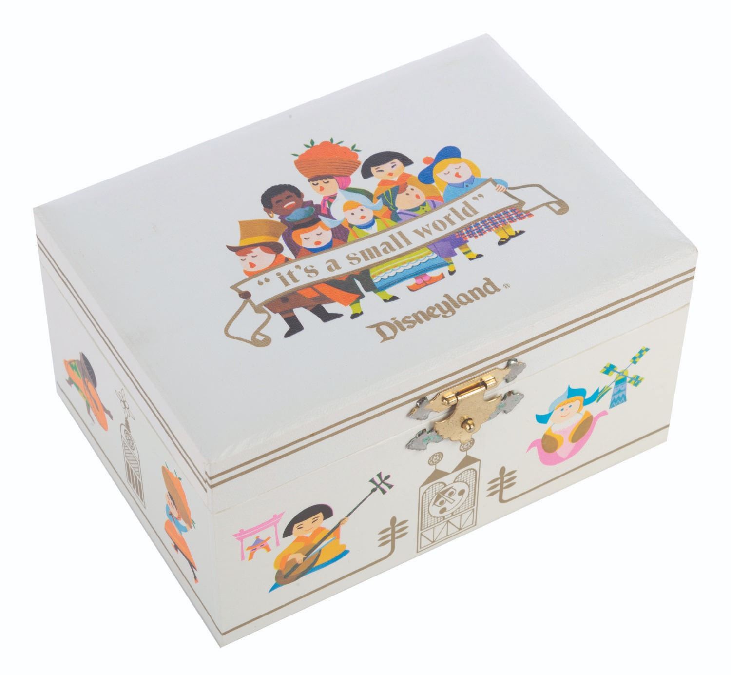 (Disneyland,1960s-1970s) An It's a Small World music box from Disneyland. Measuring 4.25"x6"x 3.5" tall the box functions properly and is in very good condition, with slight discoloration to the metal clasp. It comes in its original box bearing a Disneyland price tag.