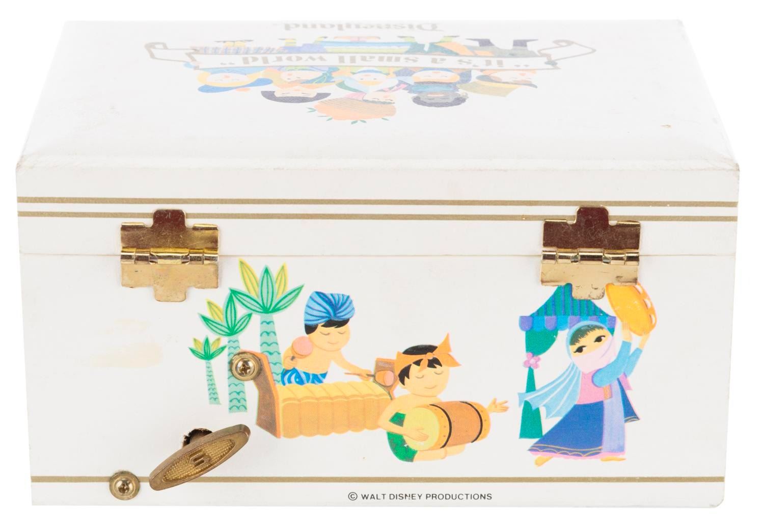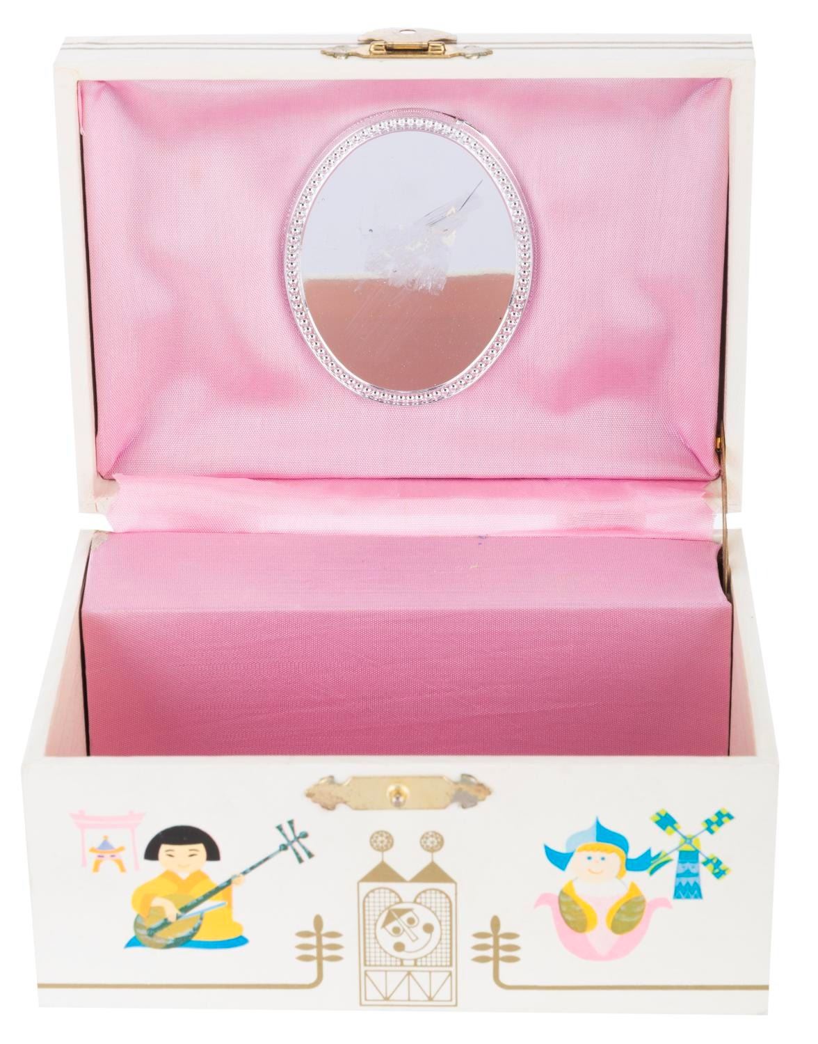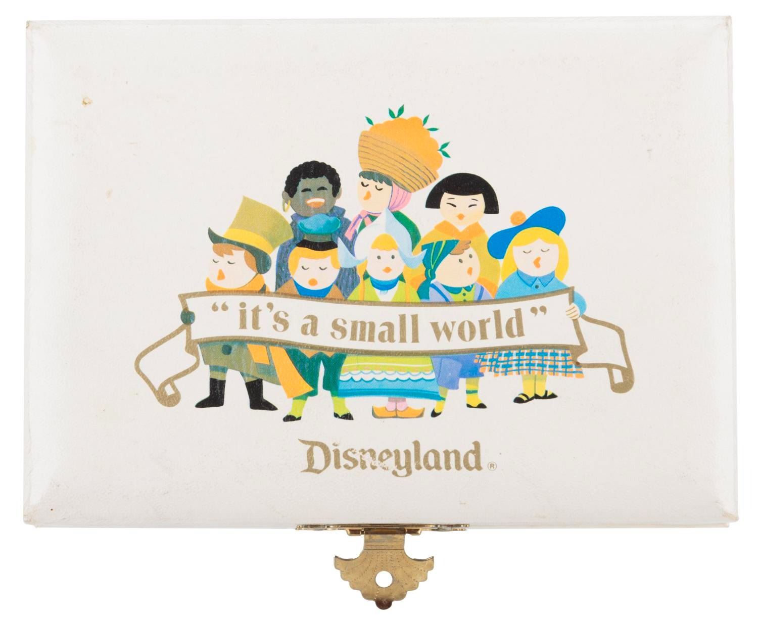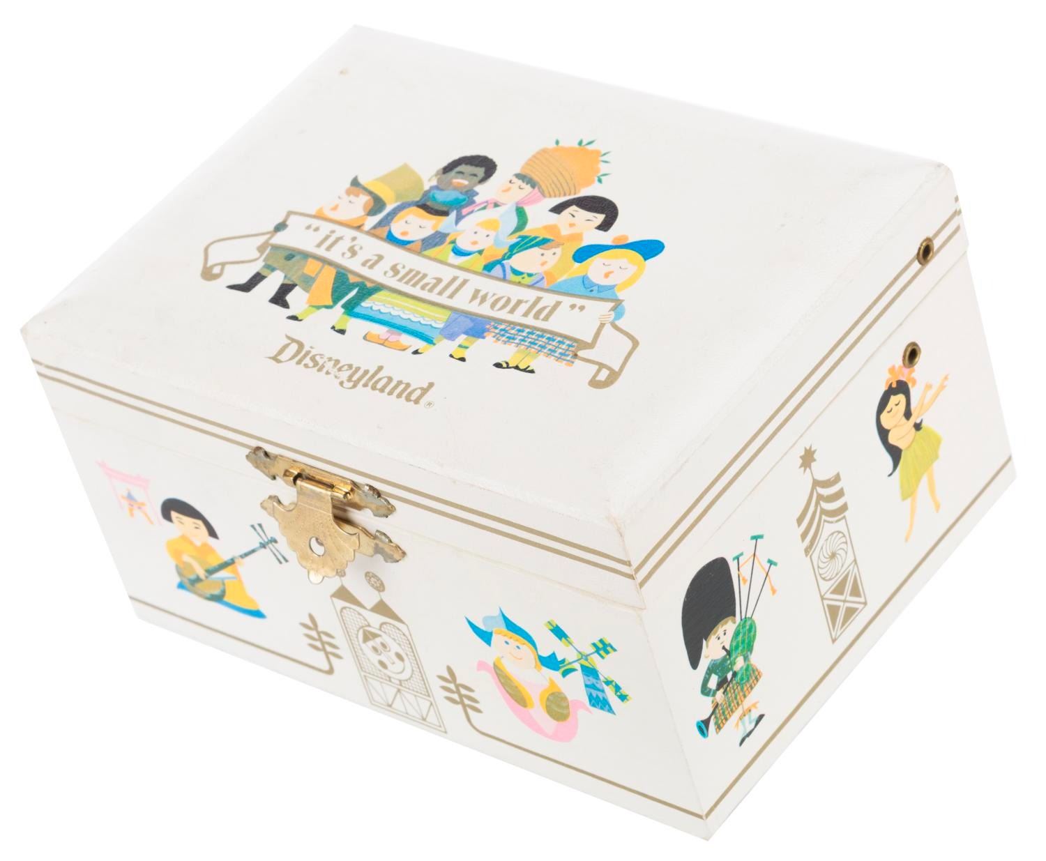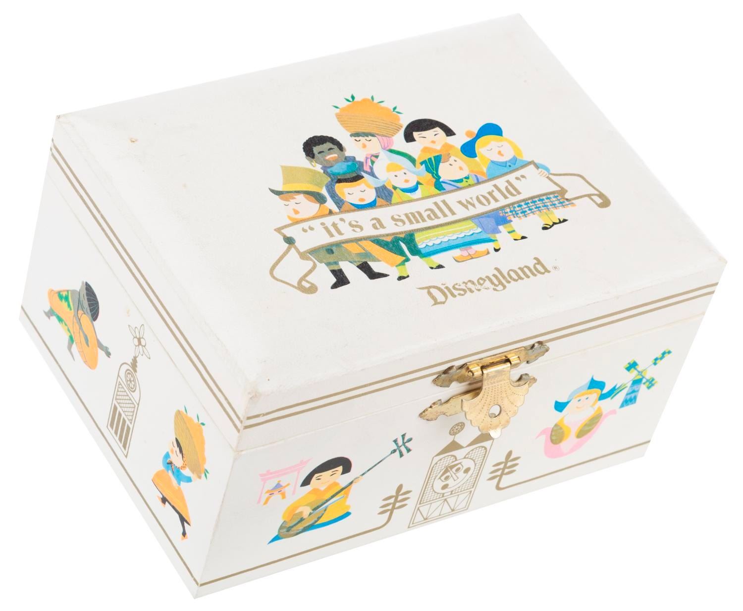 (Disneyland,1960s-70s) An It's a Small World musical jewelry box from Disneyland. Although this box displays well, the music feature is non-functioning. Measuring 4.25" x 6" x 3.5" tall the box displays in good condition, with slight color fading overall, and a small smudge and scratch to the mirror inside.