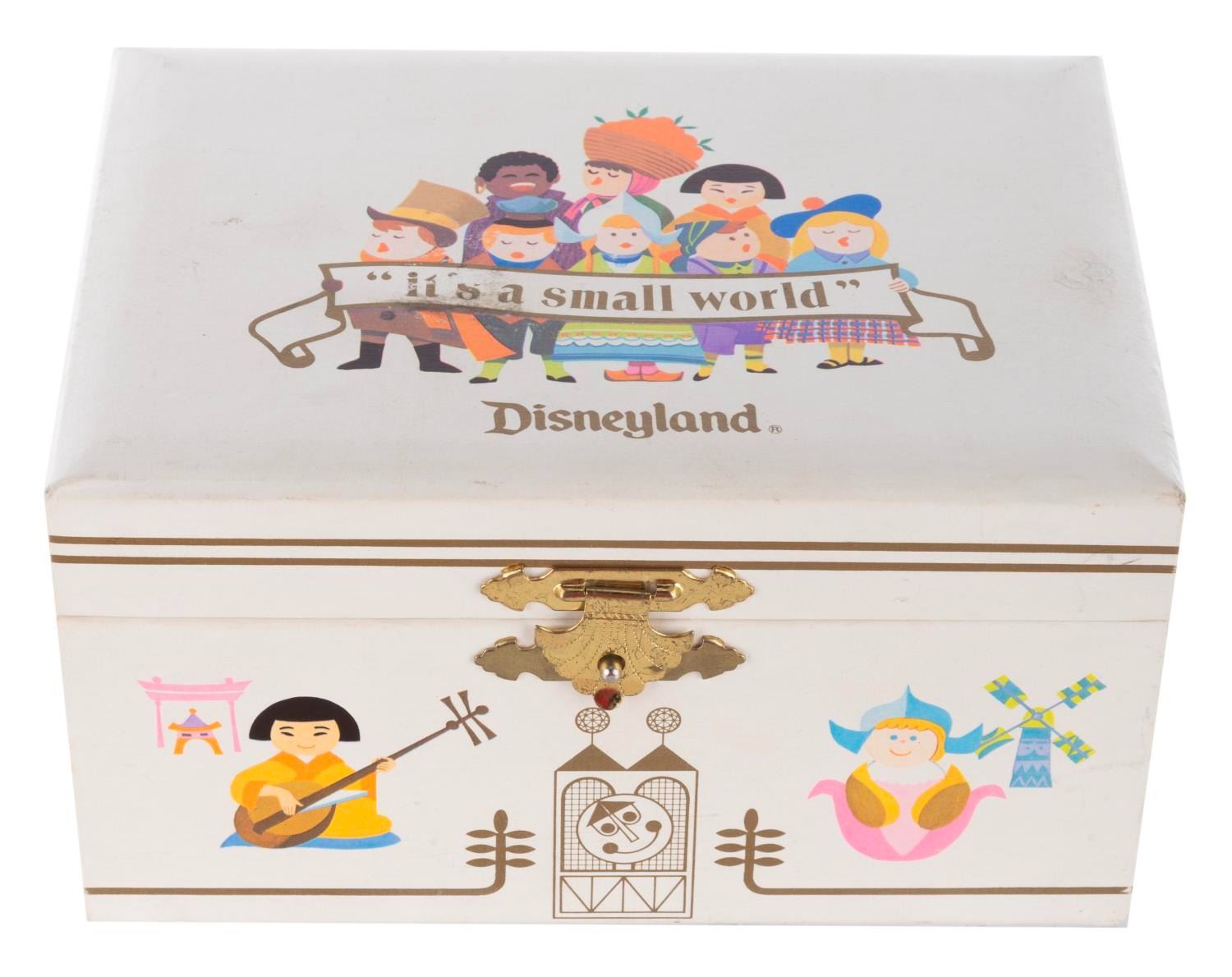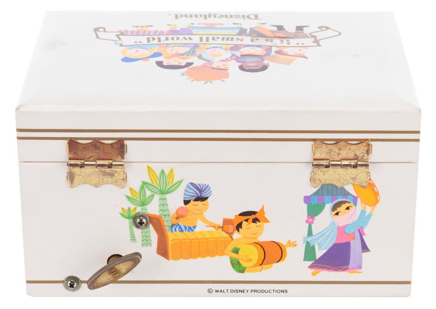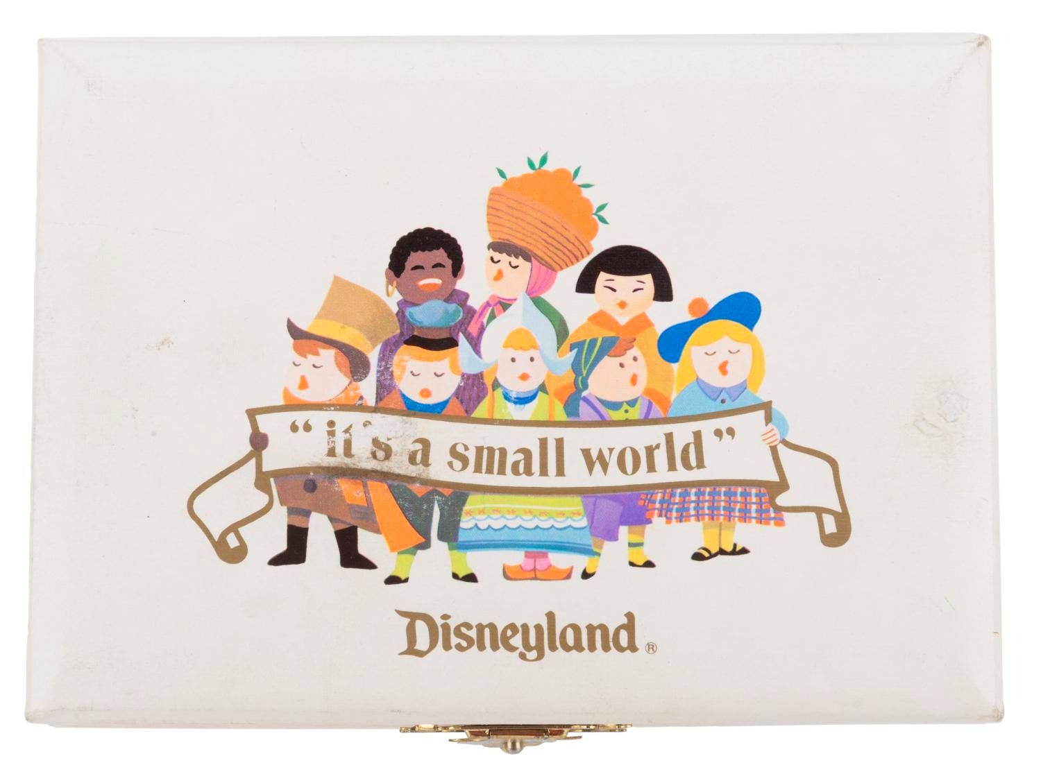 (Disneyland,1960s-70s) An It's a Small World musical jewelry box from Disneyland. When wound, the box plays the iconic theme from the beloved attraction. Measuring 6” x 4.5” and 3” tall when closed, the box is in good working condition with minimal wear from handling.