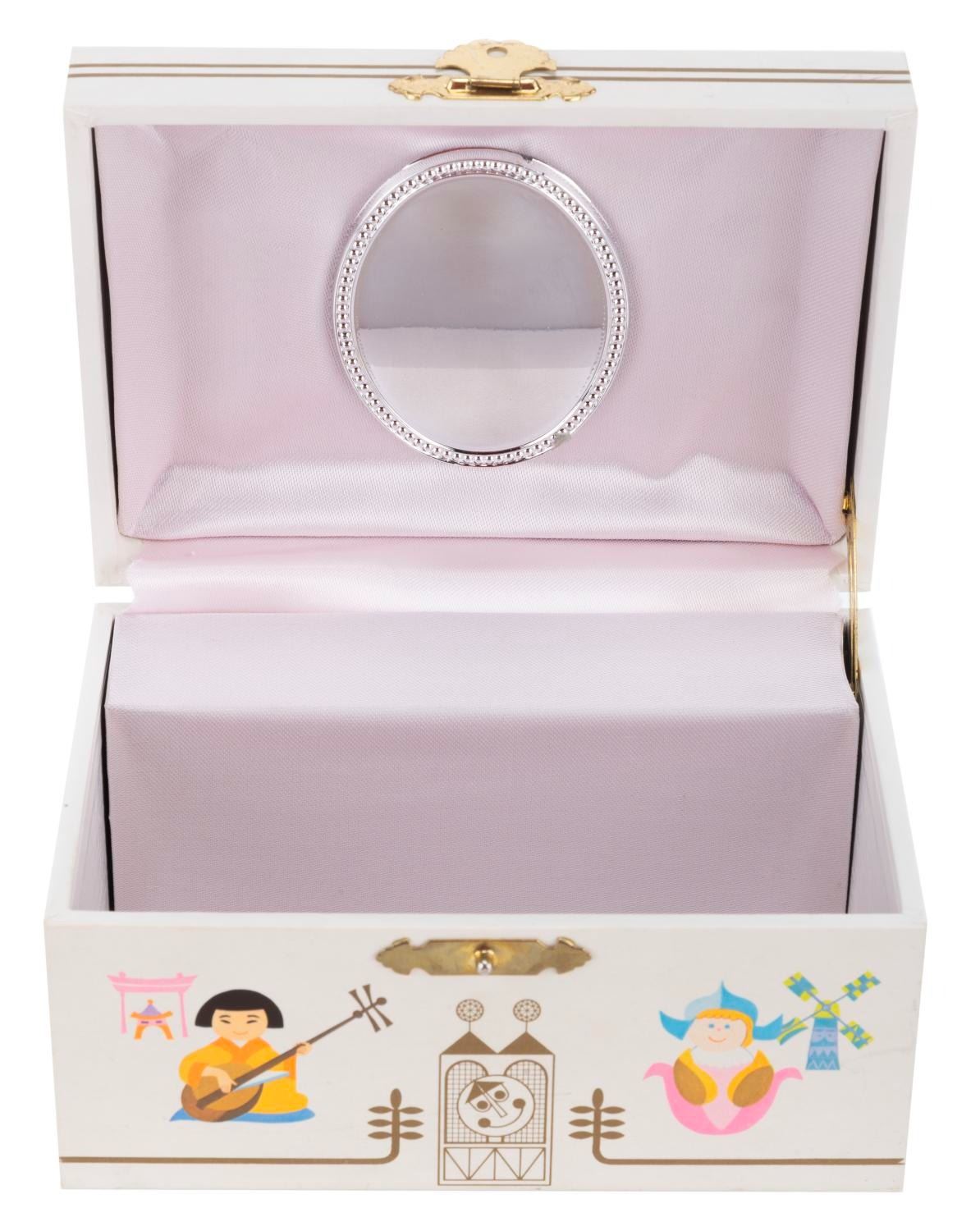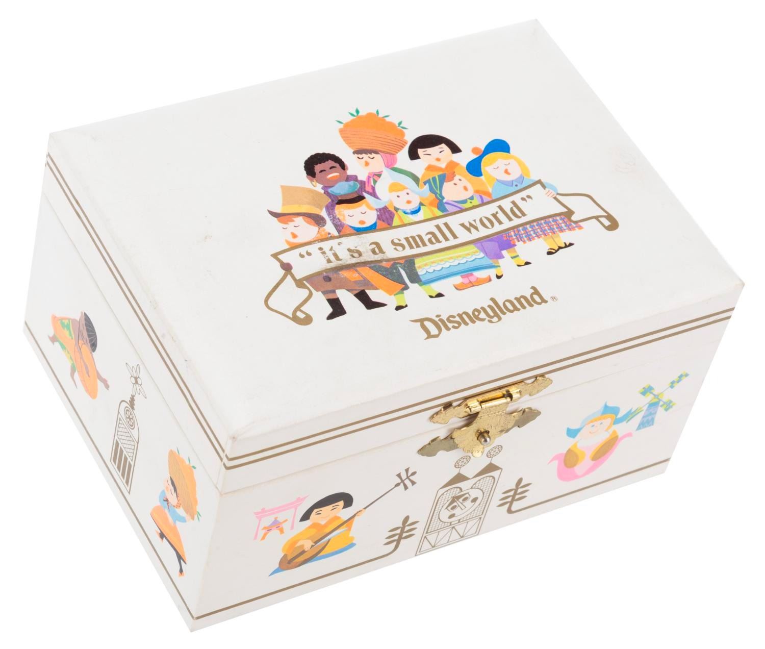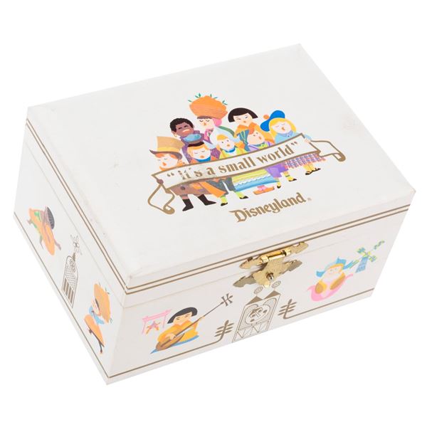 (Disneyland,1960s-70s) An It's a Small World musical jewelry box from Disneyland. When wound, the box plays the iconic theme from the beloved attraction. Measuring 6” x 4.5” and 3” tall when closed, the box is in good working condition with minimal wear from handling.