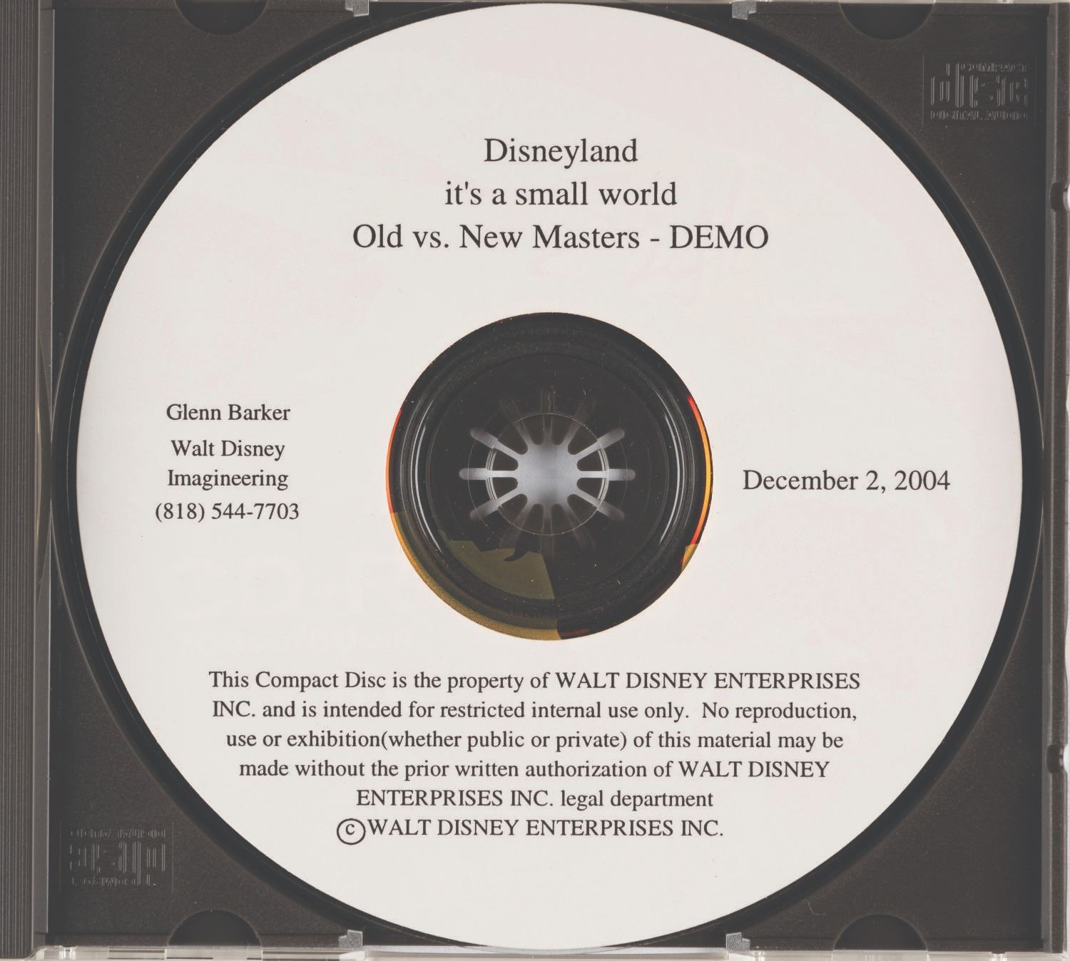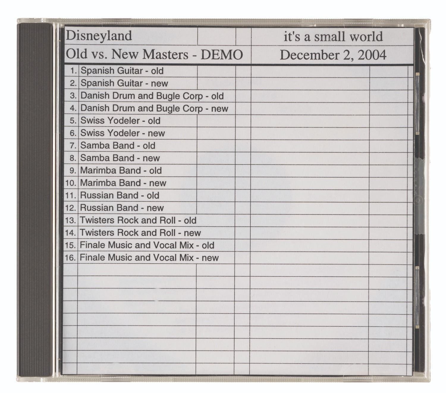 (Disneyland, 2004) An “Old vs. New Masters” Demo CD for the It’s a Small World Attraction. The disc dated December 2, 2004 presents eight “old” master recordings of individual sounds in the attraction such as “Swiss Yodeler” and “Spanish Guitar” beside the “New” master of the same sound. Measuring a standard 4.75” x 5.5” case with a 4.5” disc, the CD is in very good working condition.