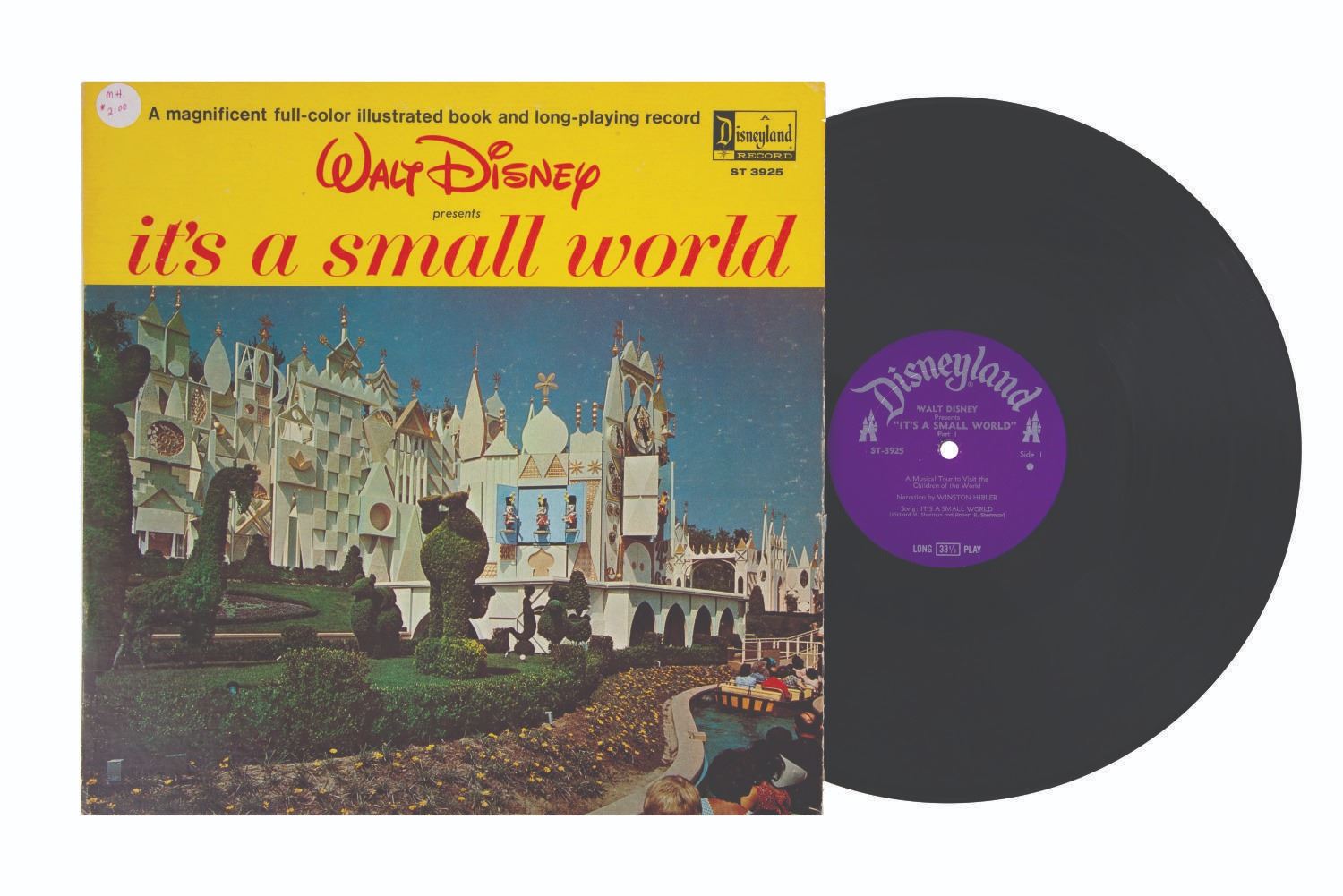 (Disneyland, 1966) A 33 RPM Record with a 10-page book for It's a Small World. The record with narration tells the story of the attraction, with colorful photos and a pictograph map of the ride to follow along with the book. Measuring 12.25"x12.25" the Record jacket with book is in good condition, with wear to edges, scuffing, and center pages of the book loose. The 12" record is in very good to fine condition.