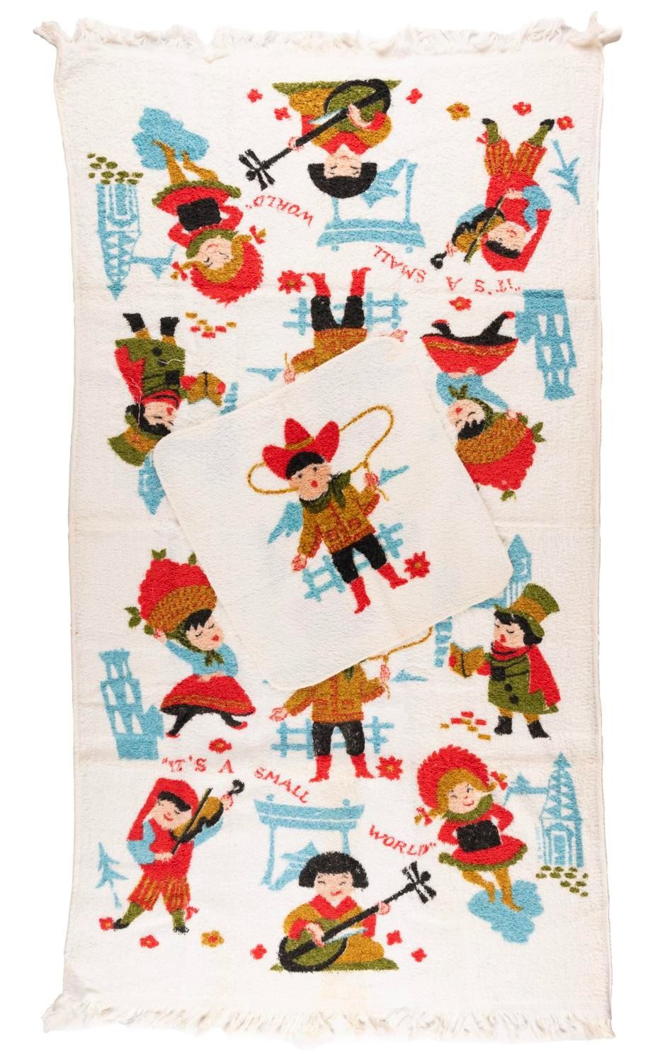 (Disneyland, 1960s) A washcloth and hand towel featuring imagery from the It's A Small World attraction at Disneyland. The towels were originally sold through Montgomery Ward Department Stores and are still in their original packaging.