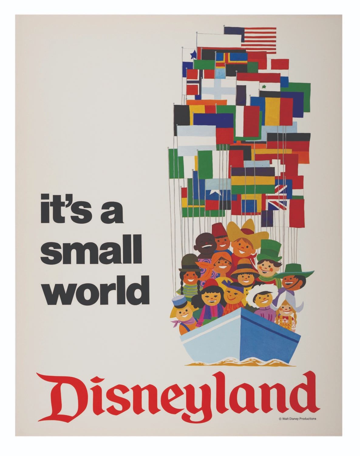 (Disneyland, 1970s) A window card-style poster for It's a Small World, featuring reimagined artwork based on the original attraction poster design by Paul Hartley, but with enhanced colors and the use of actual national flags. Measuring 14" x 18", the poster is in very good condition with light scratches.