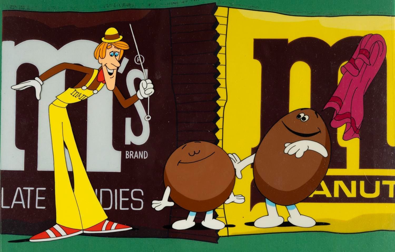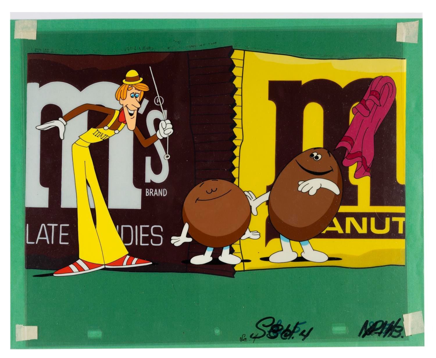 (Mars, 1970s) An original multi-layer production cel from an M&M’s candy commercial. Measuring 11” x 13.5” with a character image size of 12” x 6.75”, the cel is in fine condition presented with a color copy background.