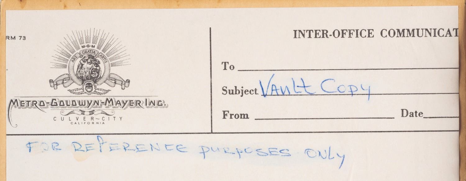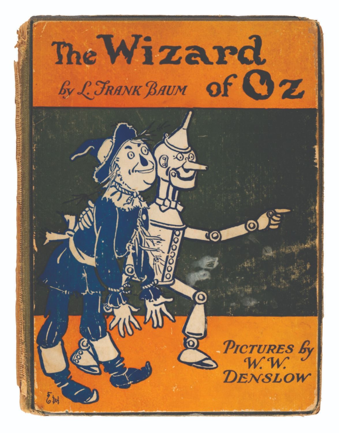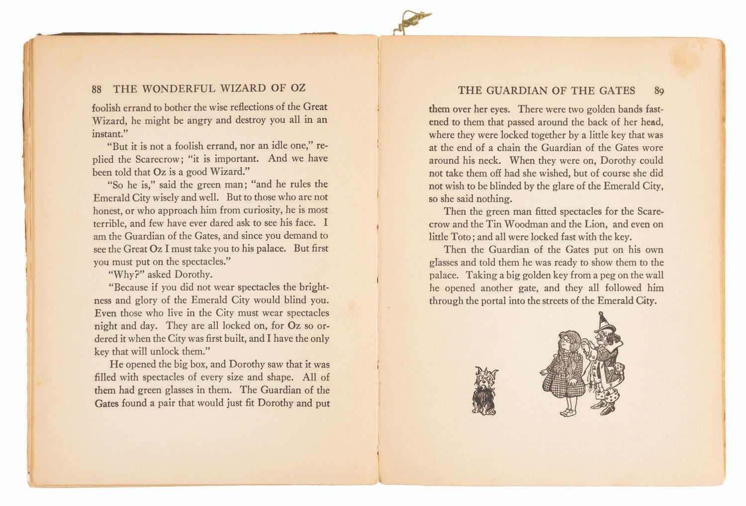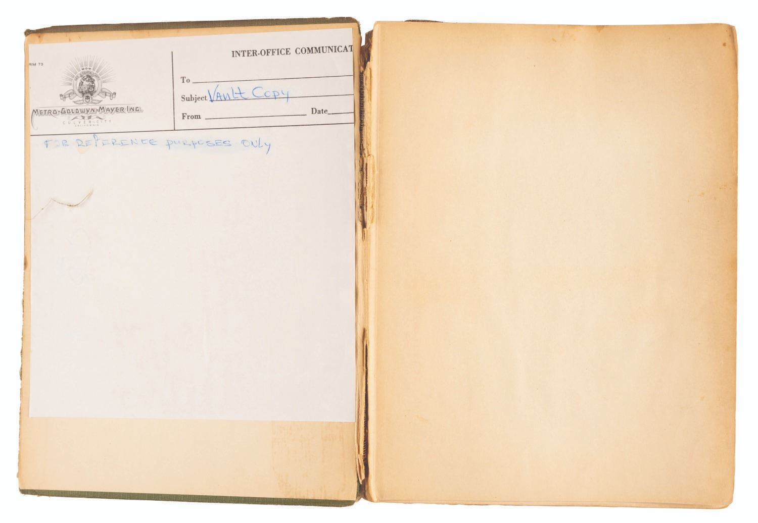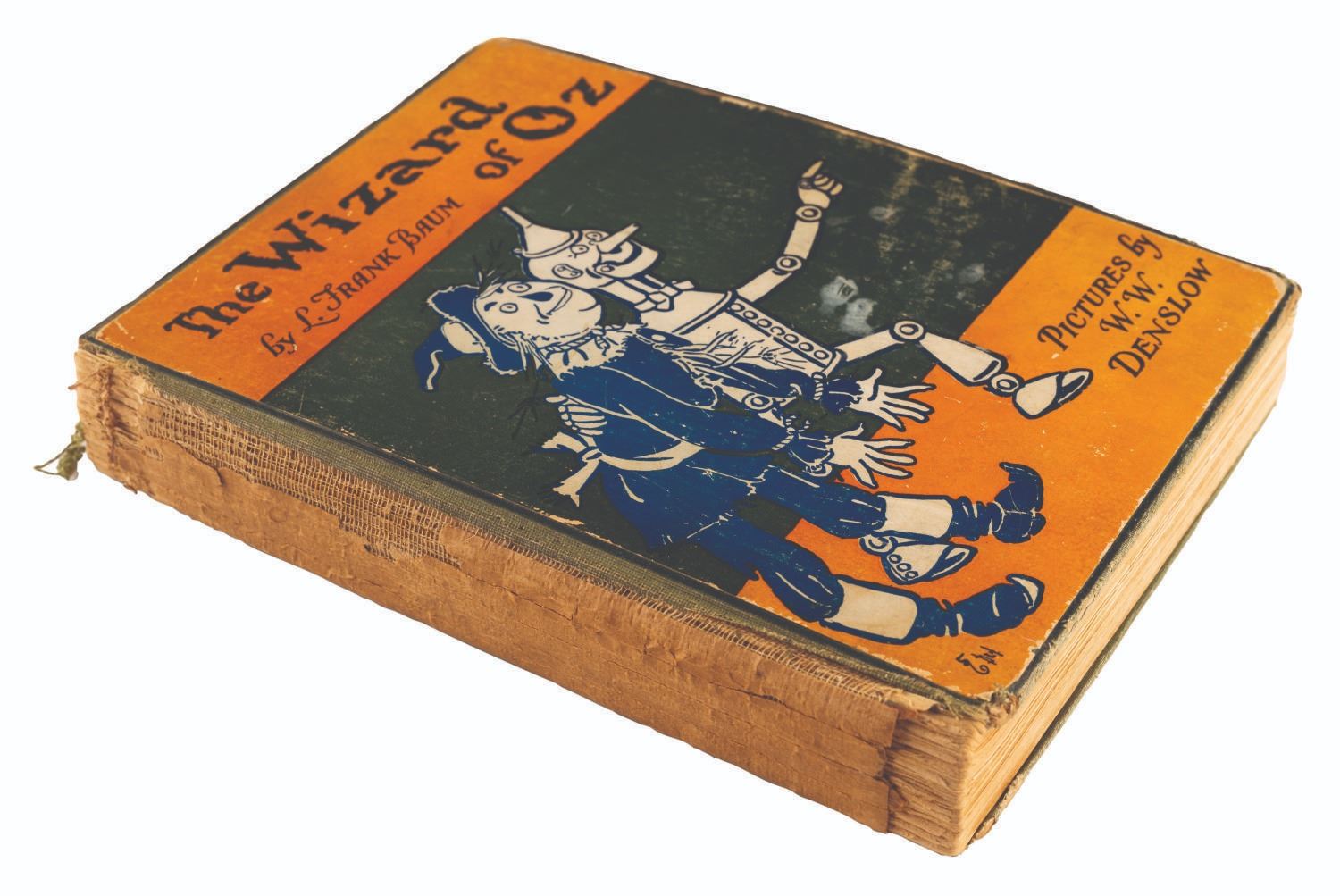 (Baum, 1903) A hardcover "The Wizard of Oz” by L. Frank Baum from the MGM Studios vault. This 208-page fifth-edition book contains eight color plates by illustrator W.W. Denslow. The front inside cover features an inter-office memo from MGM Studios, marking it as a "vault copy" and for "reference purposes only." Measuring 9” x 7” x 1.25” thick, the book is in poor condition with a missing spine cover, dulled corners, fraying to the front cover, weak binding, partial detachment of cover at the top and bottom, partial and completely detached pages with tears and creasing, and discoloration from age.