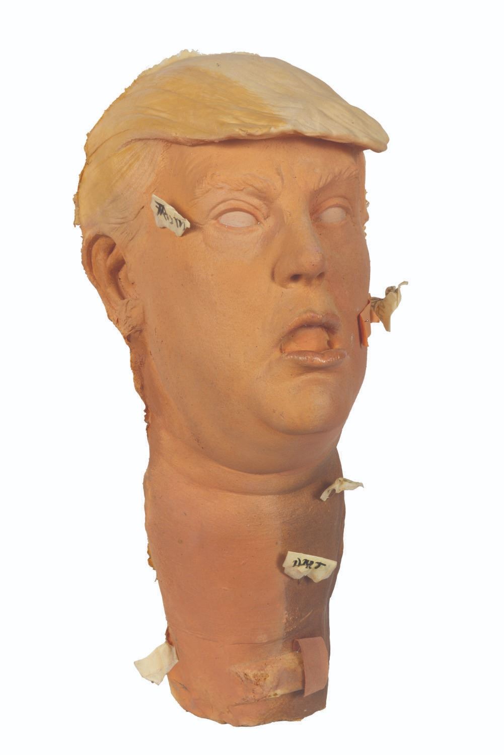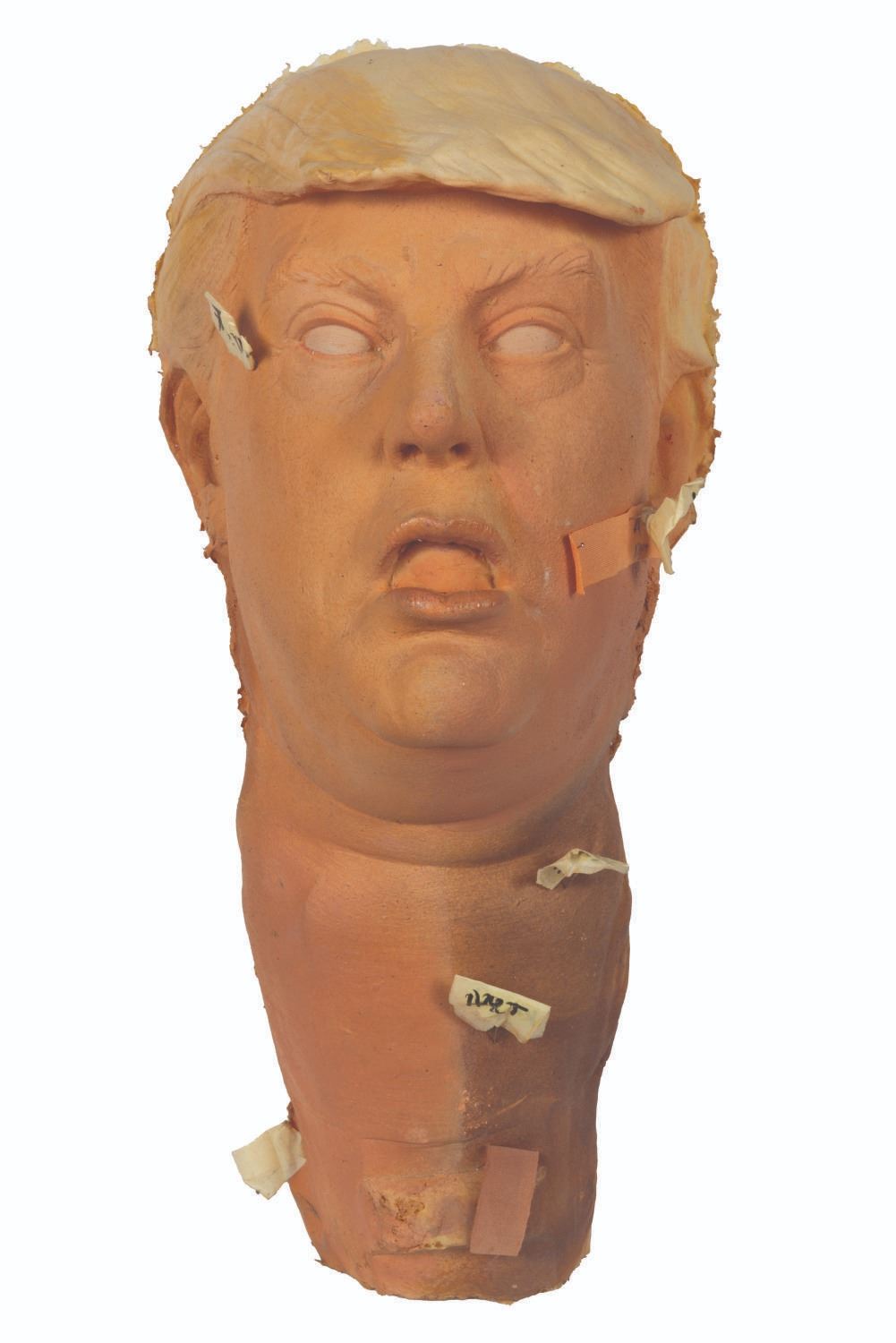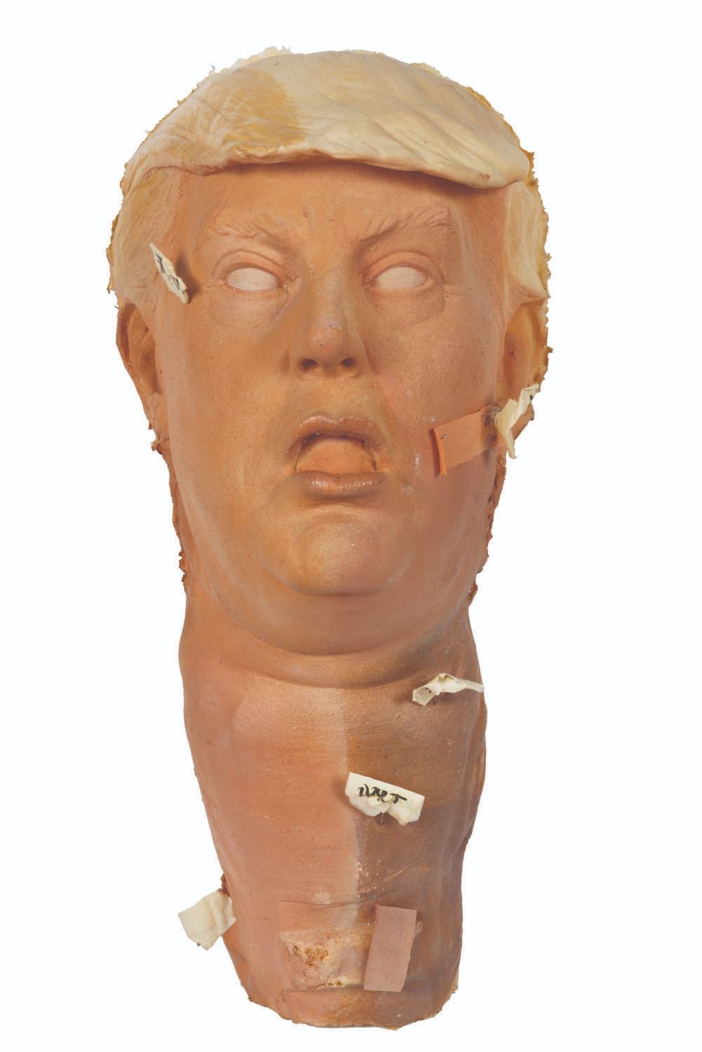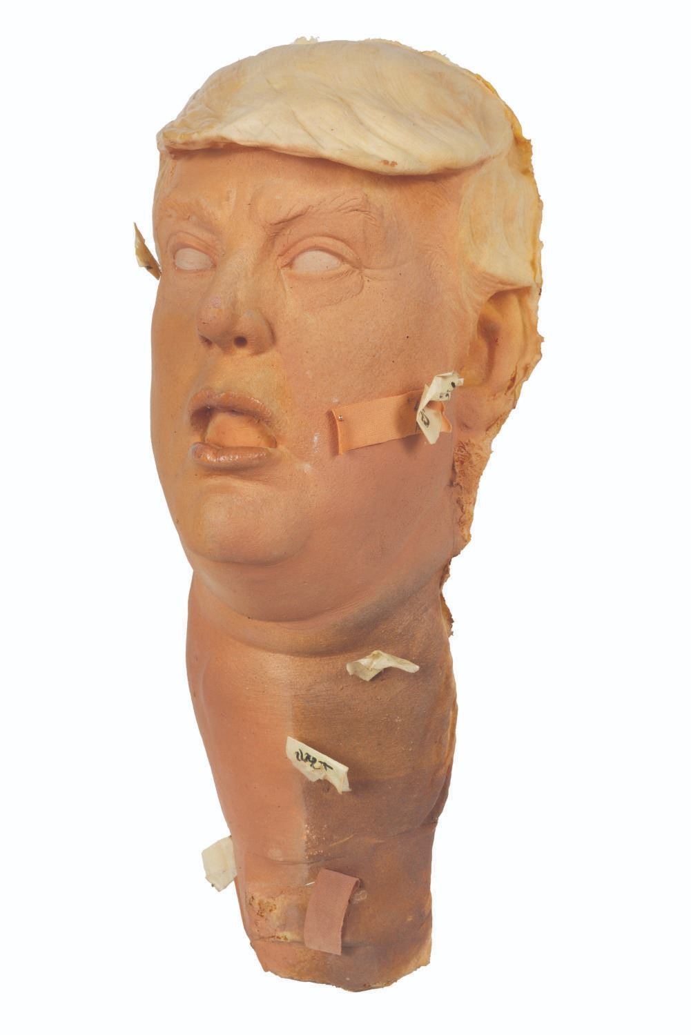 (Chiodo Bros., 2010s) A foam test head of Donald Trump from the unproduced Jeff Ross-hosted puppet show “MTV Roasts.” Measuring approximately 7” x 8” x 19” tall, the head displays in very good condition with light soiling, staining, and identification push pins from production use.