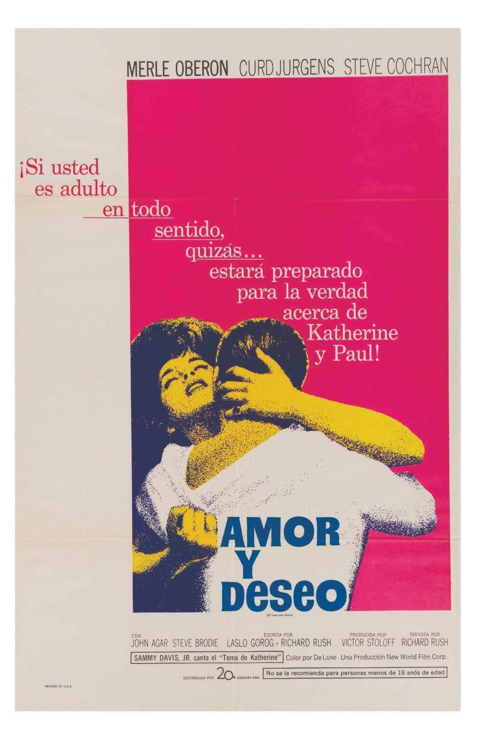 (20th Century Fox, 1963) A Spanish language one-sheet poster for Of Love and Desire starring Merle Oberon and Steve Cochran. Measuring 27"x41", the poster is in very good condition with very light wear and color shift along original fold lines.