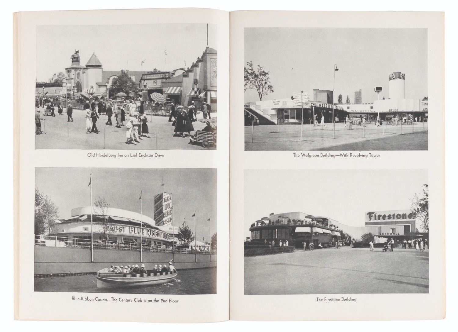 (World’s Fair, 1933) A fifty-six-page book of official pictures from the 1933 Chicago World’s Fair, also known as “A Century of Progress International Exposition.” Filled with stunning black and white photos from the fair, the 7” x 10” book is in very good condition with edge discoloration from age and some stains on the front and back covers.
