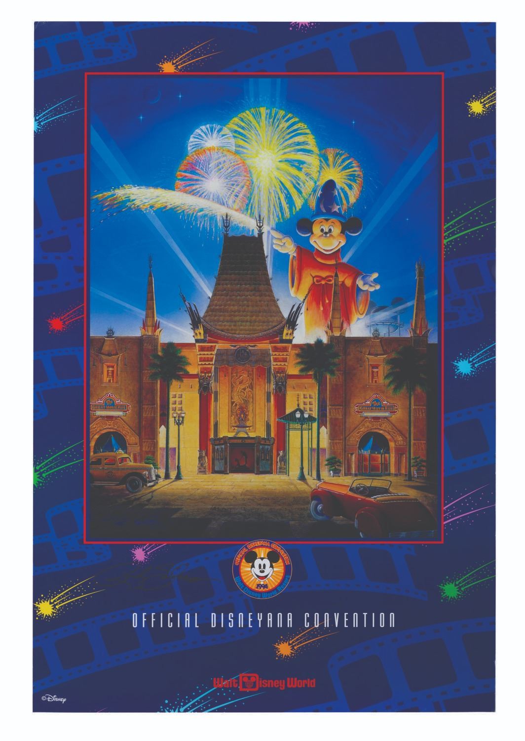(Walt Disney World, 1994) A poster of The Great Movie Ride at Disney-MGM Studios, created for the 1994 Disneyana Convention and signed by artist Randy Souders. Measuring 24" x 36", the posster is in very good condition with edge wear, notably at the corners.