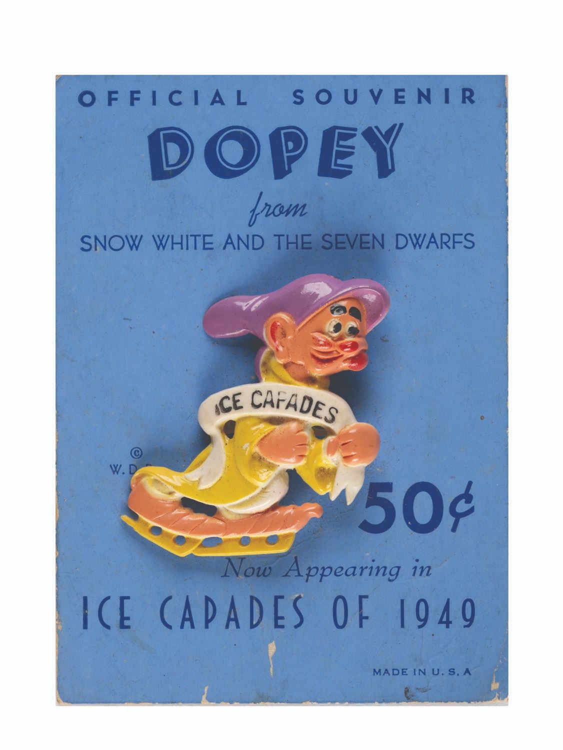 (Disney, 1949) An Official Ice Capades Dopey Souvenir Pin. This souvenir pin of Dopey was issued exclusively through the Ice Capades of 1949, which featured Snow White and the Seven Dwarfs. Measuring 1.75"x23", this pin is in very good condition with minor oxidation to metal elements, scuffs, a few creases, and wear to its 3"x4.25" card.