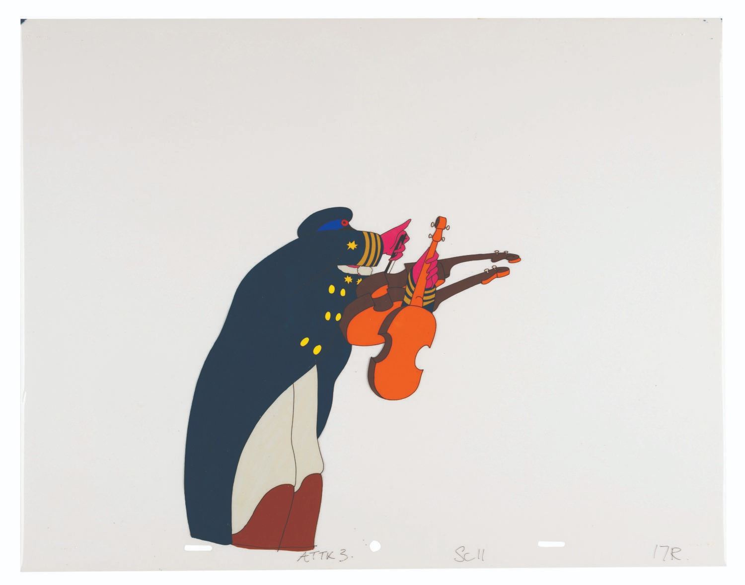 (United Artists, 1968) An original hand-painted production cel of Old Fred from The Beatles animated film "Yellow Submarine.” With an image size of 7.5” x 7.75” on a 12.5” x 16” cel, the piece is in good condition with spots of discoloration, scratches, staples at the corners from display, and wear from production use.