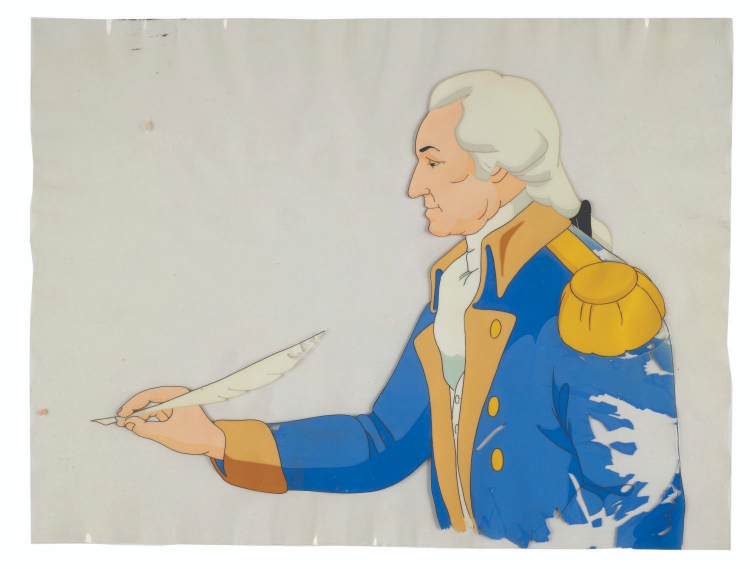 (Schlesinger, 1939) An original hand-painted production cel of George Washington from the Porky Pig-starring short “Old Glory,” directed by Chuck Jones. With a character image size measuring 8” x 10” on a 9” x 12” cel, the piece displays in good condition with scratches, wear, and heavy paint loss, particularly Washington’s left arm.
