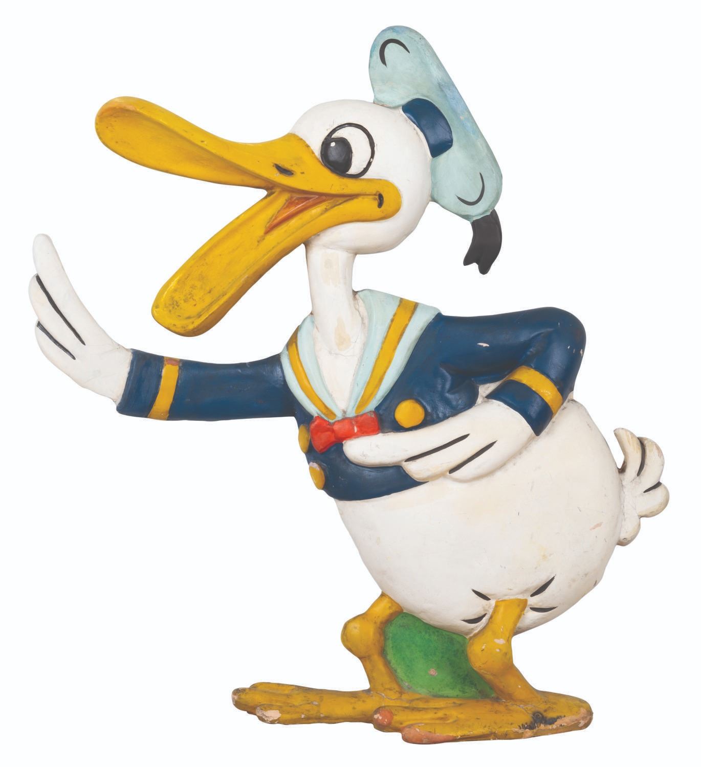 (Old King Cole, 1930s) A rare Donald Duck window display made by Old King Cole. Donald made his debut in the Silly Symphony "The Wise Little Hen,” released on June 9th, 1934. Two small Donald figures can be seen in Walt Disney Enterprises' film of Christmas displays from 1934, and this figure of the soon-to-be-headlining Duck likely dates to 1934 or 1935. The figure measures 33” x 5” x 36.5” tall. Donald is in good condition with small scuffs, cracks to the neck, tail, and foot, hairline cracking to the paint, and spots of wear to edges throughout. This lot requires special shipping arrangements. Please inquire before bidding.