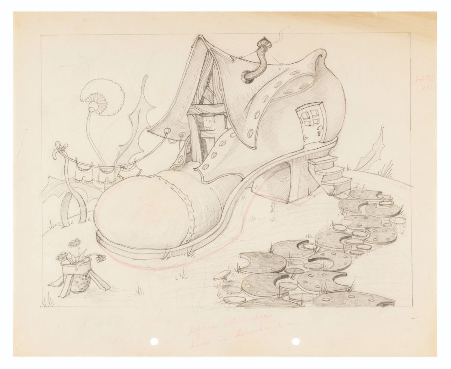 (1930s-1940s) A layout drawing from an unknown production based on the nursery rhyme "There Was an Old Woman Who Lived in a Shoe.” With an image size of 7.75” x 10.5” on 9.75” x 12” animation paper, the graphite and colored pencil drawing is in good condition with edge wear, discoloration from age, creases, and tears up to 1.5” long.
