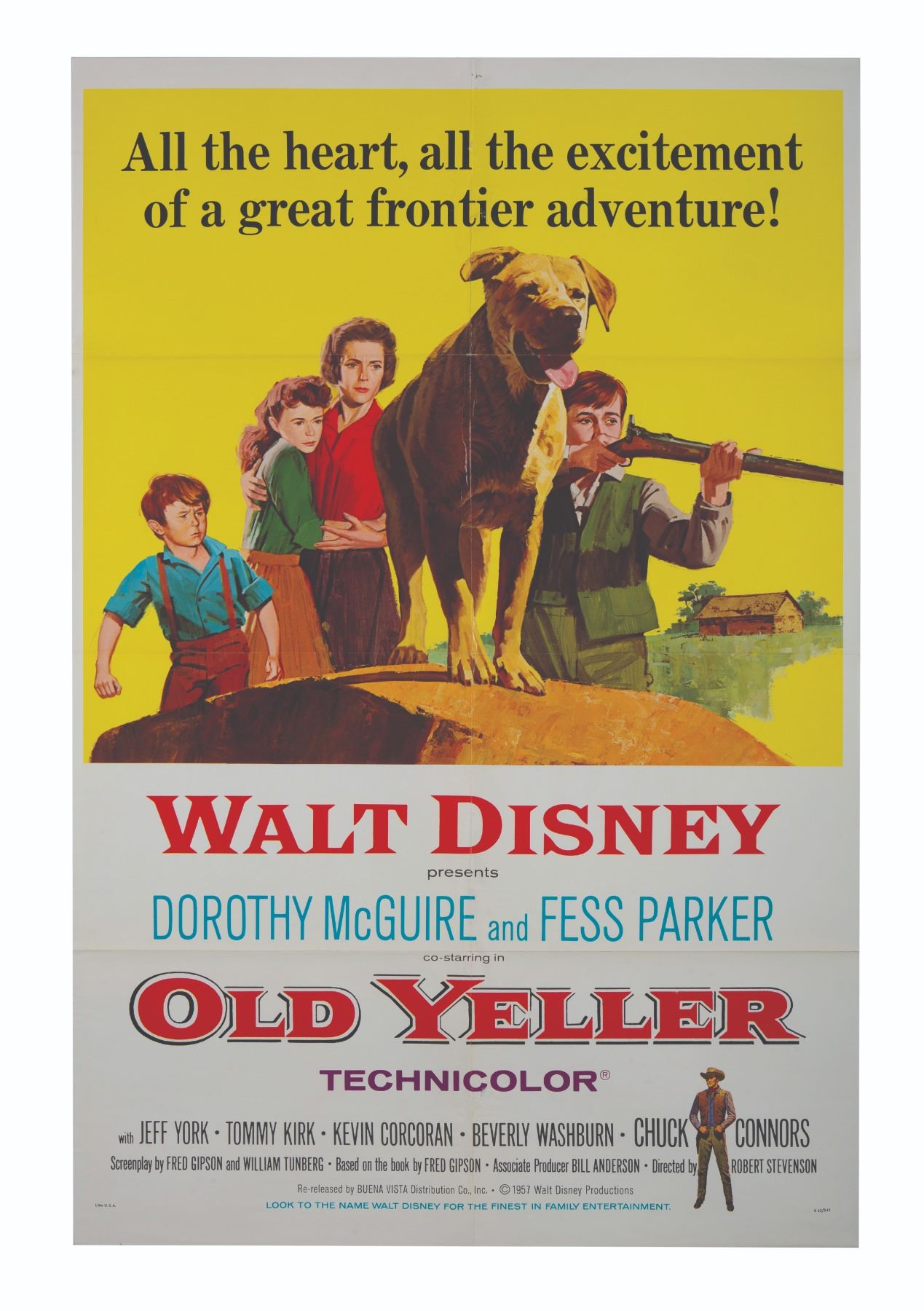(Disney, 1965) An original one sheet poster for the 1965 re-release of Walt Disney Productions' 1957 feature film "Old Yeller." Measuring 27"x41", the poster is in overall very good condition exhibiting few light stains (visible from the front) along the original folds.