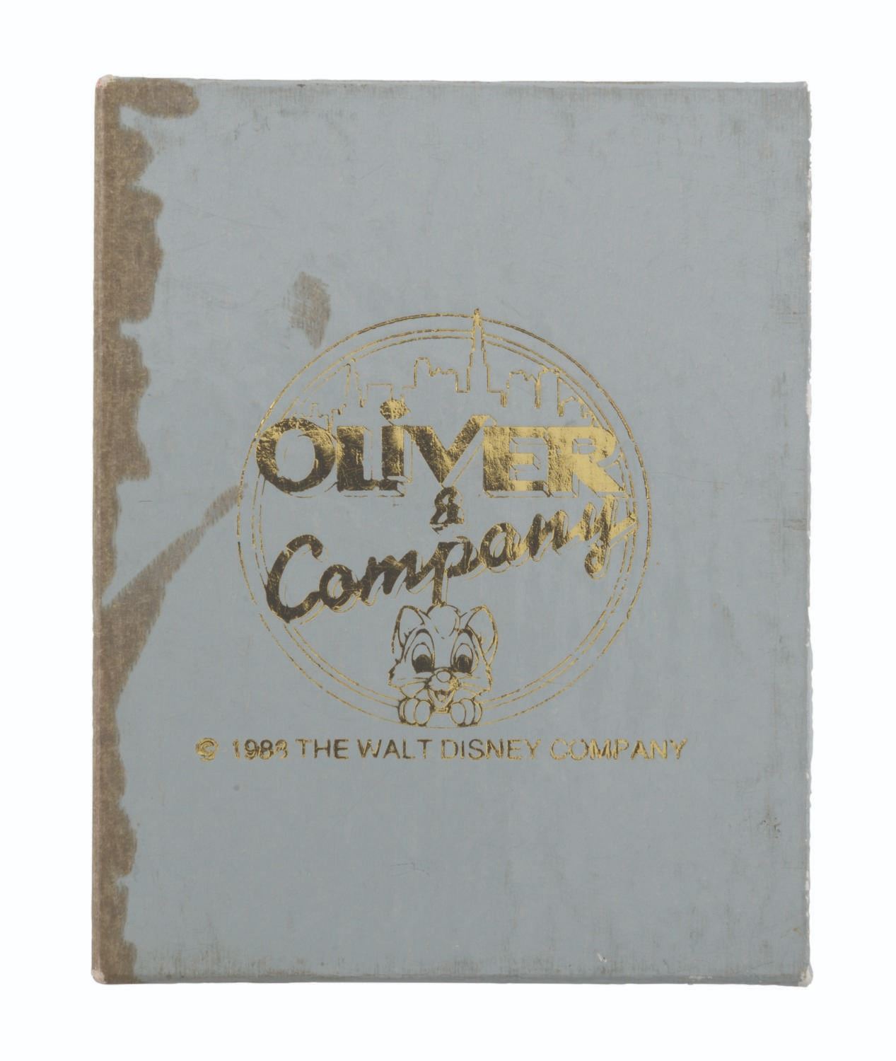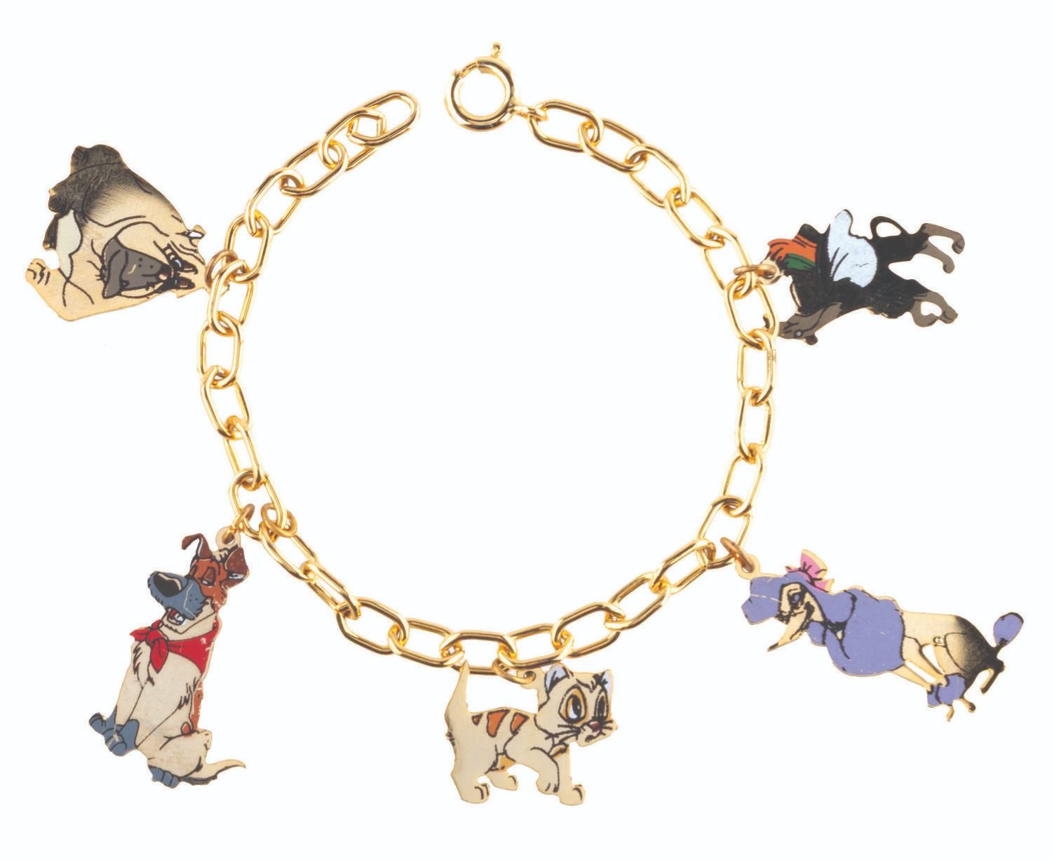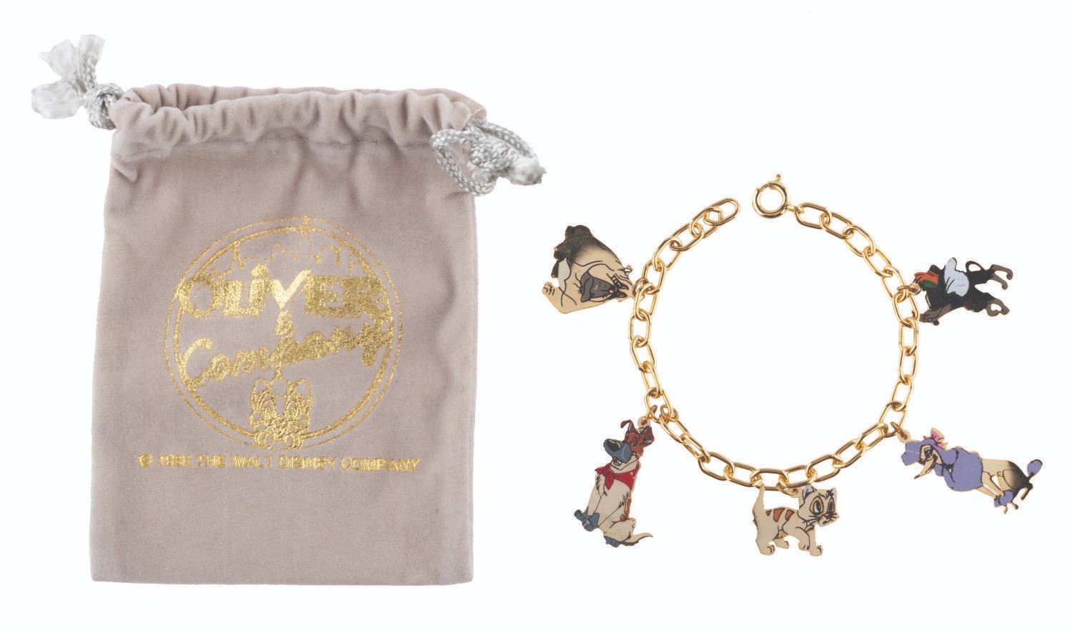 (Disney, 1988) A gold-tone "Oliver & Company " charm bracelet including 5 charms of Oliver, Dodger, Einstein, Francis, and Rita. Measuring 6 " long, the chain comes with its original bag and box and is in very good condition with light scratches and wear, while the box is in fair condition with wear and stains from water exposure.