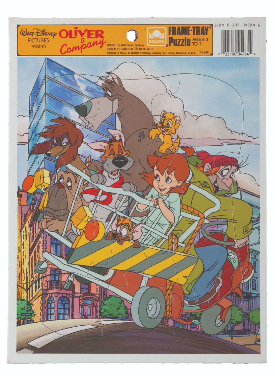 (Golden, 1988) A Golden Frame-Tray puzzle of Disney's animated feature "Oliver & Company." Measuring 8.25" x 11", the never used puzzle displays in very good condition with very light wear at the top edge.