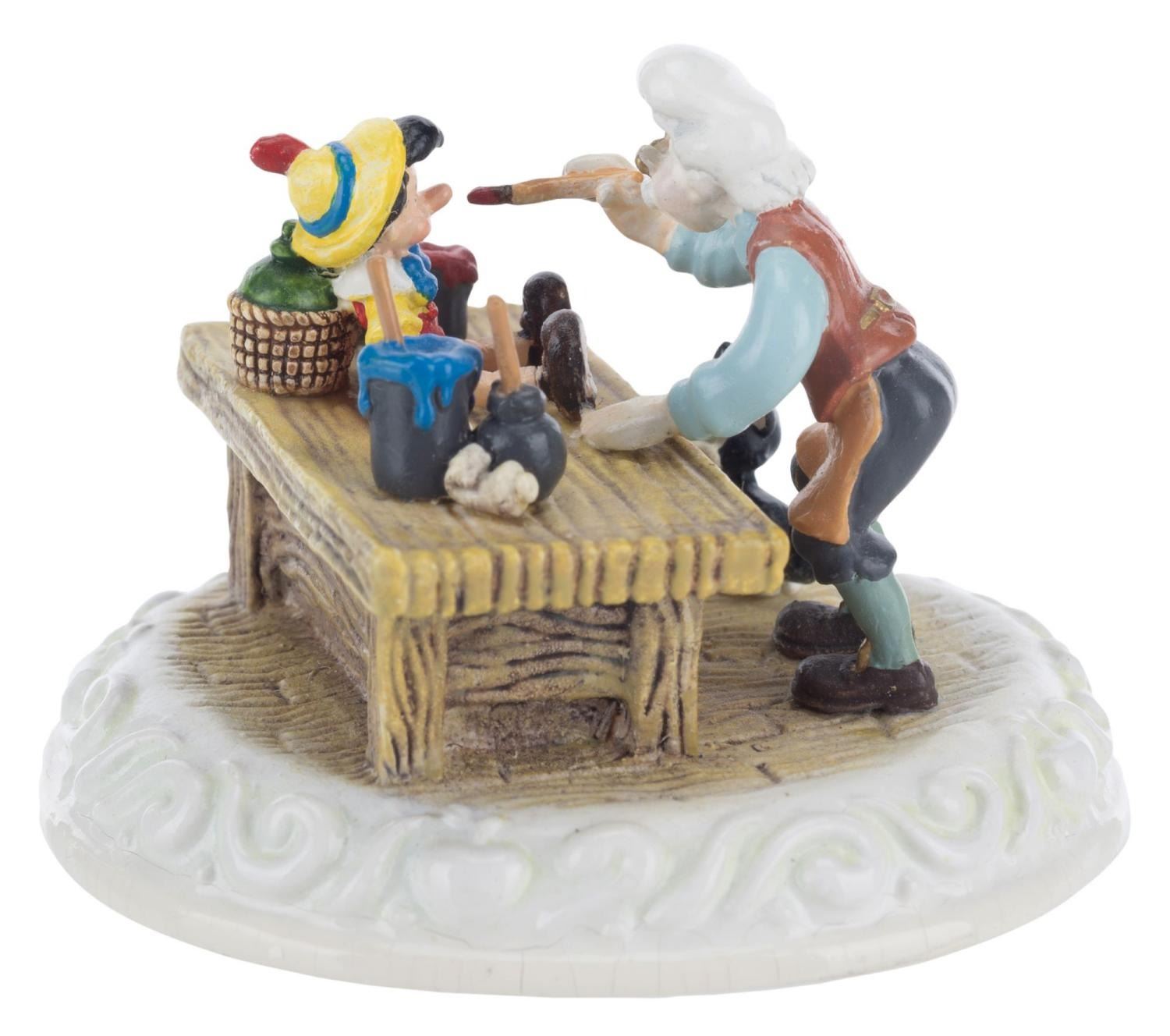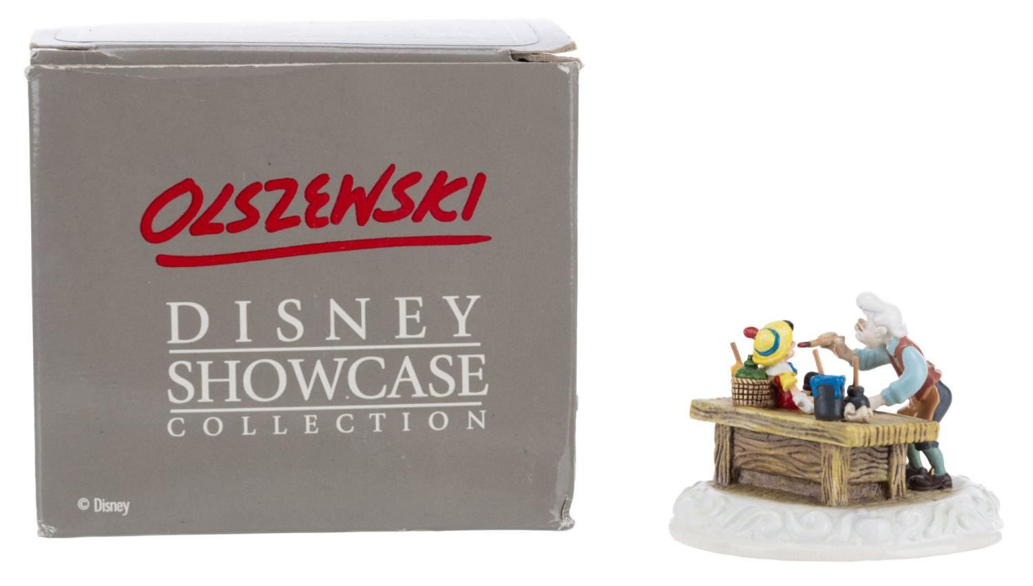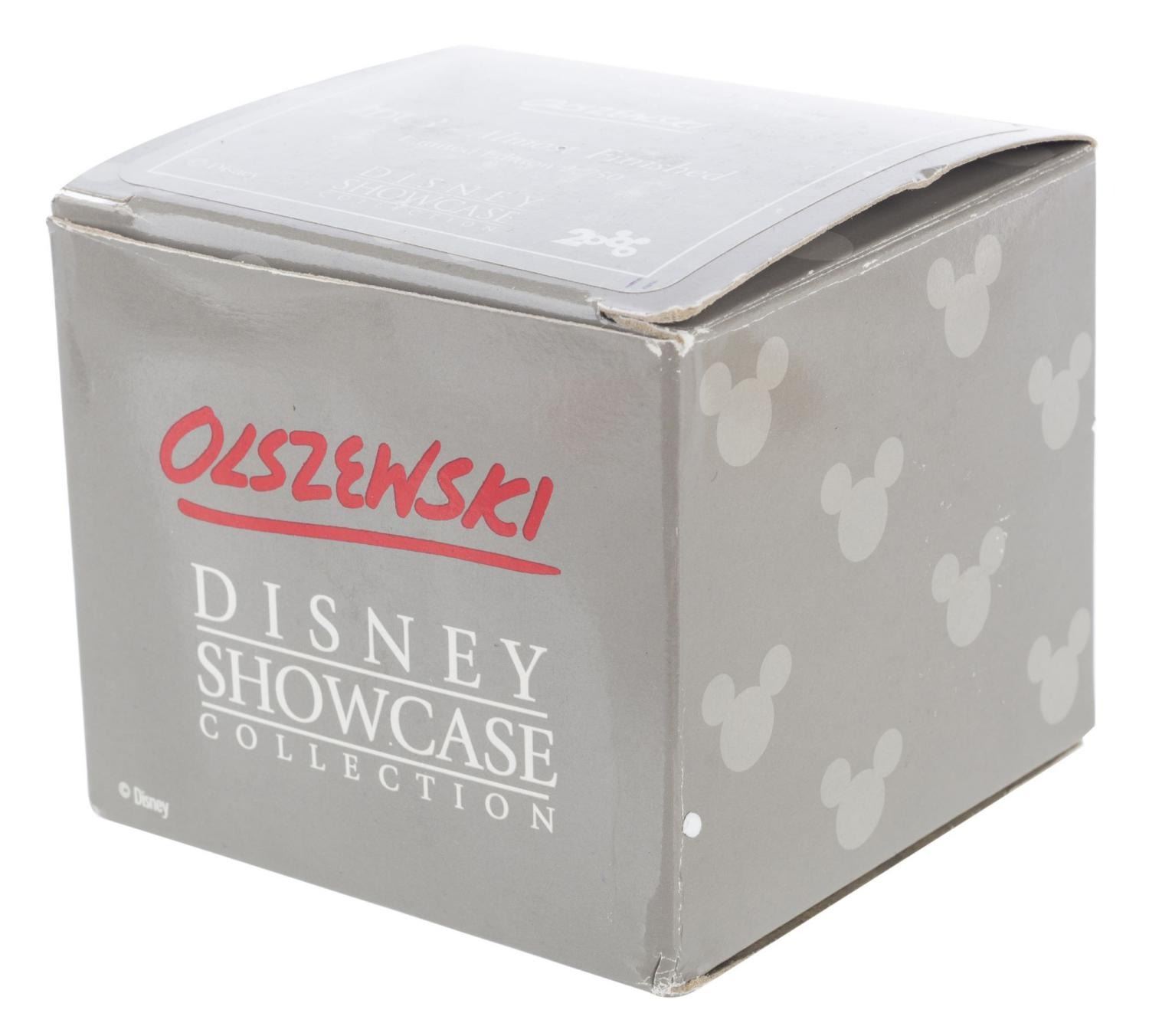 (Disney, 2000) A Disney Showcase Collection “Almost Finished” figurine by Olszewski. Released in a limited edition of 2750, the figurine features Geppetto putting the finishing touches on Pinocchio as Figaro supervises. Olszewski signed the bottom of the base in black marker. Measuring 2” in diameter and 1.5” tall with its original 3.25" x 3.25" x 2.75" tall box, the figurine is in fine condition.