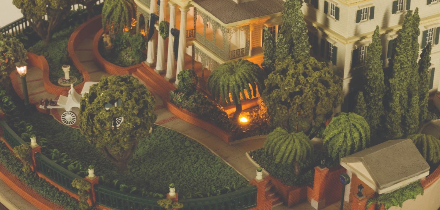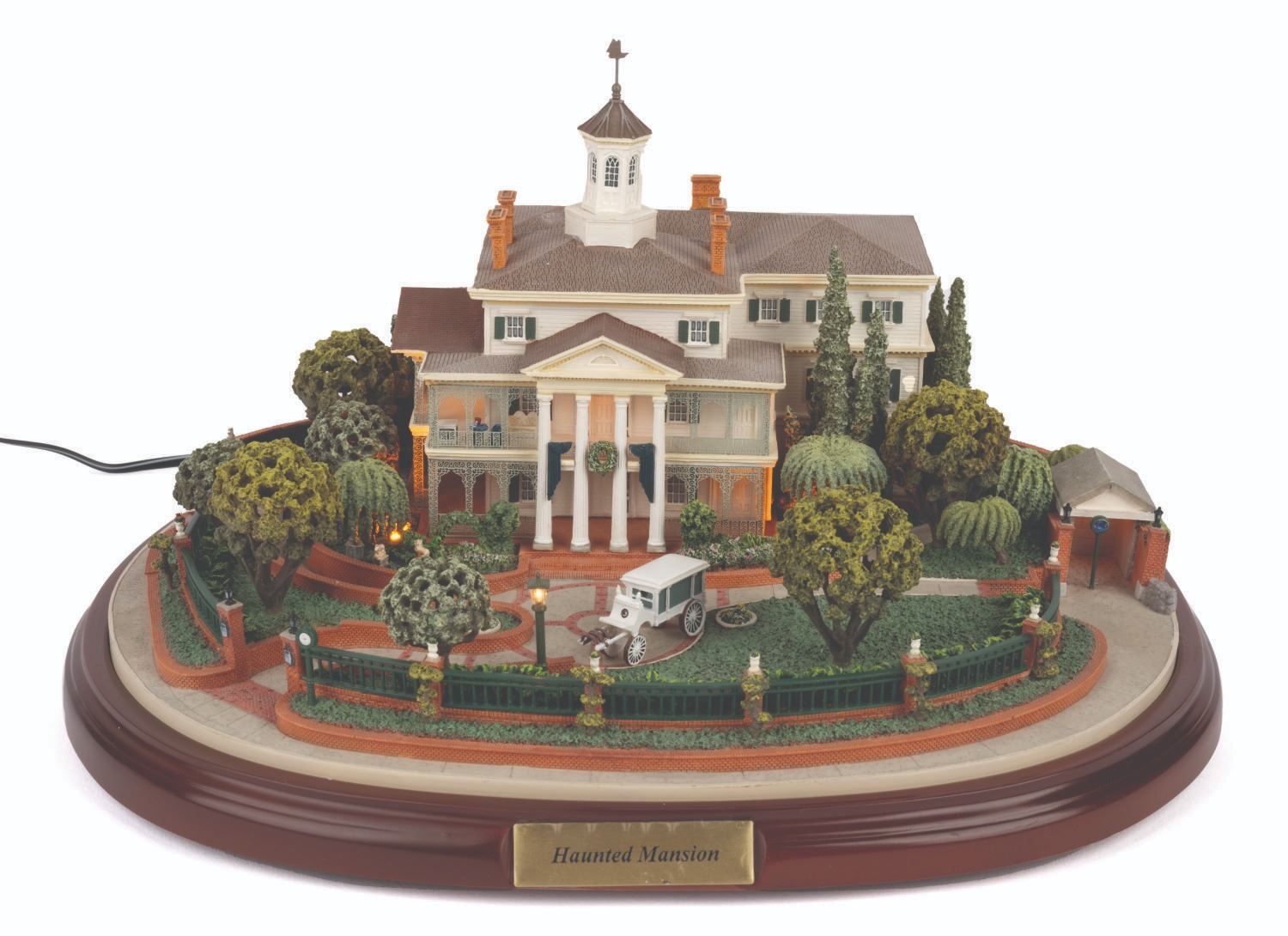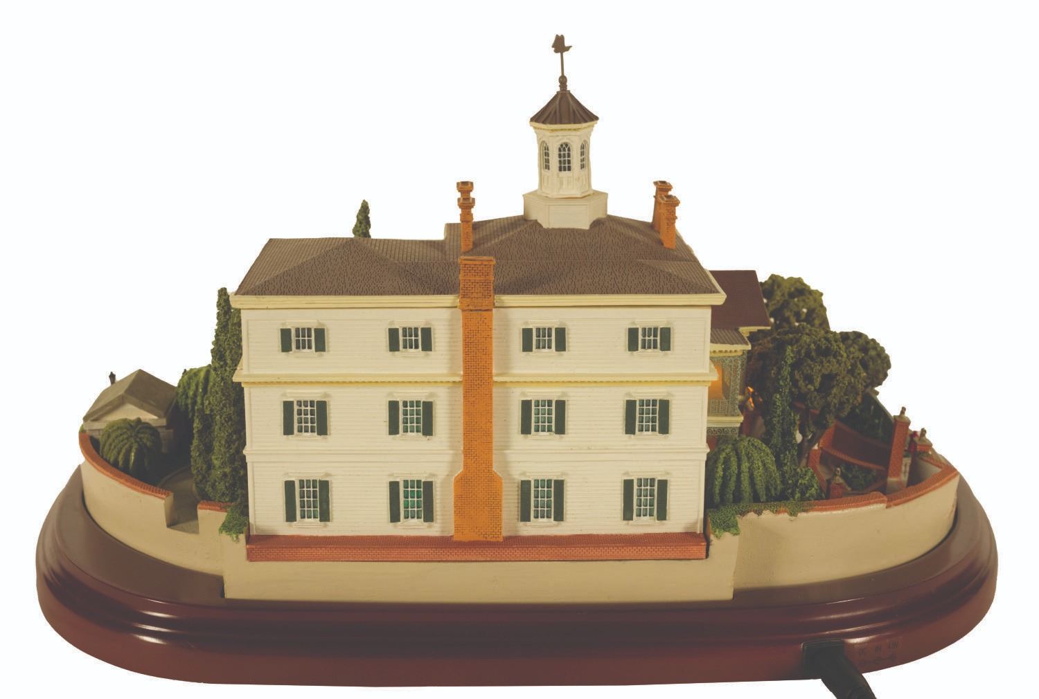 (Disneyland, 2006) An incredible model of Disneyland's Haunted Mansion created by famed miniaturist Robert Olszewski. This intricate model opens in the back to hold one of  (3) interchangeable scenes included that are based on the attraction interiors:  the Gallery, Ballroom, and Graveyard with the three iconic Hitchhiking Ghosts. The model has LED lighting and some movable parts, and the scenes light up when placed in the model. Measuring 12.5" wide, 5" deep, and 10.5" tall. The condition is very good with little wear and the model comes in its original box.