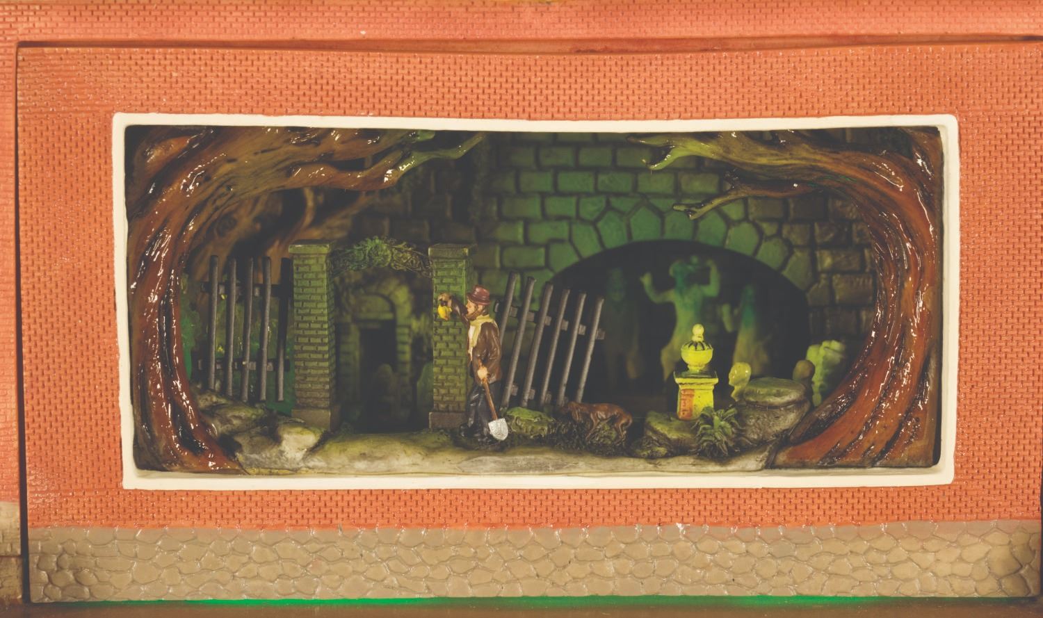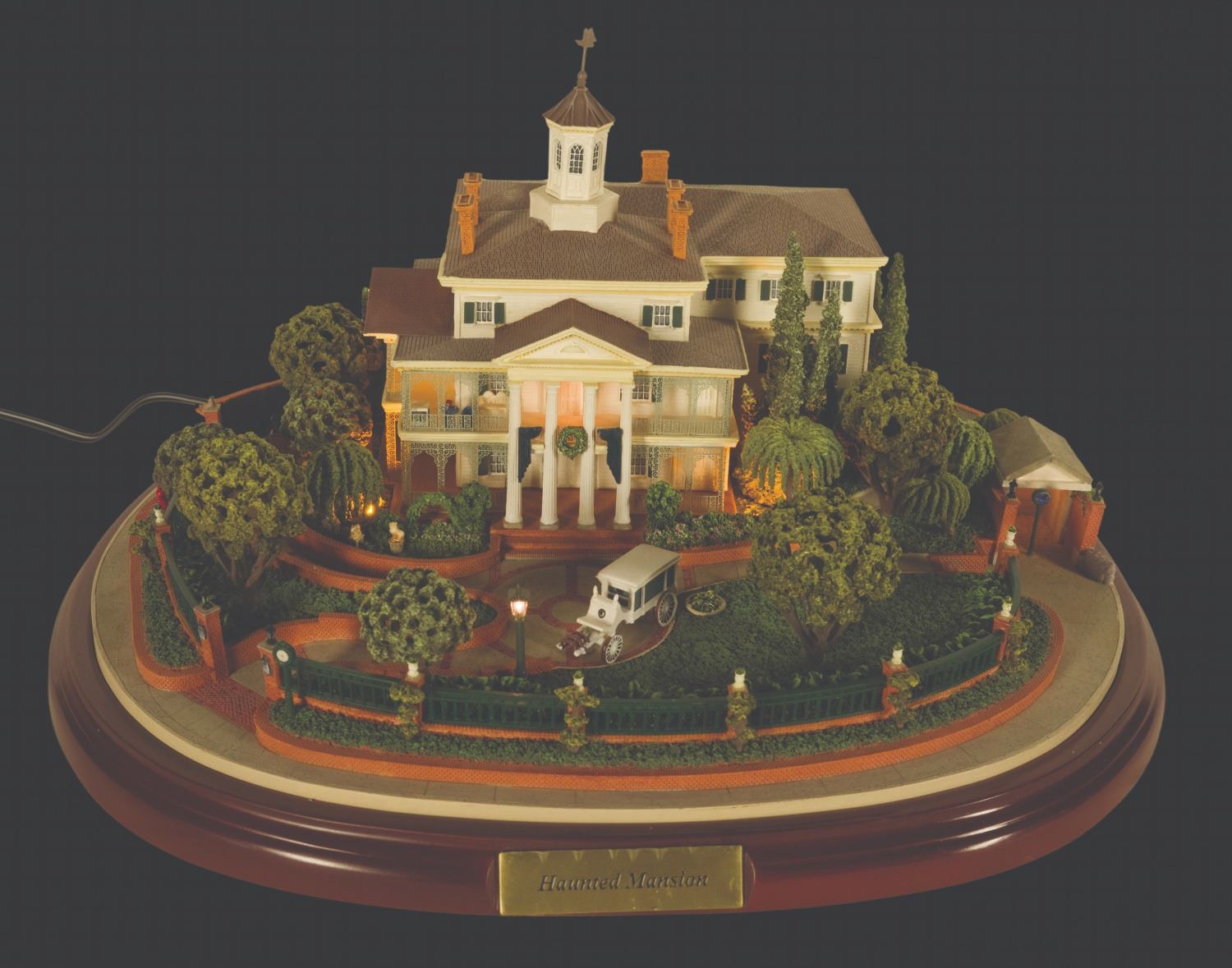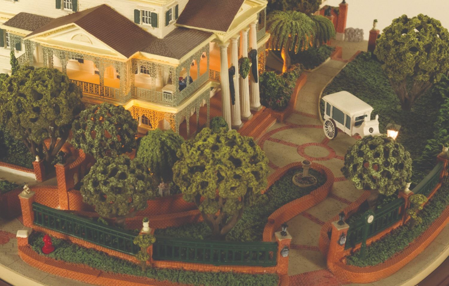 (Disneyland, 2006) An incredible model of Disneyland's Haunted Mansion created by famed miniaturist Robert Olszewski. This intricate model opens in the back to hold one of  (3) interchangeable scenes included that are based on the attraction interiors:  the Gallery, Ballroom, and Graveyard with the three iconic Hitchhiking Ghosts. The model has LED lighting and some movable parts, and the scenes light up when placed in the model. Measuring 12.5" wide, 5" deep, and 10.5" tall. The condition is very good with little wear and the model comes in its original box.