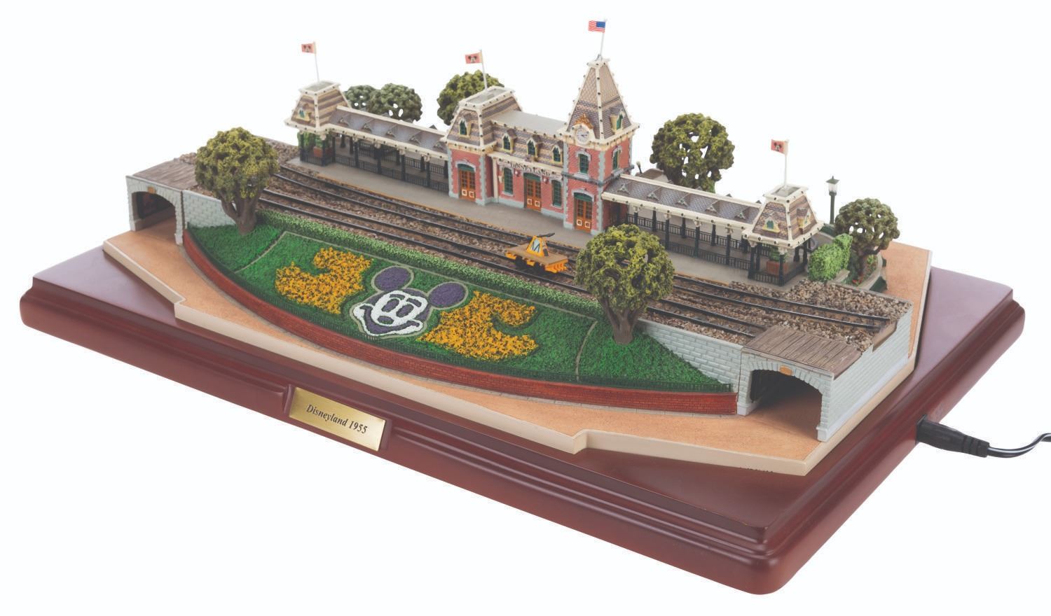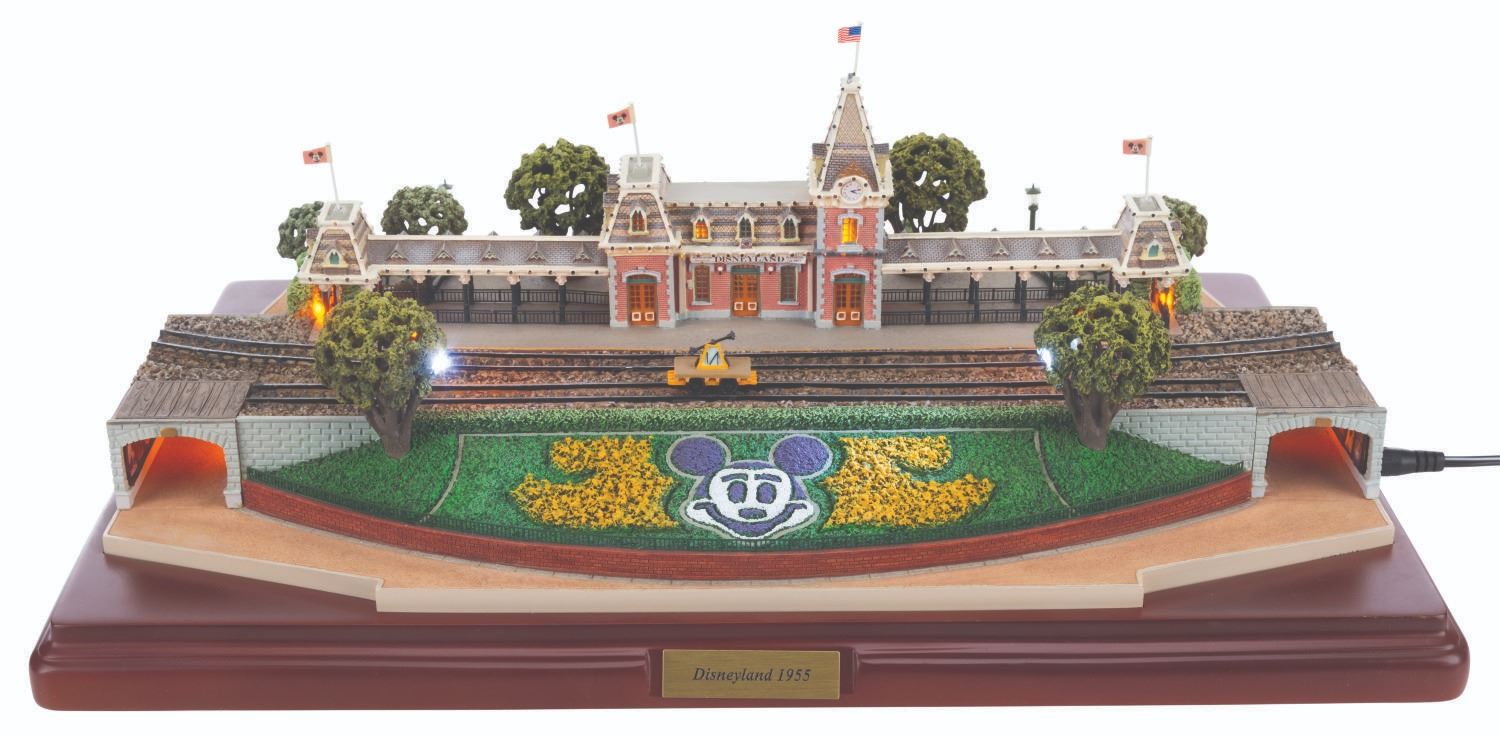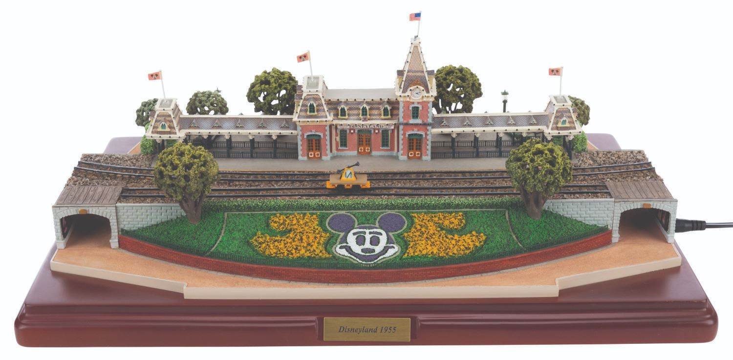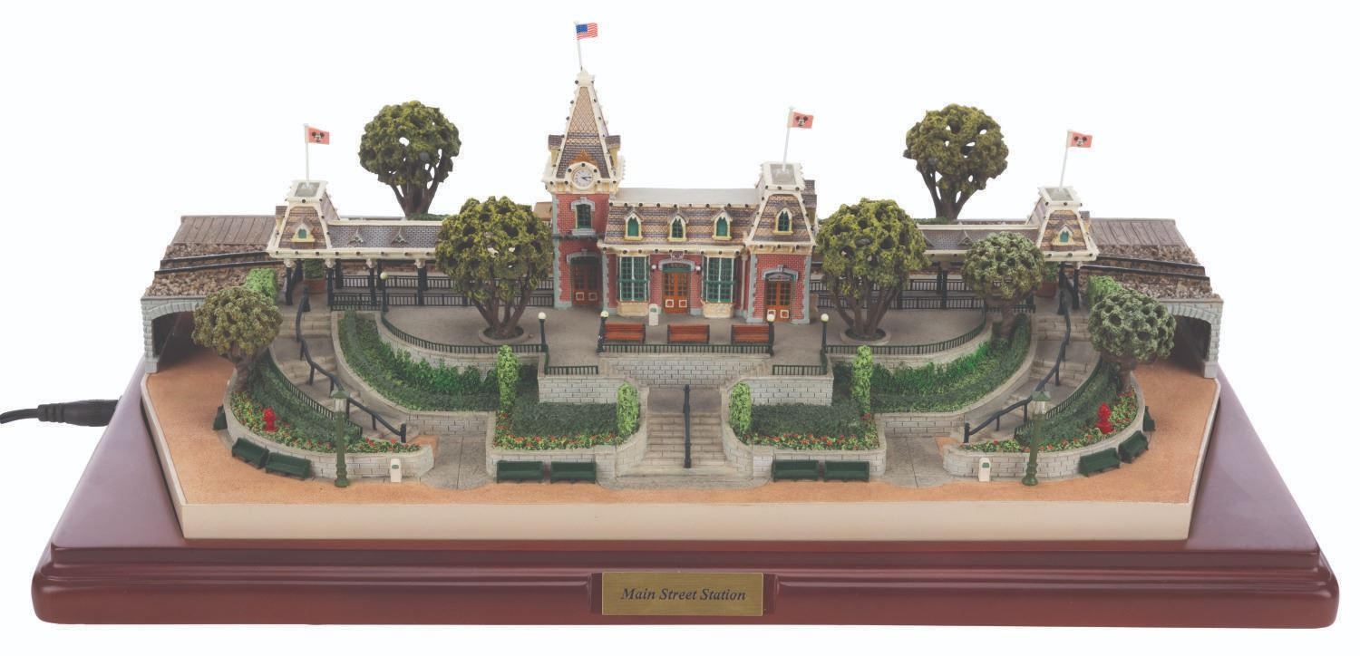 (Disney, 2005) A first edition Main Street Station from the Olszewski Disneyland Main Street, U.S.A. Collection. Accomplished in resin, the scale model by the renowned miniaturist has a wooden base. brass plaque, and comes with three Mickey Mouse flags and one American flag. When a fire hydrant is pressed, the station exhibits a warm glow. The light functions worked when tested, requiring the included adapter or three AA batteries (not included). Measuring 9.75” x 14.25” x 4.25” tall with its 12.5” x 17” x 7.5” tall original box, the piece is in very good condition with light wear, including a slightly-bent lamppost.