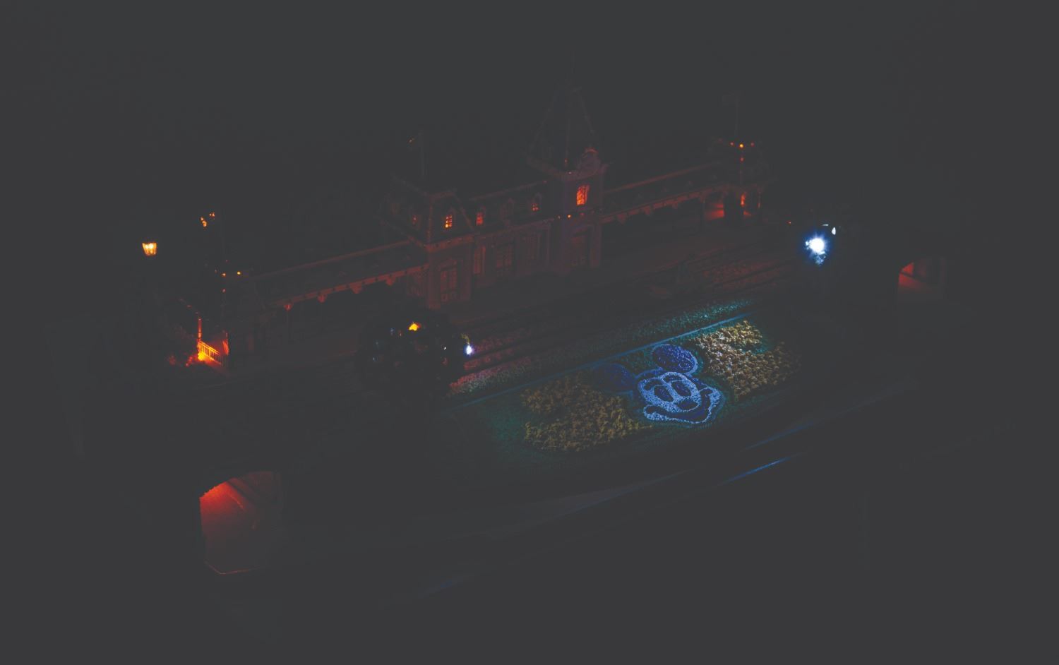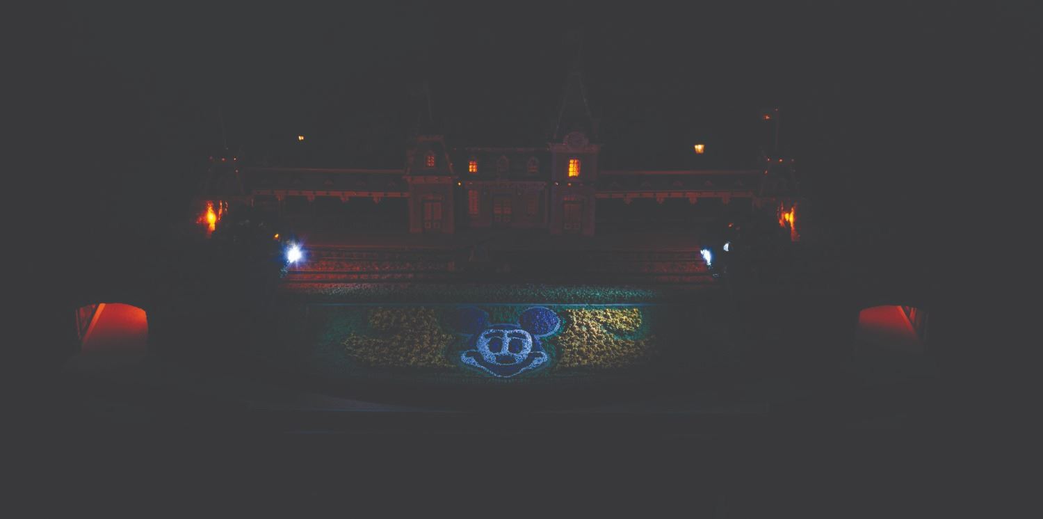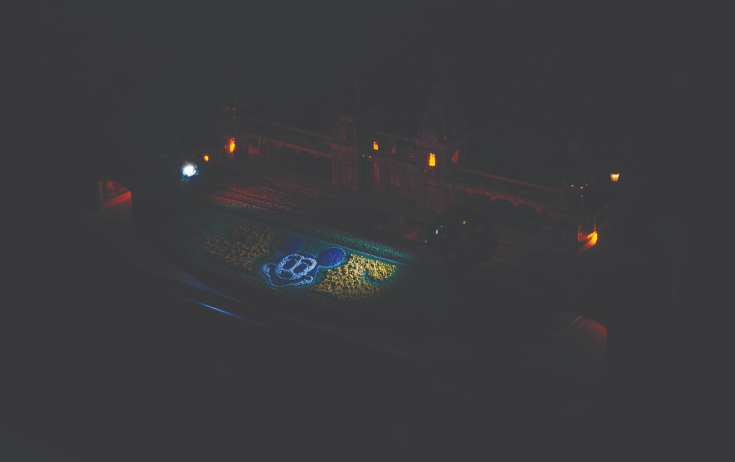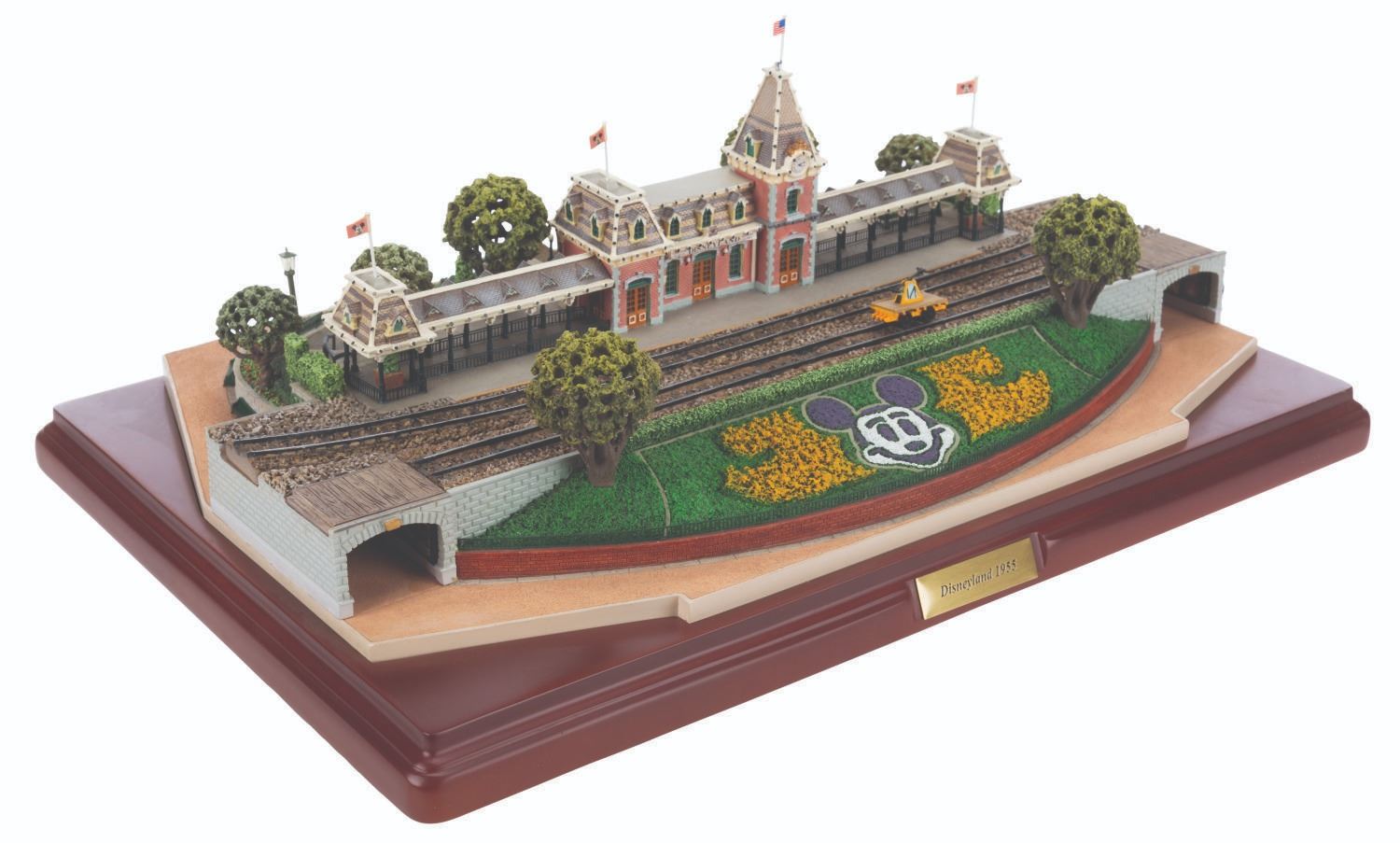 (Disney, 2005) A first edition Main Street Station from the Olszewski Disneyland Main Street, U.S.A. Collection. Accomplished in resin, the scale model by the renowned miniaturist has a wooden base. brass plaque, and comes with three Mickey Mouse flags and one American flag. When a fire hydrant is pressed, the station exhibits a warm glow. The light functions worked when tested, requiring the included adapter or three AA batteries (not included). Measuring 9.75” x 14.25” x 4.25” tall with its 12.5” x 17” x 7.5” tall original box, the piece is in very good condition with light wear, including a slightly-bent lamppost.