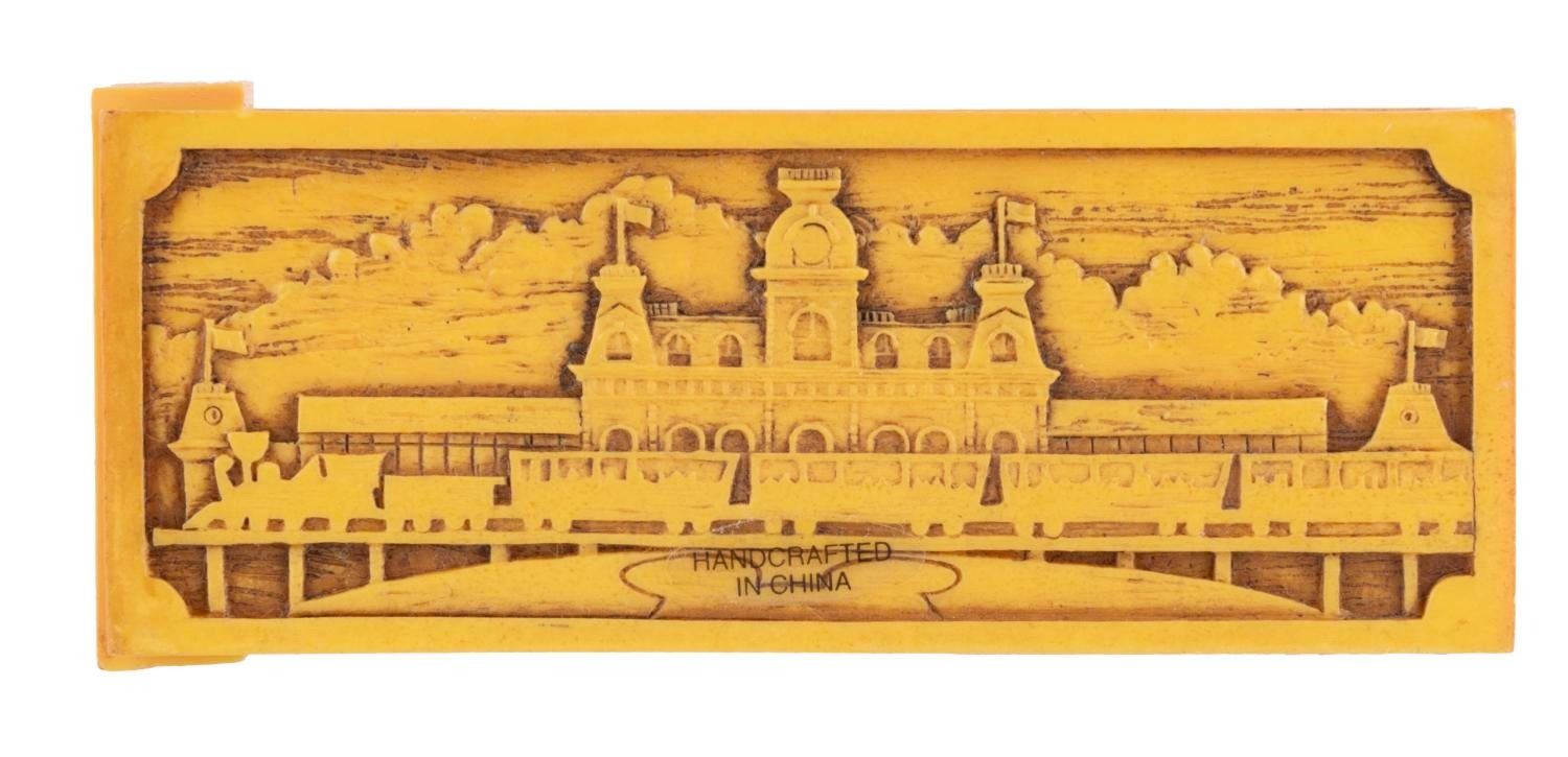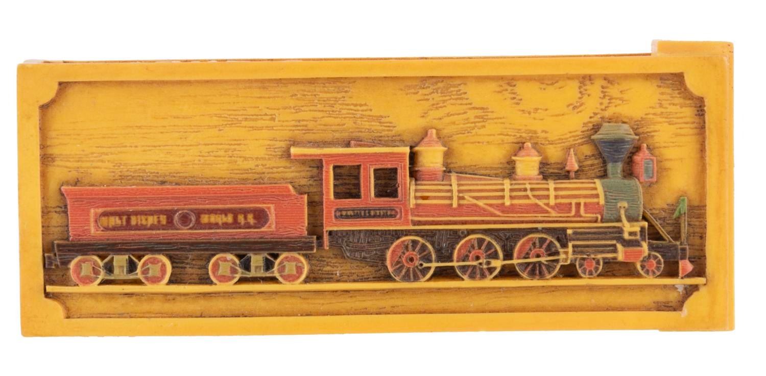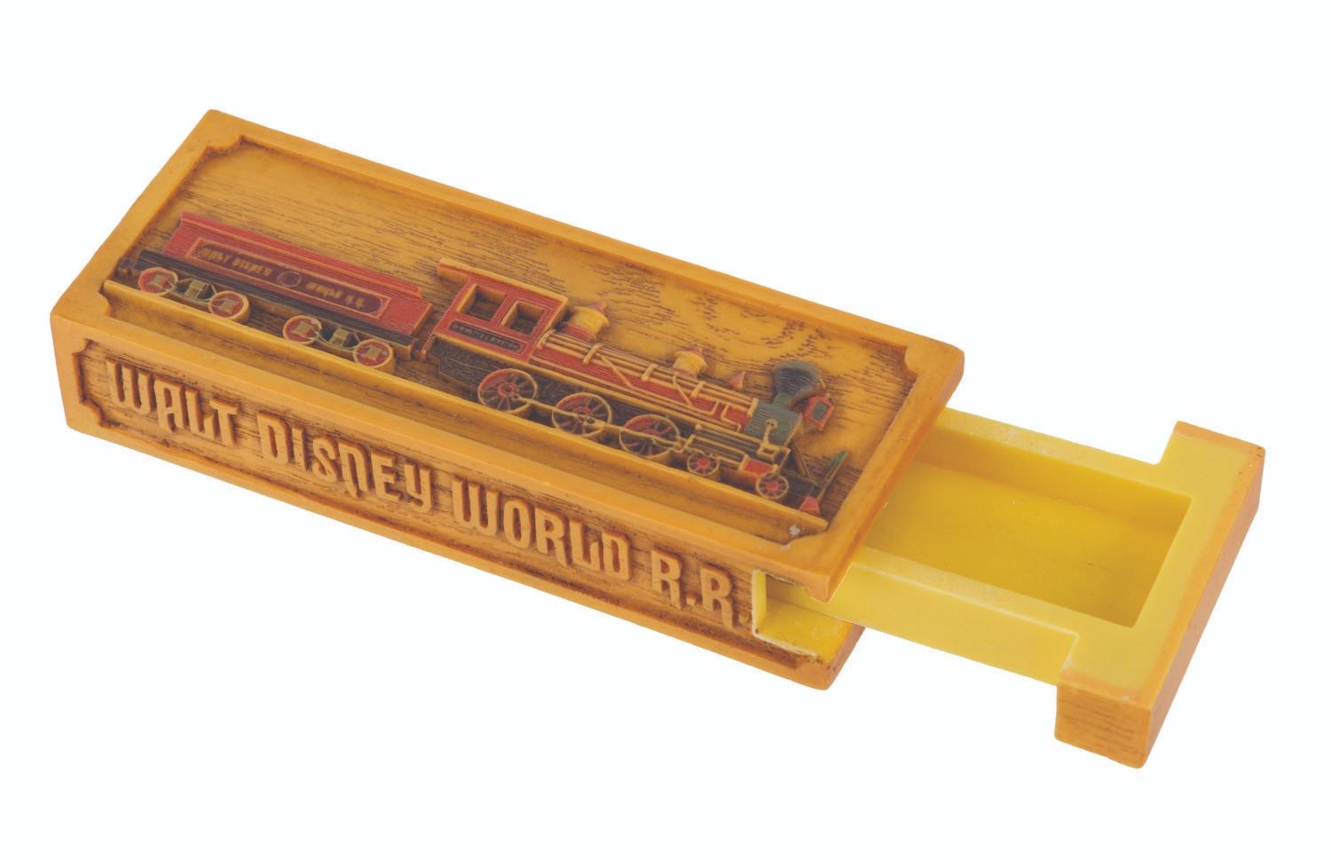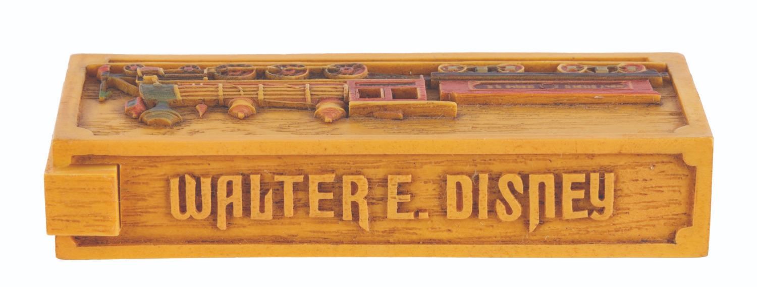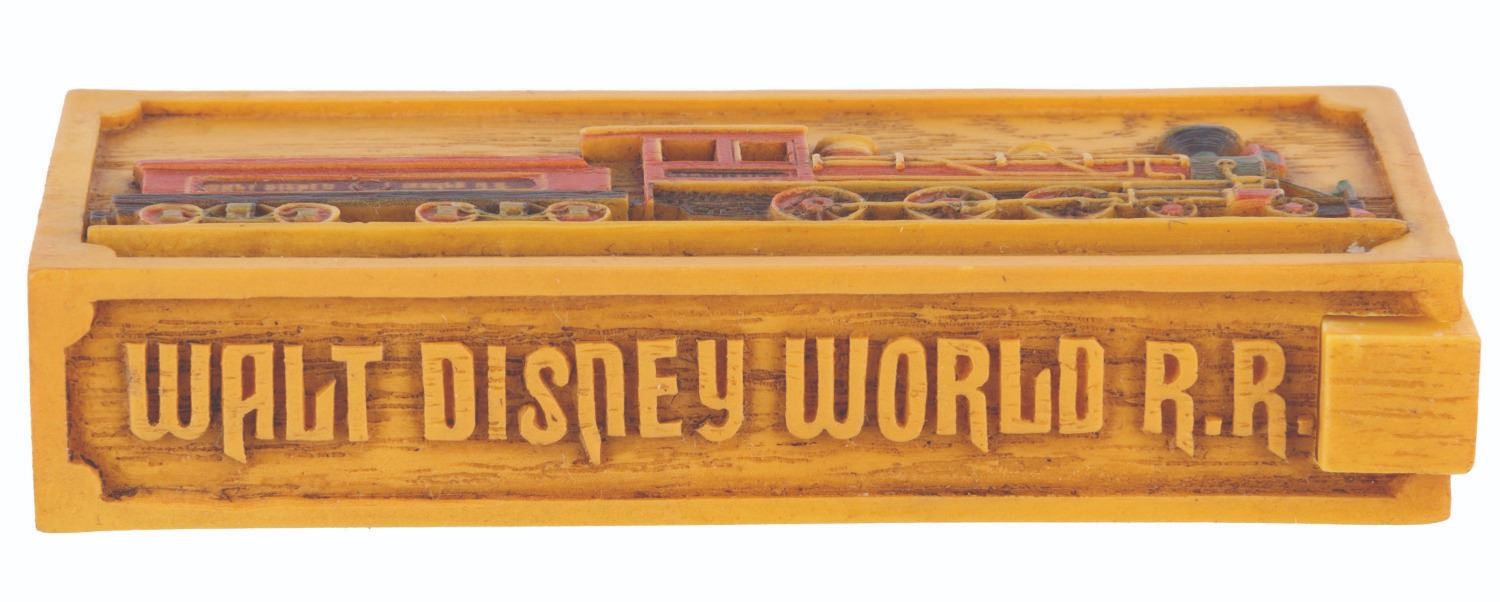 (Disney, 2000s) A Walter E. Disney train Pokitpal trinket box designed by Olszewski. The box features a relief of the Walter E. Disney locomotive and Main Street Station at Walt Disney World. Measuring 1.25” x 3.25”, the Pokitpal trinket box is in fine condition.