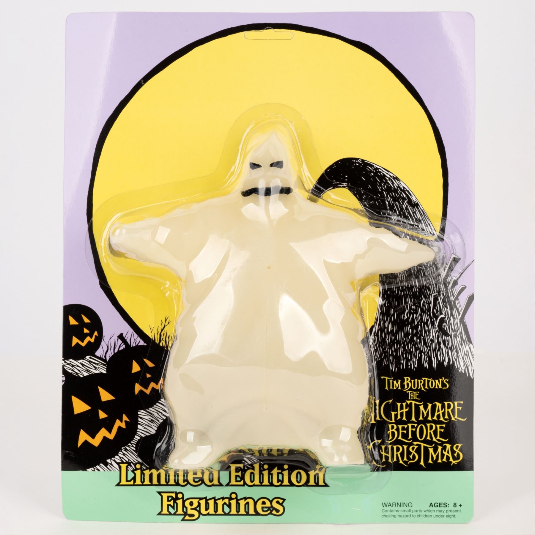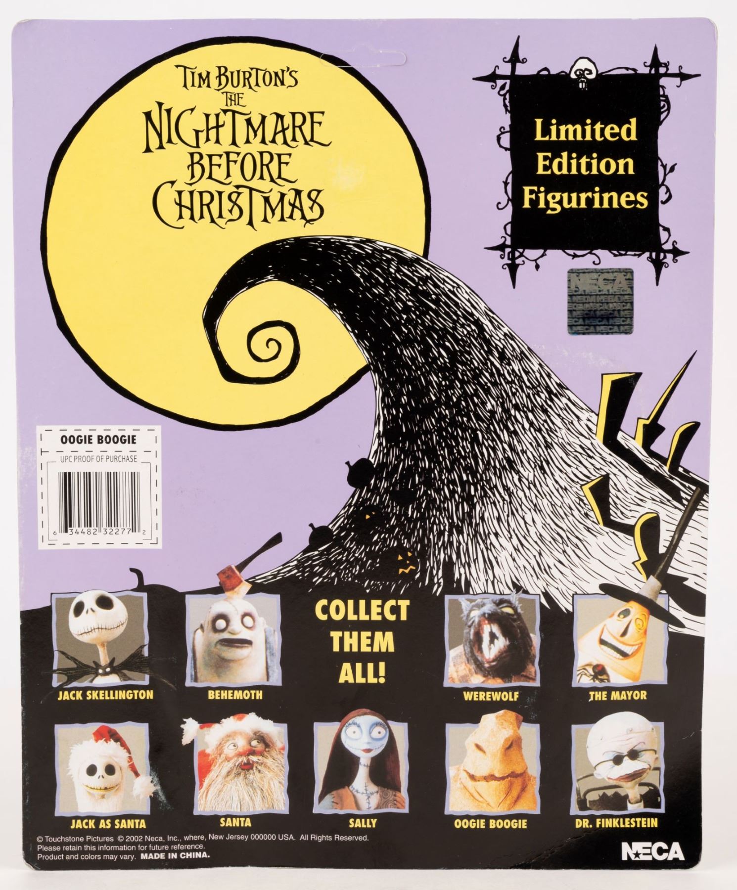 (NECA, 1990s-2000s) An action figure of Oogie Boogie from “Tim Burton’s The Nightmare Before Christmas.” The glow-in-the-dark action figure was released in an unnumbered edition of 5000. Measuring 7.5" x 3.5" and 8" tall, the figurine is in fine condition sealed within the original 10.5" x 3.5" x 13" packaging.