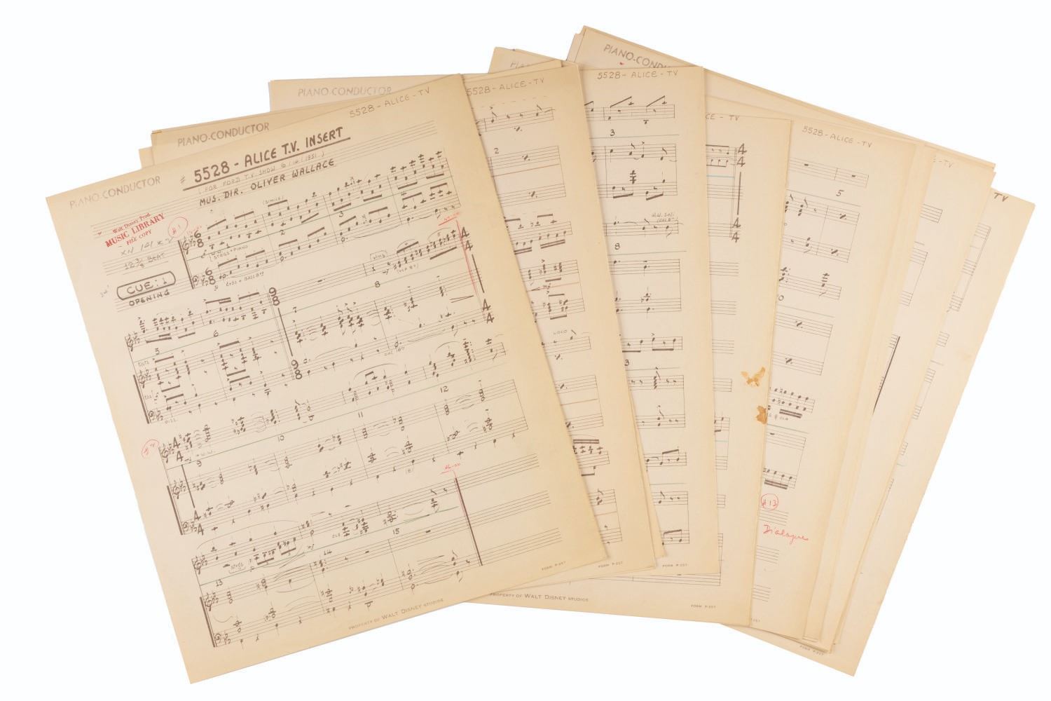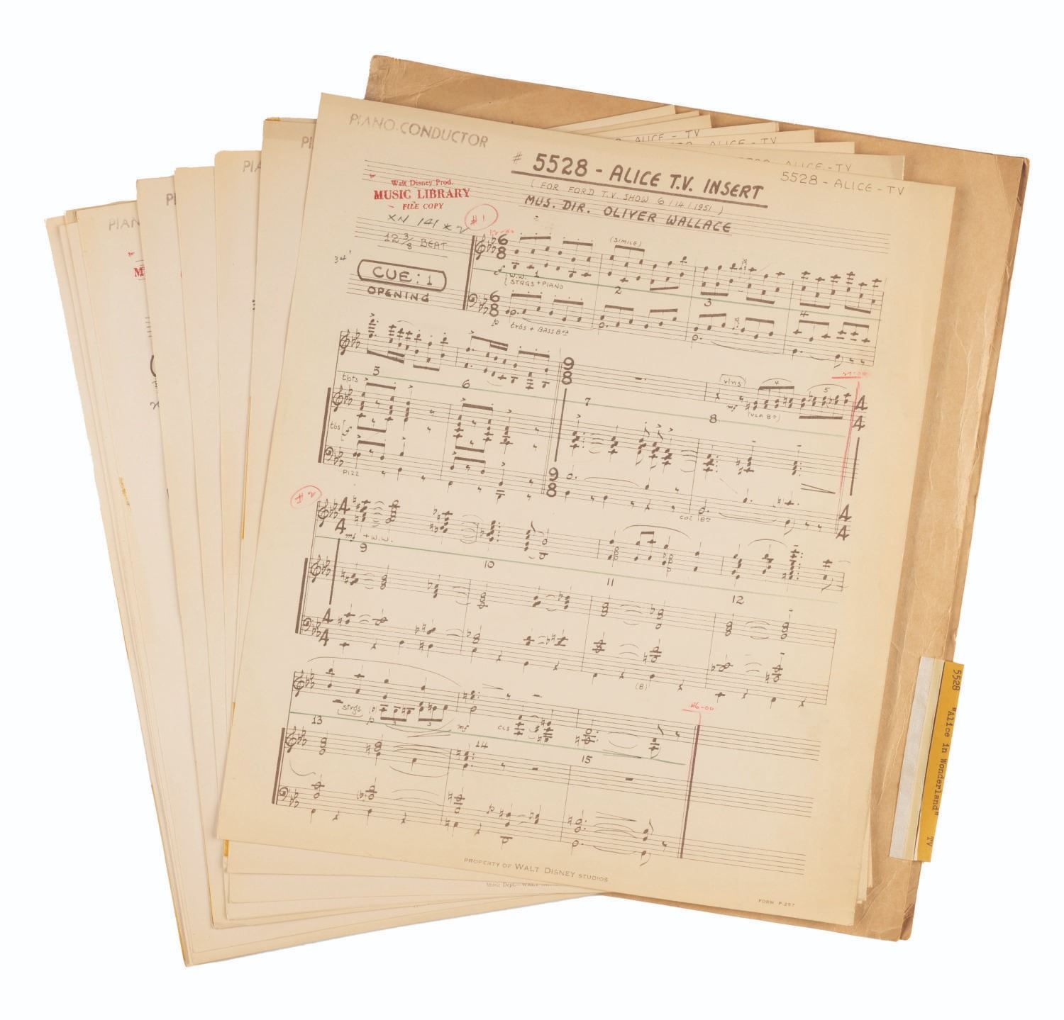 (Disney, 1951) A set of sheet music for “Operation Wonderland,” which aired during the “Ford Star Revue” on June 14, 1951. This documentary featurette provided a behind-the-scenes look at the making of “Alice in Wonderland.” Measuring 12” x 14”, the sheet music for the score is in very good condition with discoloration from age, light creases, production notations, and wear from use.