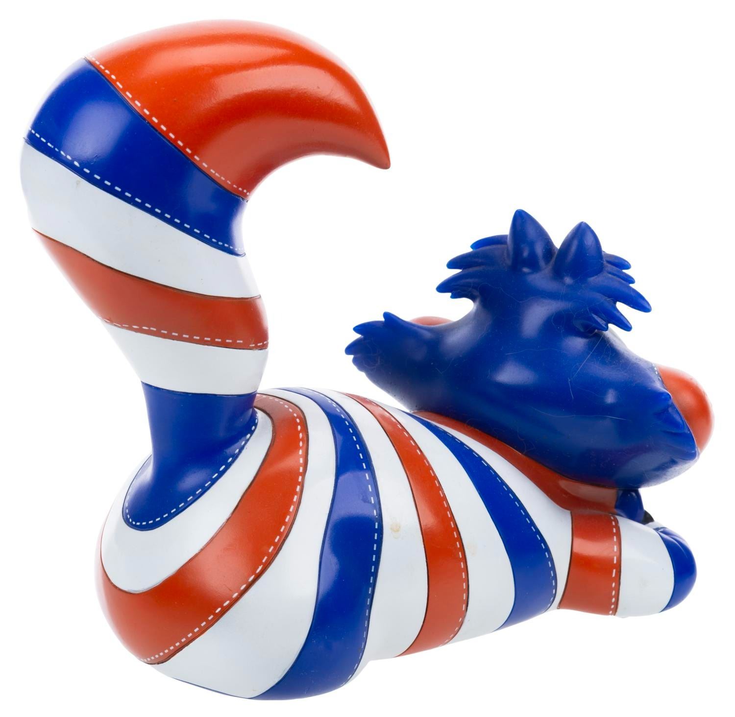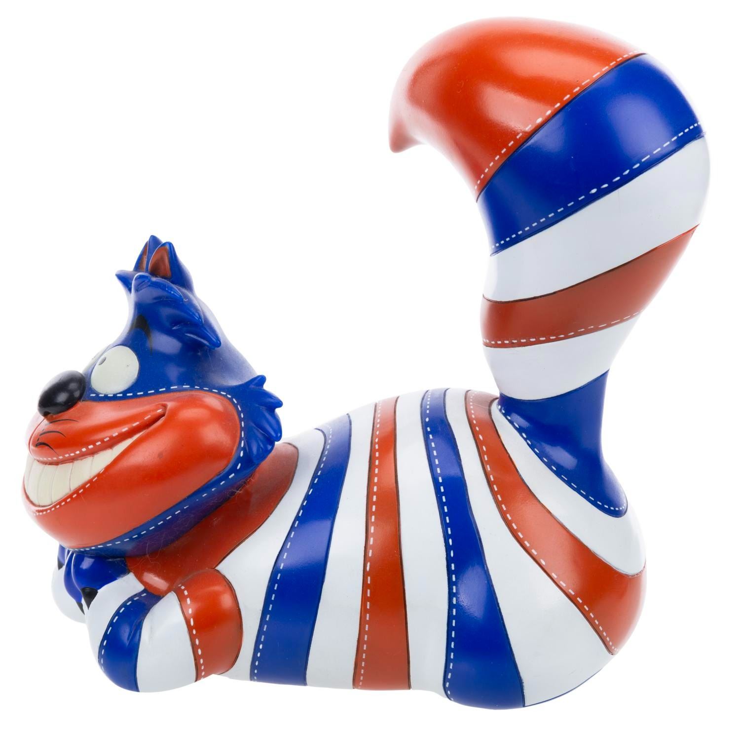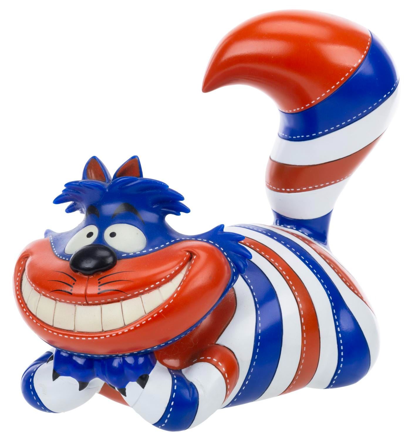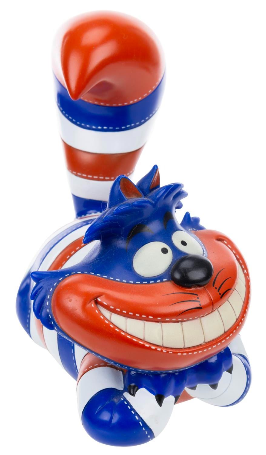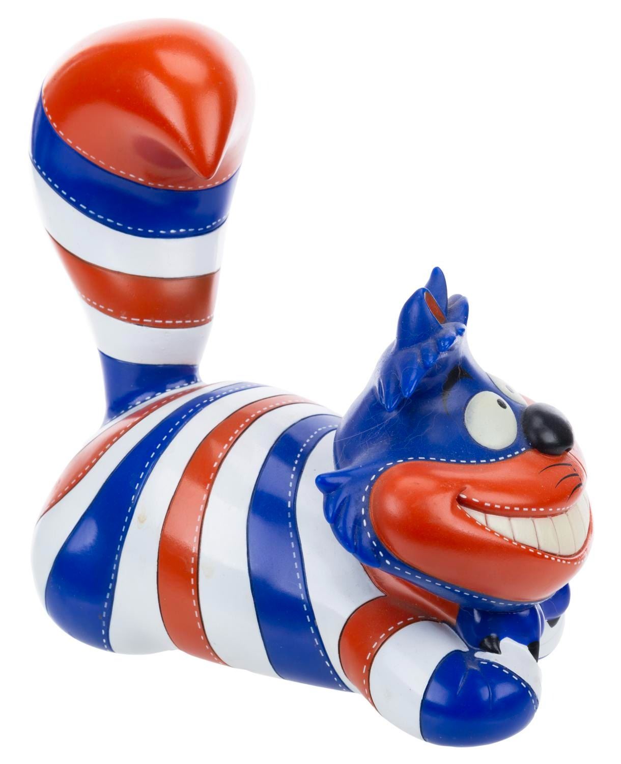 (Disney, 2007) A Cheshire Cat vinyl figure sculpted by Monster5 and manufactured by Span of Sunset. This variation on the "Alice in Wonderland" cat, released in a limited edition of 500, was inspired by Hip Hop. Measuring 7.75" x 7.75", the vinyl figure is in good condition with light stains, soiling, and discoloration.