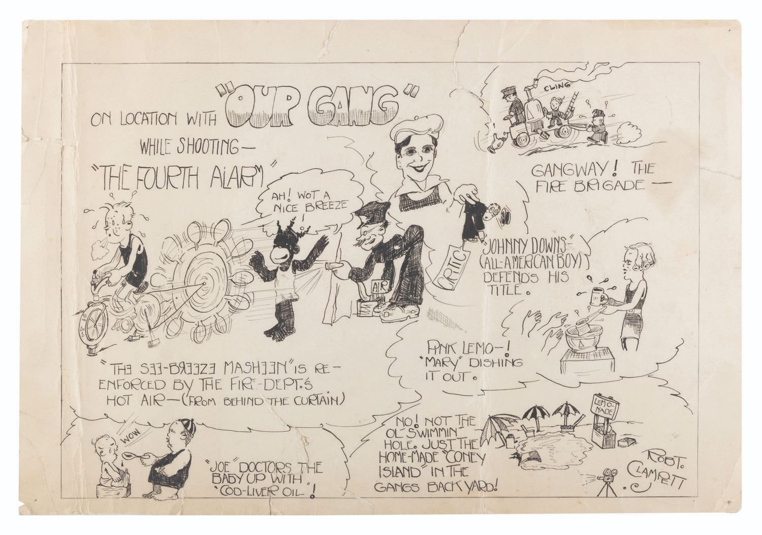 (Clampett, 1926) In 1926 Clampett’s father arranged for and took his 13-year-old son to visit the set of "Our Gang" during production of "The Fourth Alarm." When he returned home, Clampett created this "drawn diary" of the day. Throughout his life, he would continue to create visual diaries of his daily adventures documenting his career as an artist and animator. Measuring 17.5" x 12" the artwork is in good condition with some staining from age, creasing, and two 2.5" tears at the bottom left and upper right. Overall, the piece presents very well.