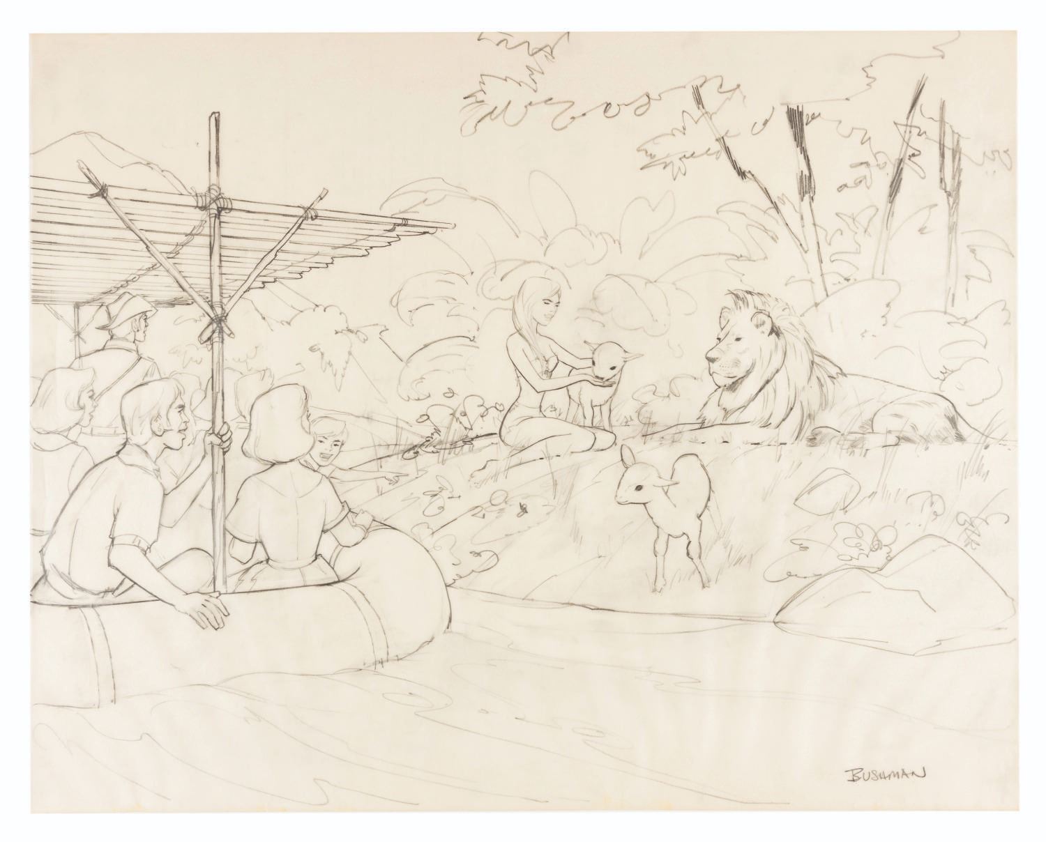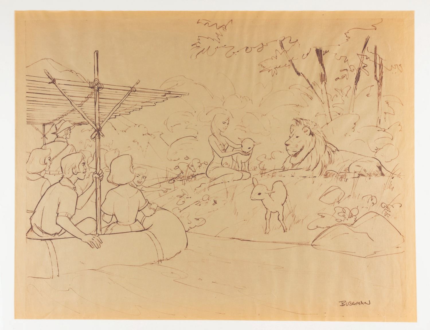 (Marine World Africa U.S.A., 1972) An original theme park concept drawing by Bruce Bushman for Marine World Africa U.S.A. Bushman, well-known for his early concepts for Disneyland, created this depiction of a Jungle Cruise-style ride where guests observe a trainer with a lion and lambs. Measuring 19" x 24", the original art accomplished in pencil on transparent paper is in very good condition with light wear from production use, handling, and age. The 19" x 24"brown line print is in very good condition with light handling wear.