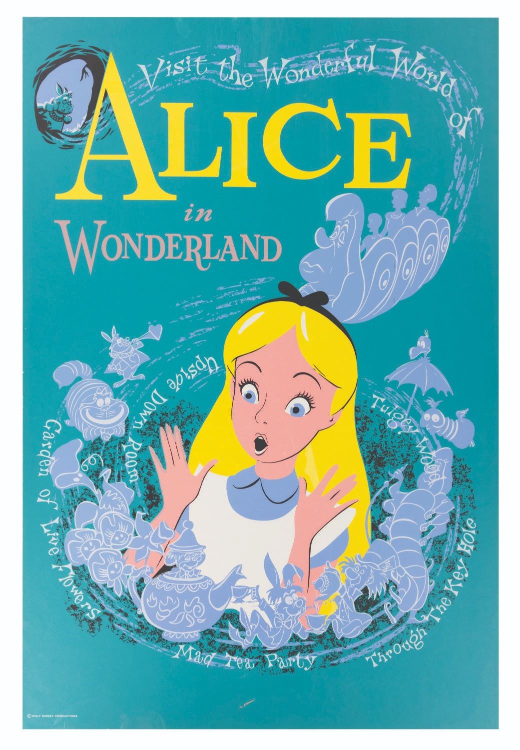 (Disneyland, 1958) An original hand-silkscreened poster for the Alice in Wonderland attraction at Disneyland. Designed by Imagineer Sam McKim, the poster features the popular image of Alice down the rabbit hole with the denizens of Wonderland. Measuring 54"x36", the piece is in very good condition with minor edge wear, including a couple of small tears.