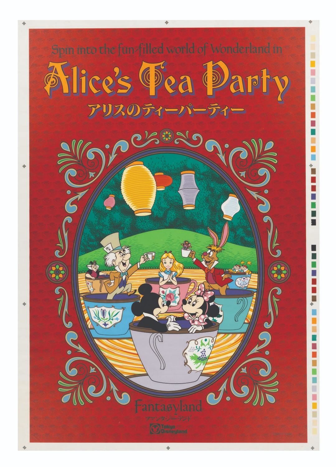 (Tokyo Disneyland, 1985) An original artist's proof attraction poster for Alice's Tea Party in Tokyo Disneyland's Fantasyland. Designed by John Drury and Greg Paul, this silk screened poster retains its registration marks within the borders and a color guide in the right margin. It is hand numbered at lower right, "AP/10." Measuring 47"x33", this piece is in very good condition exhibiting creases, mostly within its borders.